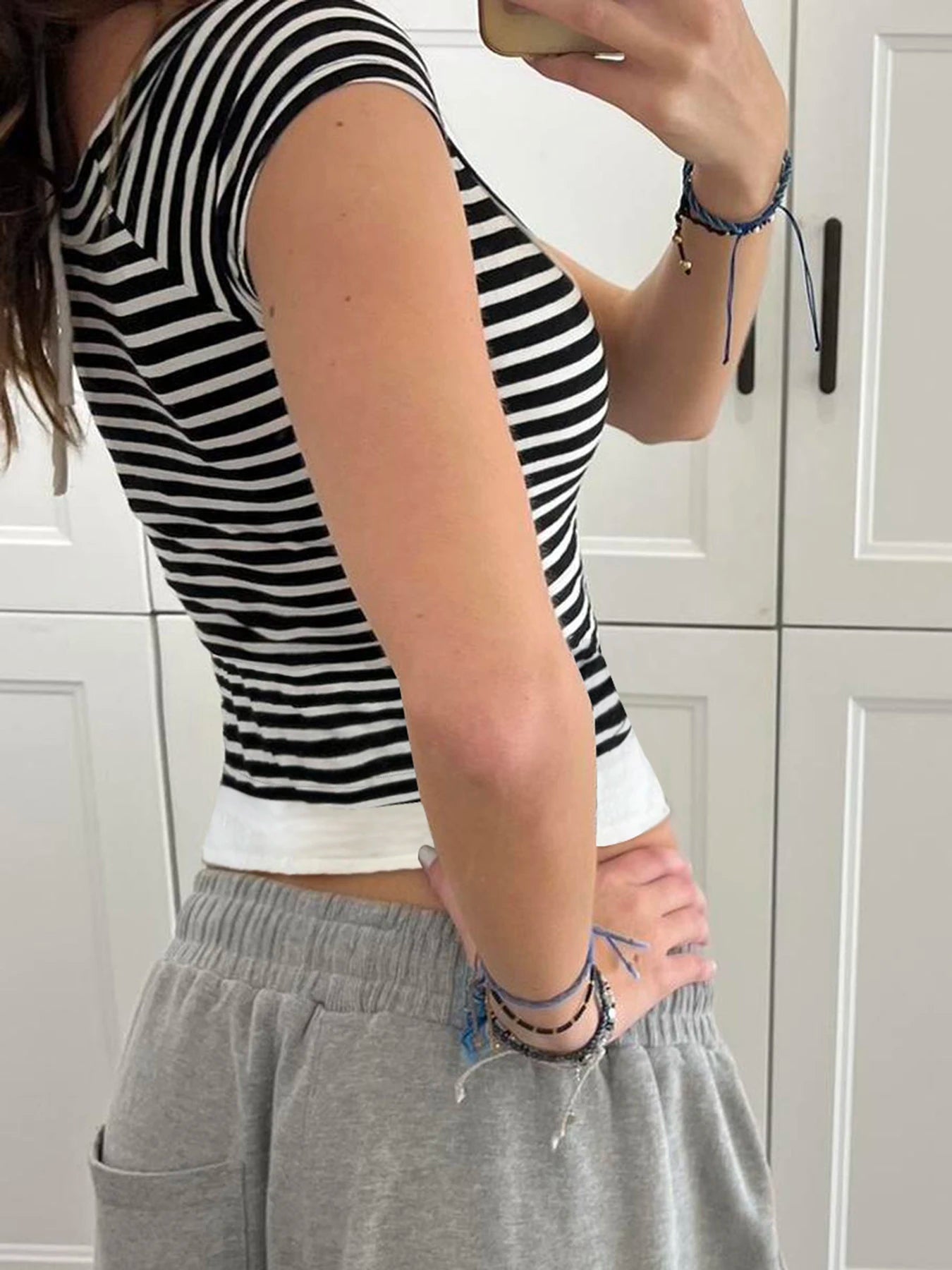 Cyflymder Casual Patchwork Striped T Shirt Fake 2 Piece Basic Halter O-Neck Short Sleeve Tees Women 2025 Summer Fashion Streetwear