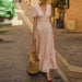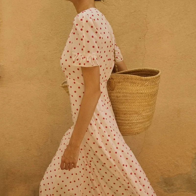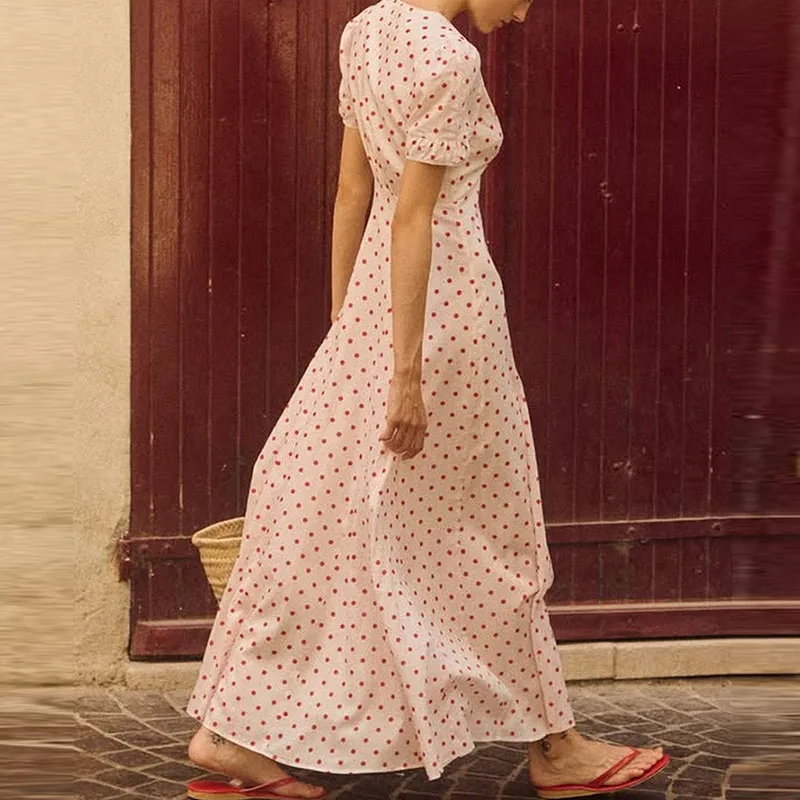 Cyflymder Casual Short Sleeve High Waist Swing Dress French Style Seaside Vacation Maxi Dress Fashion Polka Dot Print V-neck Evening Dress