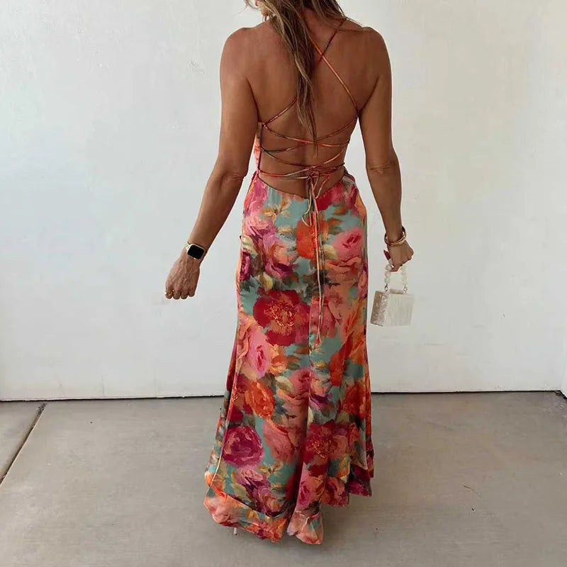 Cyflymder Casual Sleeveless Backless Tie Up Dress Summer New Low Cut Pleated Evening Dress Fashion Hot Girl Irregular Floral Printed Dress