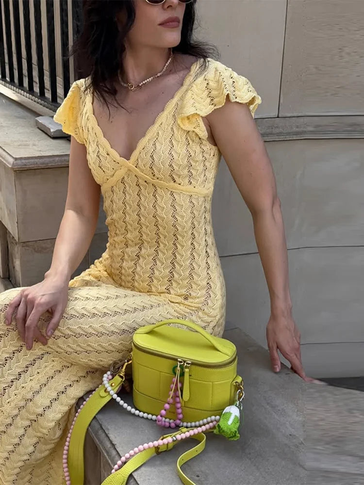 Cyflymder Chic V-Neck Knitted Lace Long Dress Woman Hollowed Out Short Sleeves Slim Robes Solid Color Casual Elegant Women's Long Dresses