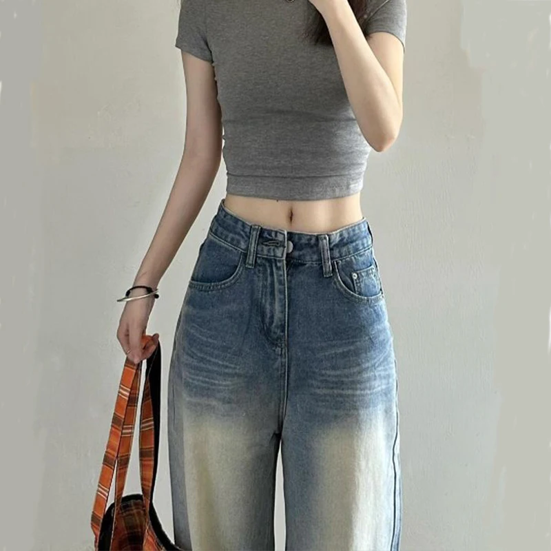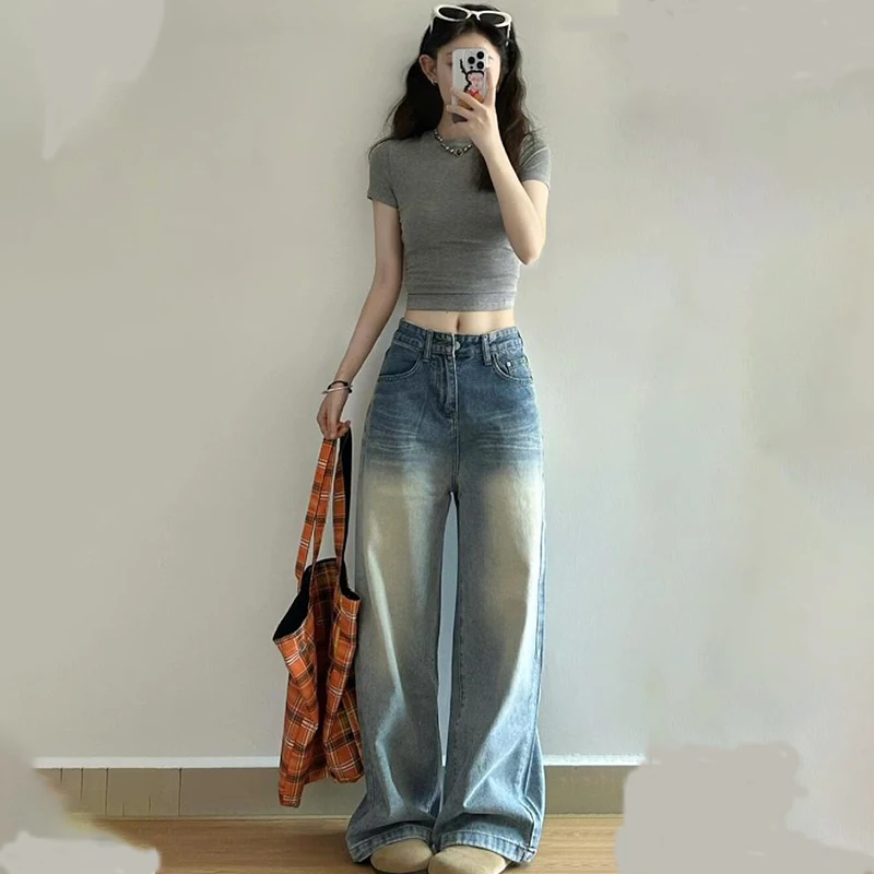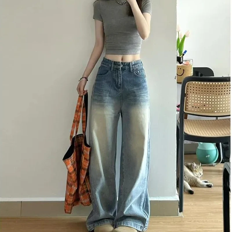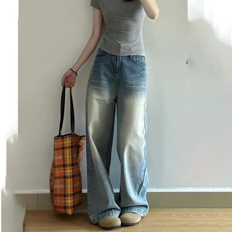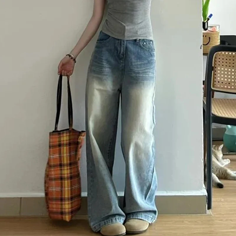 Cyflymder Chic Washed Scratched Wide Leg Jeans Women Vintage Distress Light Blue Straight Denim Trouser Niche Style High Waist Loose Pants