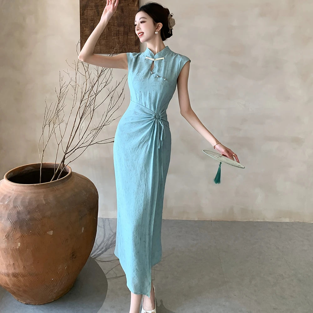 Cyflymder Chinese Style Thin Dress Women Spring and Summer Stand Collar Cheongsam Slim Fit Dress Fashion Female Clothes