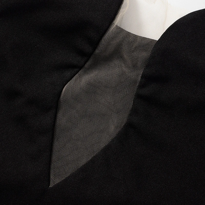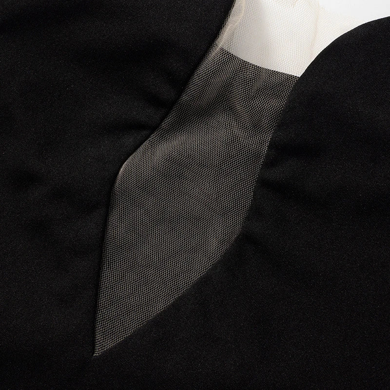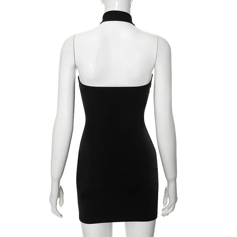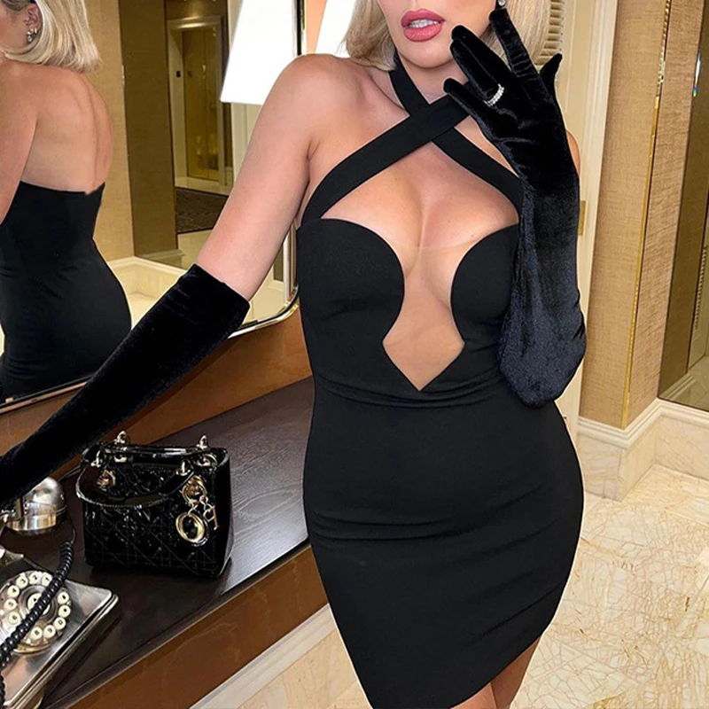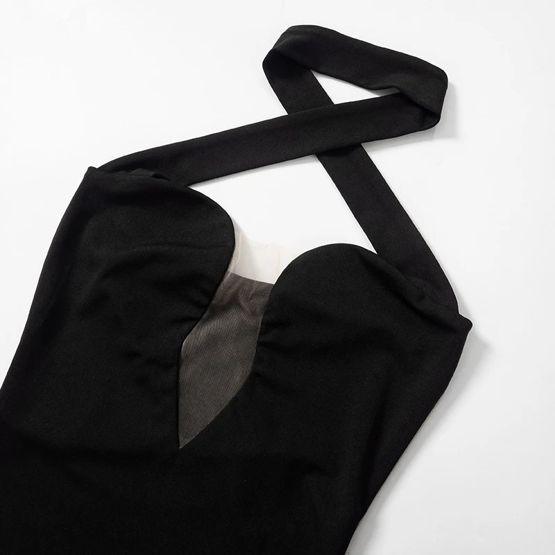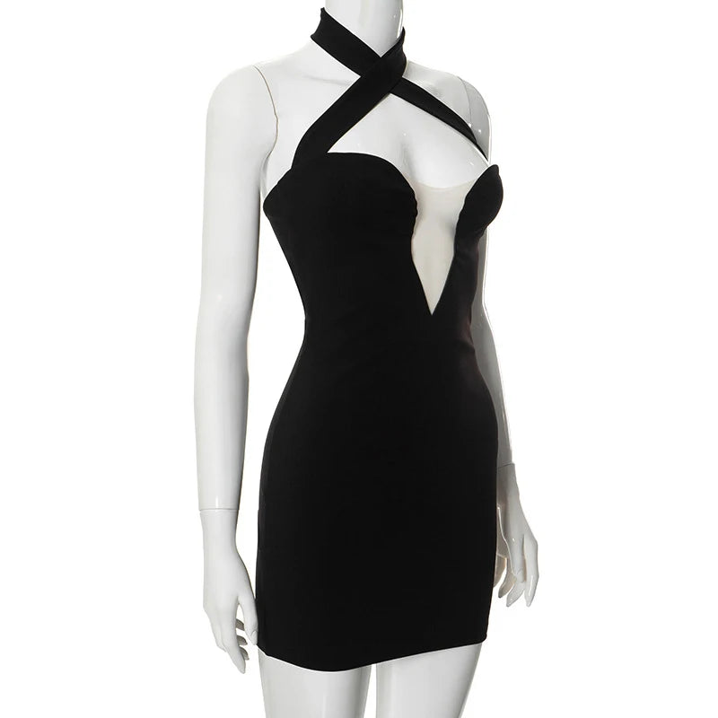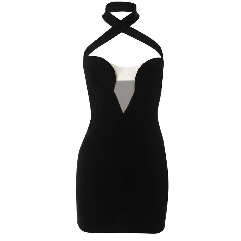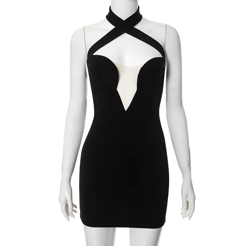 Cyflymder Classic Black Slimming Cross Halter Neck Hollow Mesh Patchwork Bodycon High-waist Open Back Wrap Hips Mini Dress Party Wear