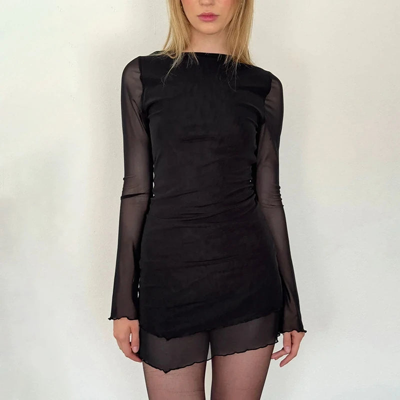 Cyflymder Coquette Mesh Sheer Mini Dress Casual Long Sleeve Backless Party Mini Dress Beach Cocktail Club Vintage Streetwear