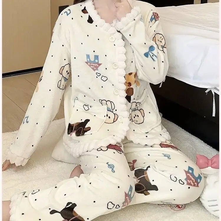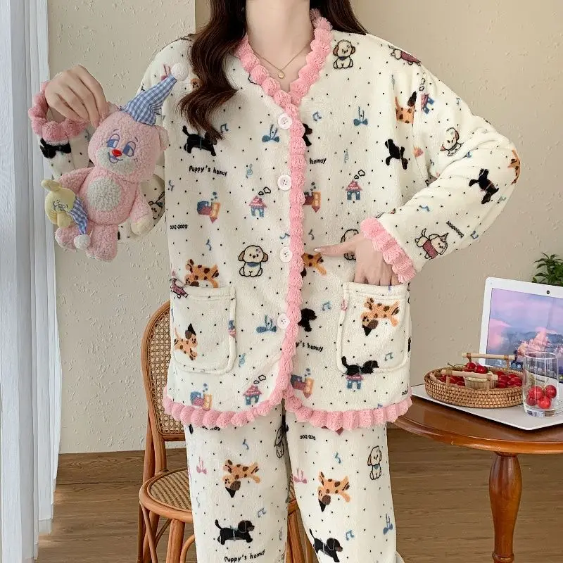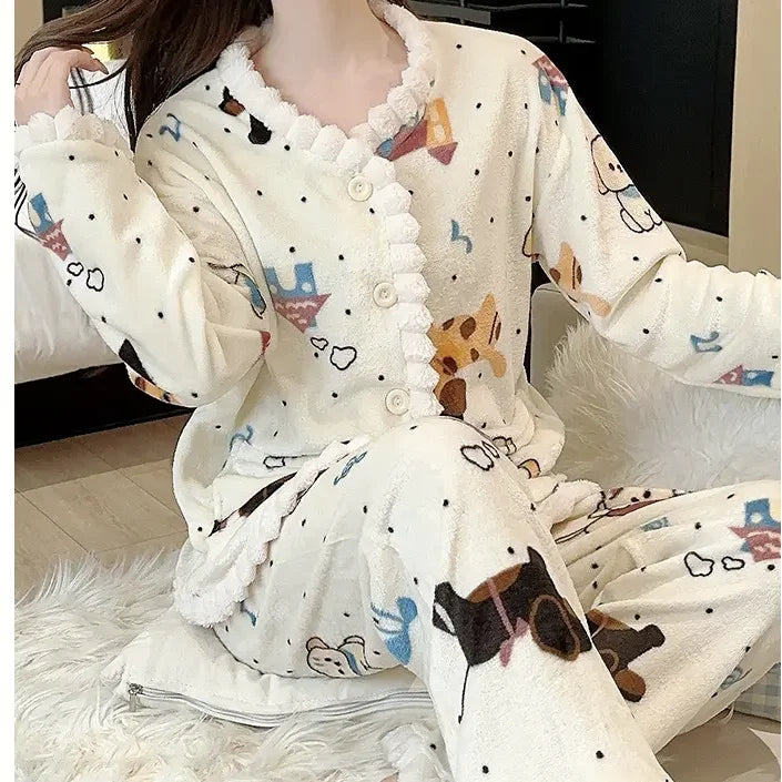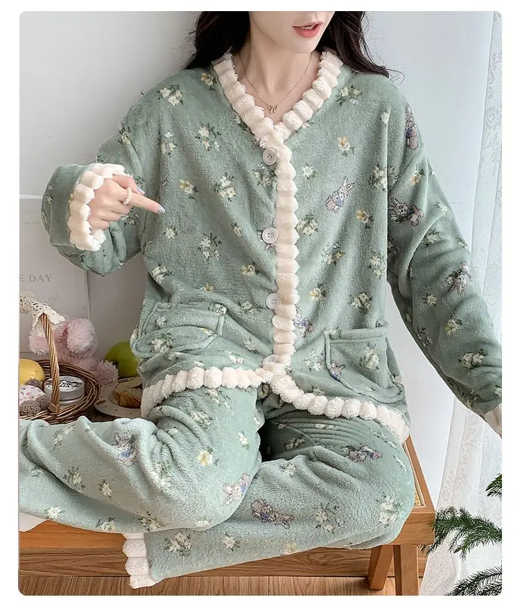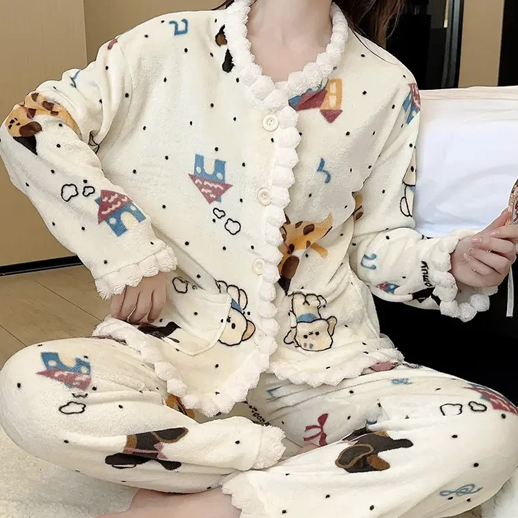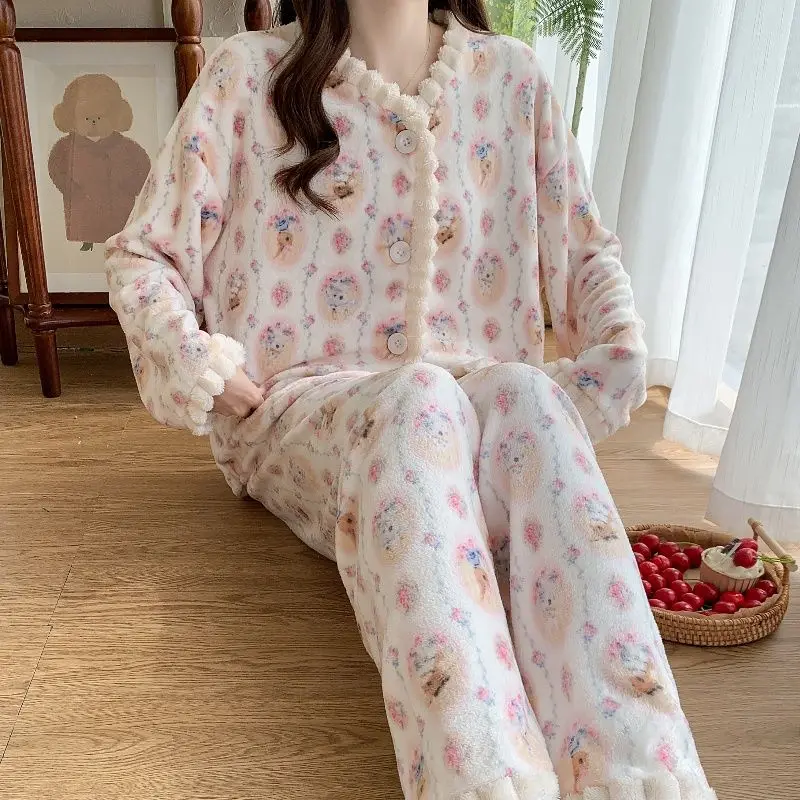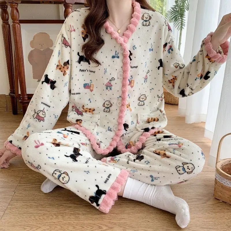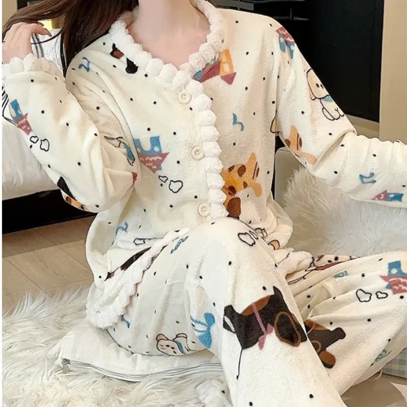 Cyflymder Coral Fleece Pajamas Women Autumn Winter Print Thickened Plush Sleepwear Cardigan Suit Warm Soft Homewear Long Sleeves Pajamas