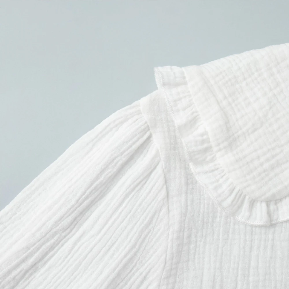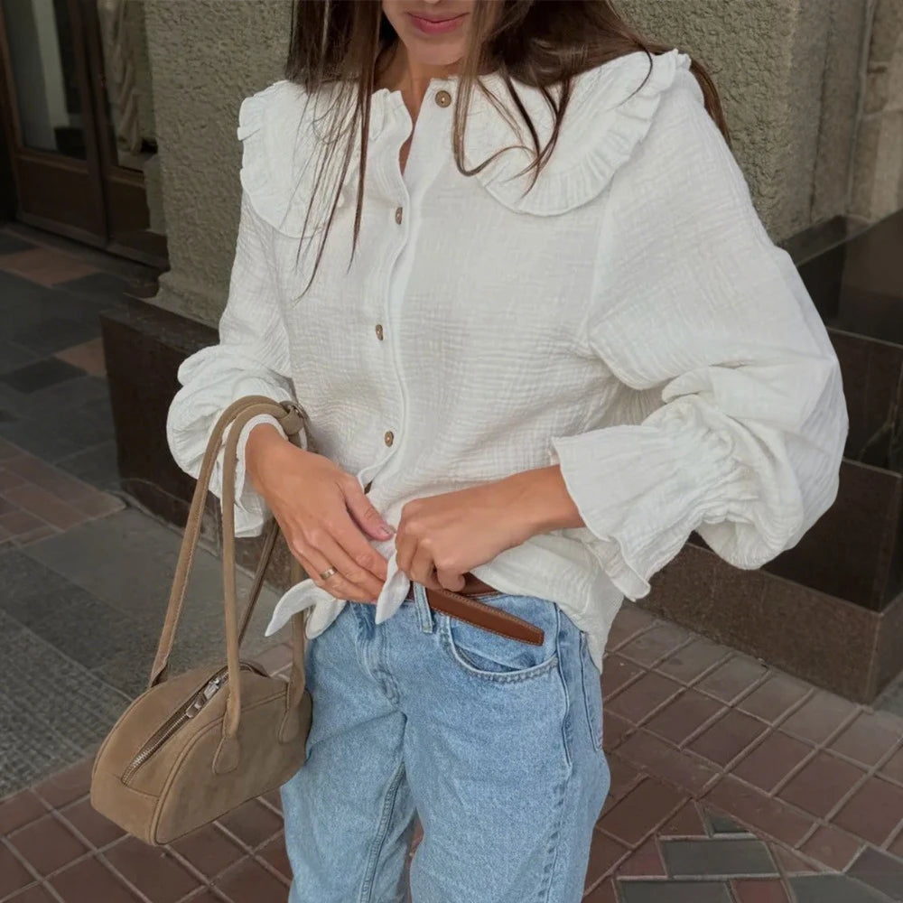 Cyflymder Cotton Spliced Ruffled White Shirts for Women Peter Pan Collar Lantern Sleeve Patchwork Buttons Shirt Autumn Style