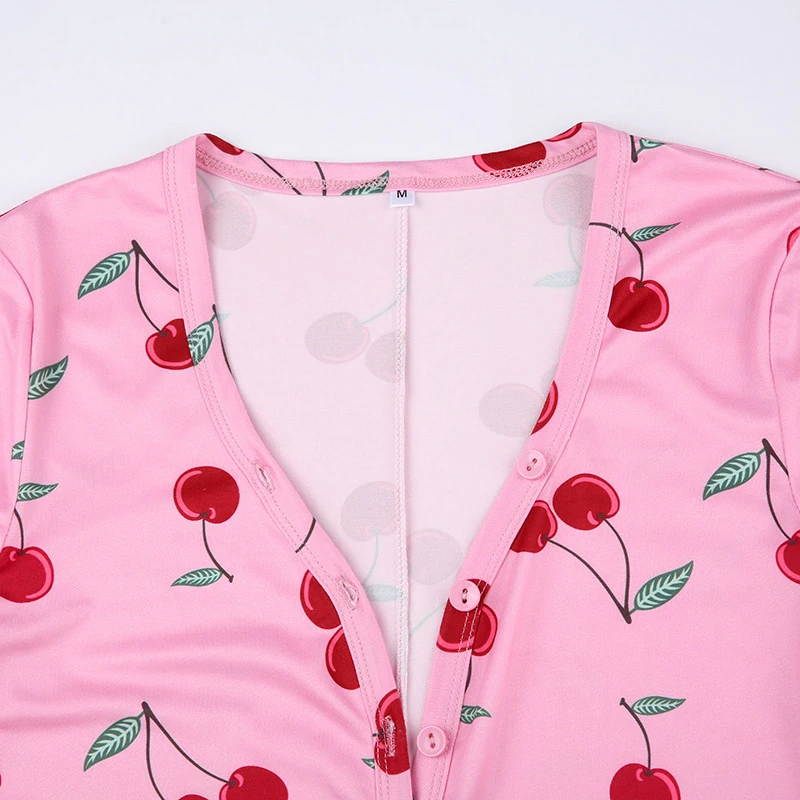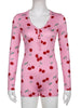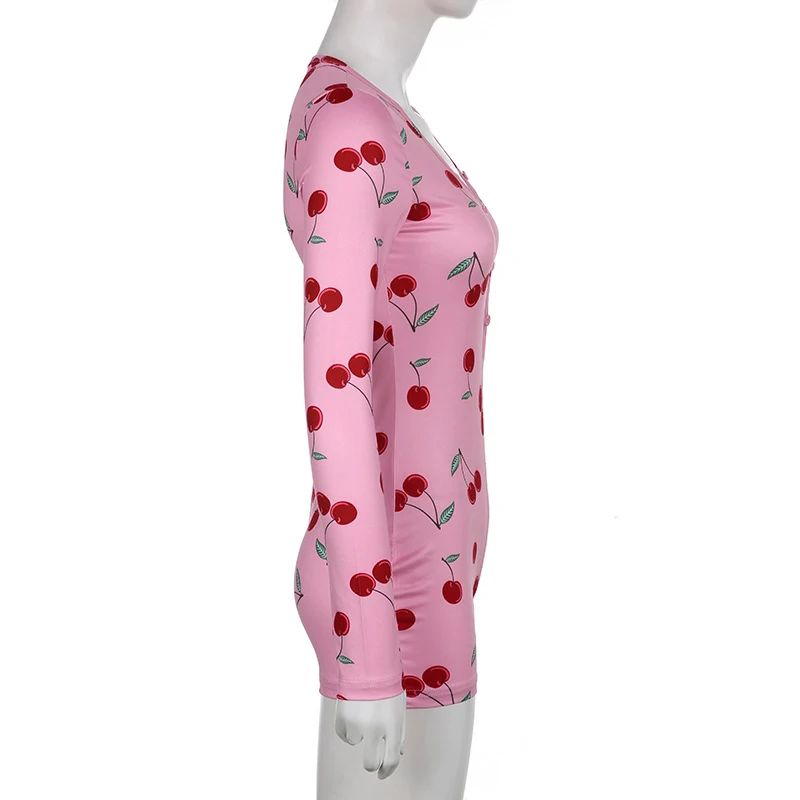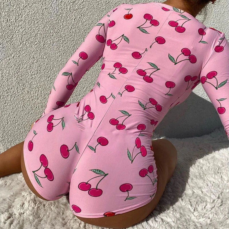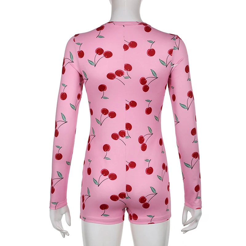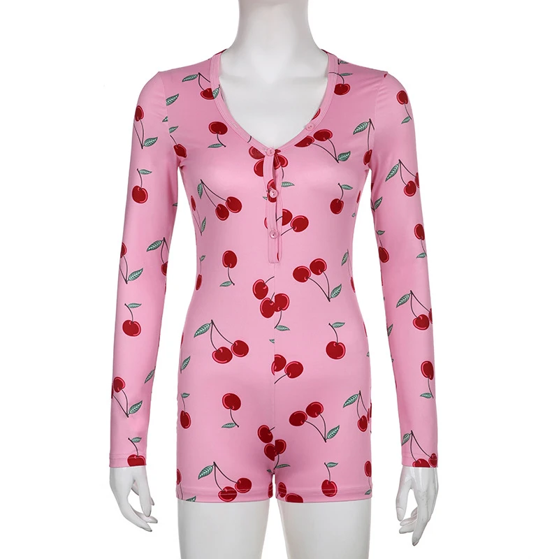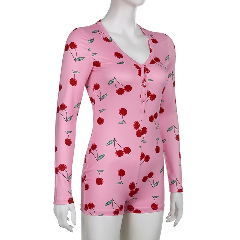 Cyflymder Cute Fruit Cherry Print Tight Fitting Long Sleeve Sexy V Neck Single-breasted Casual Home Bodysuits Sleepwear Playsuit For Women