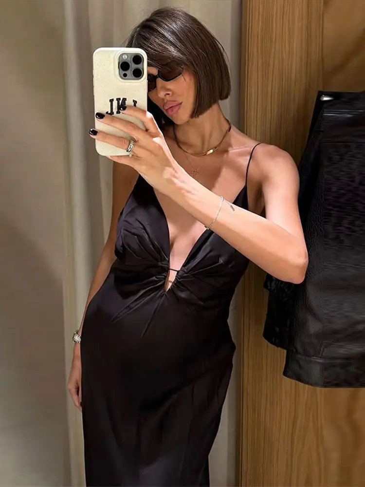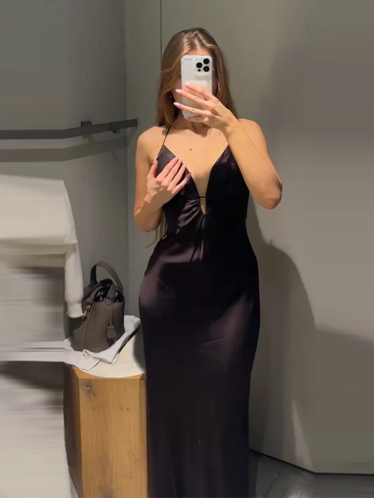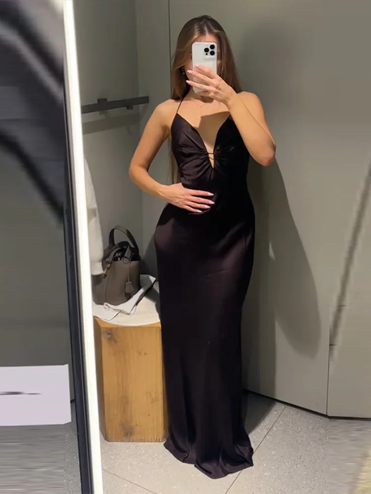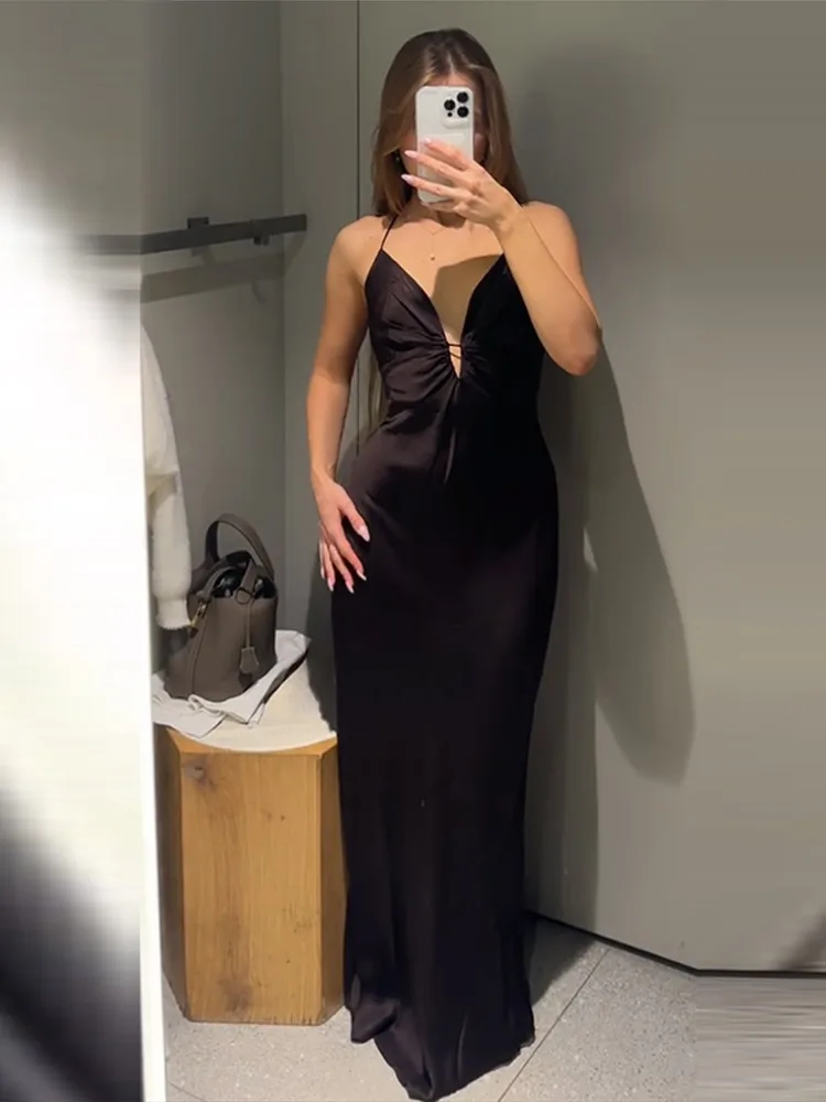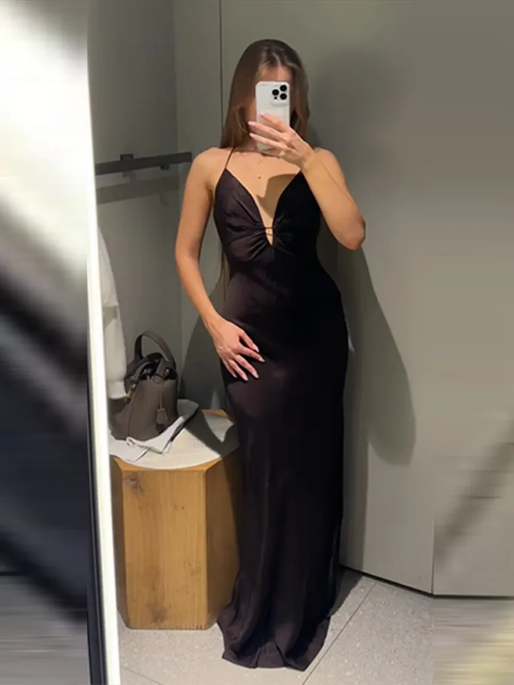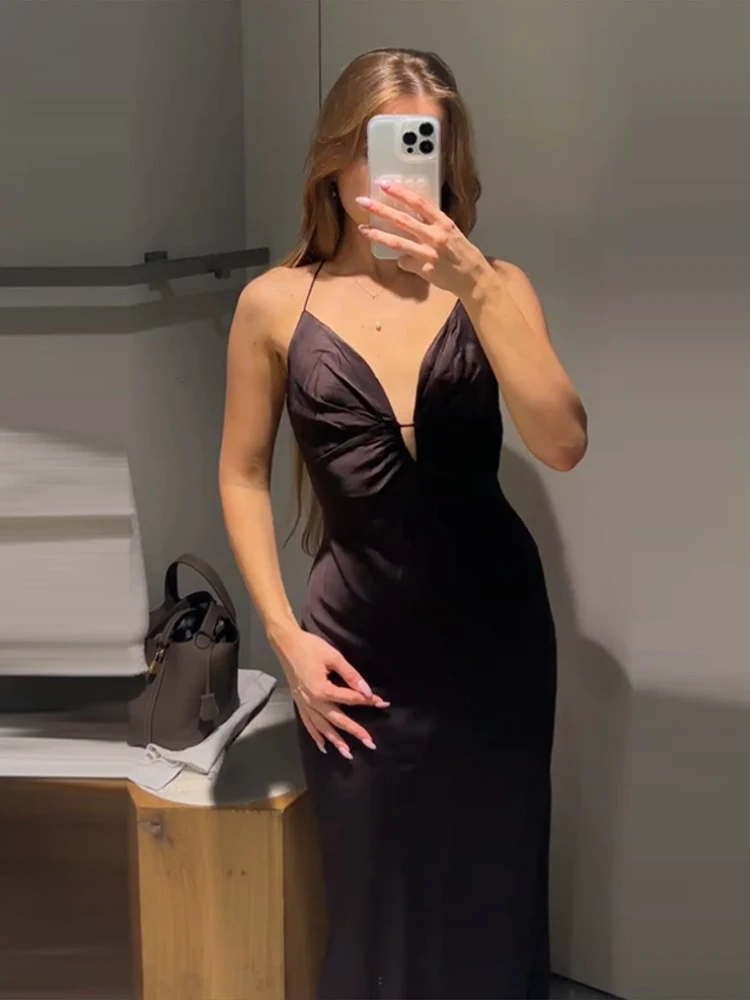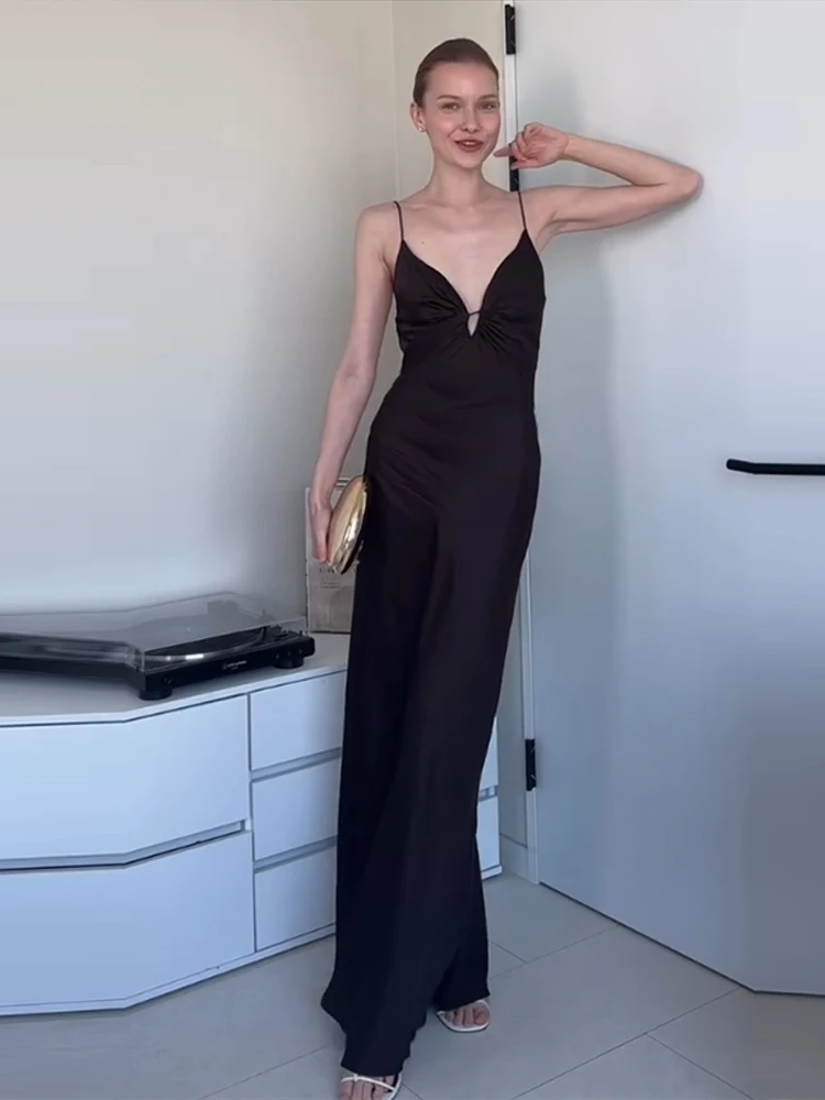 Cyflymder Deep V Pleat Slip Long Dress Women Sexy Sleeveless Backless Waist Cinching Hip Package Dragging Party Dresses Chic Ladies Robes