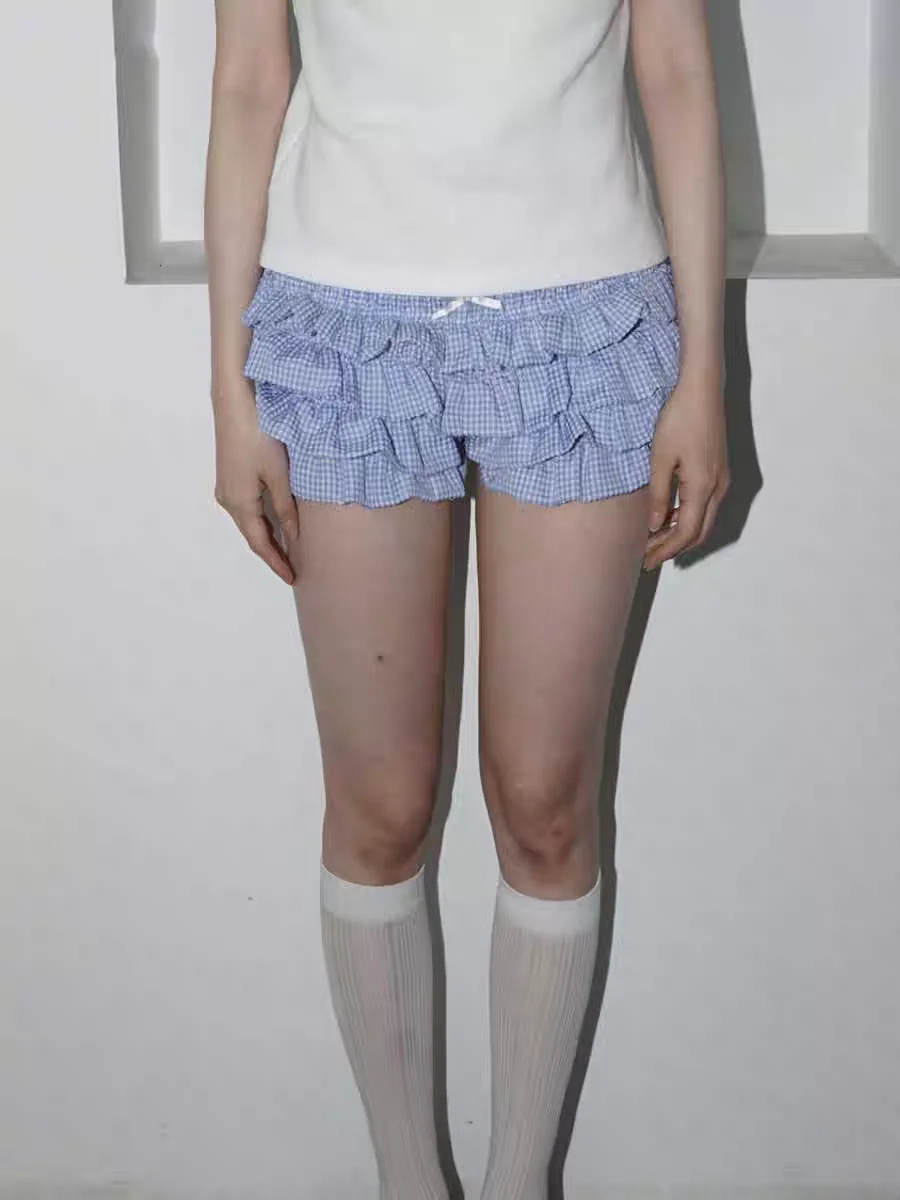 Cyflymder Designer Ruffles Blue Plaid Shorts Women Summer Designer Low Rise Bloomers Micro Cute Shorts Fashion Y2K Bottoms