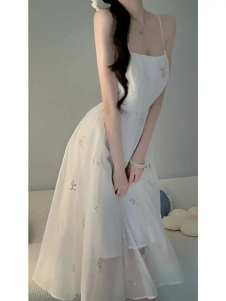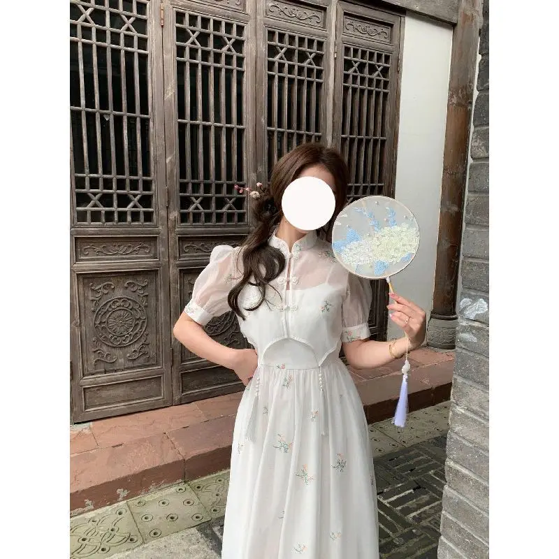 Cyflymder Dress Sets Summer Women Chinese Style Floral Hight Waist Mesh Midi Dresses Elegant Casual Gentle Wind Female Dress Vestidos
