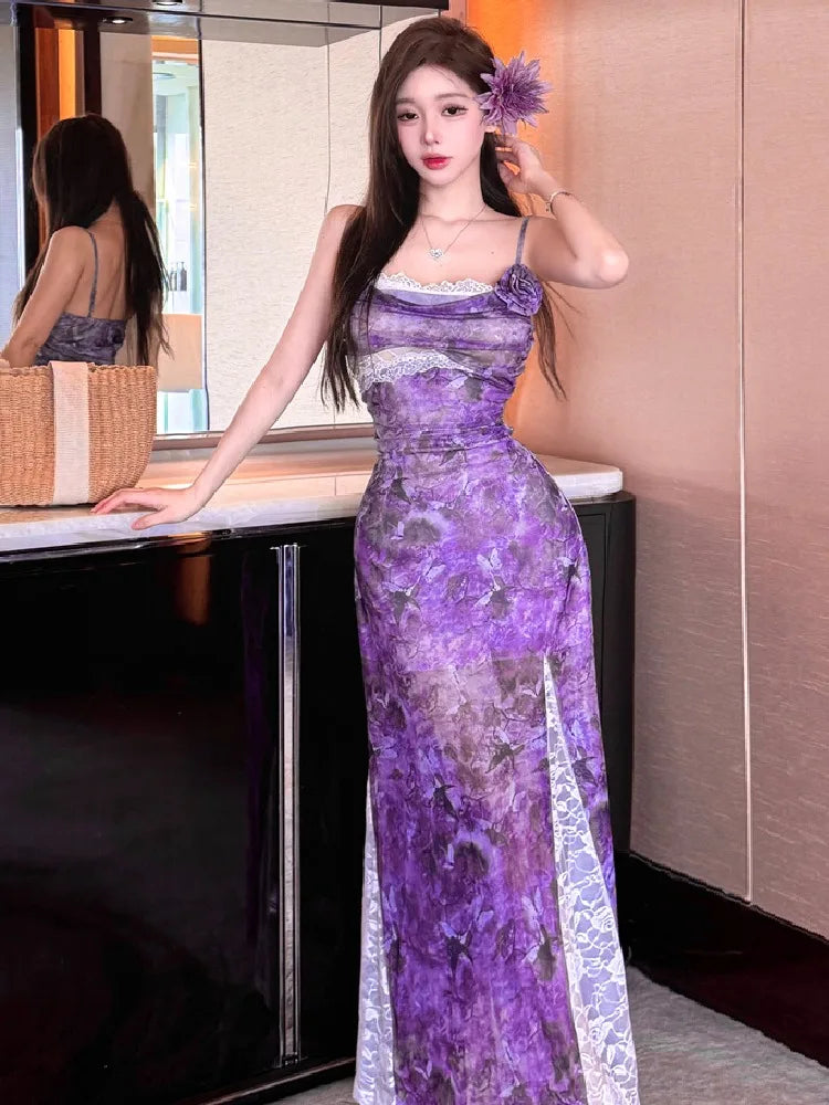 Cyflymder Dresses Women Lace Patchwork Mesh Sleeveless Vintage Sexy Slim Floral Printed Temperament Elegant Dress Party Female