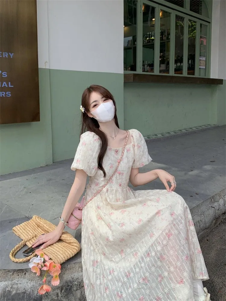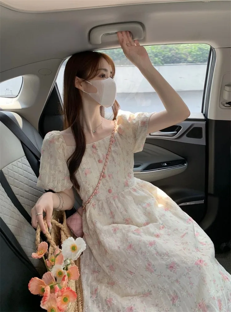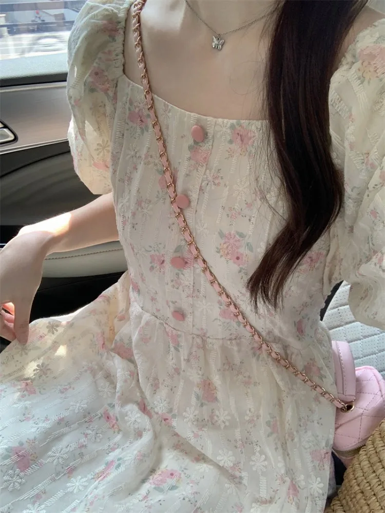 Cyflymder Dresses Women Square Collar French Style Floral Printed Puff Short Sleeve Vintage Elegant Temperament Dress Ladies Casual