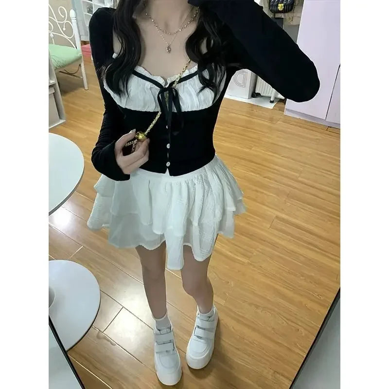 Cyflymder Early Autumn New Sweet System Suit Spicy Girl Petite Black White Spliced Top White Cake Short Skirt 2-piece Set
