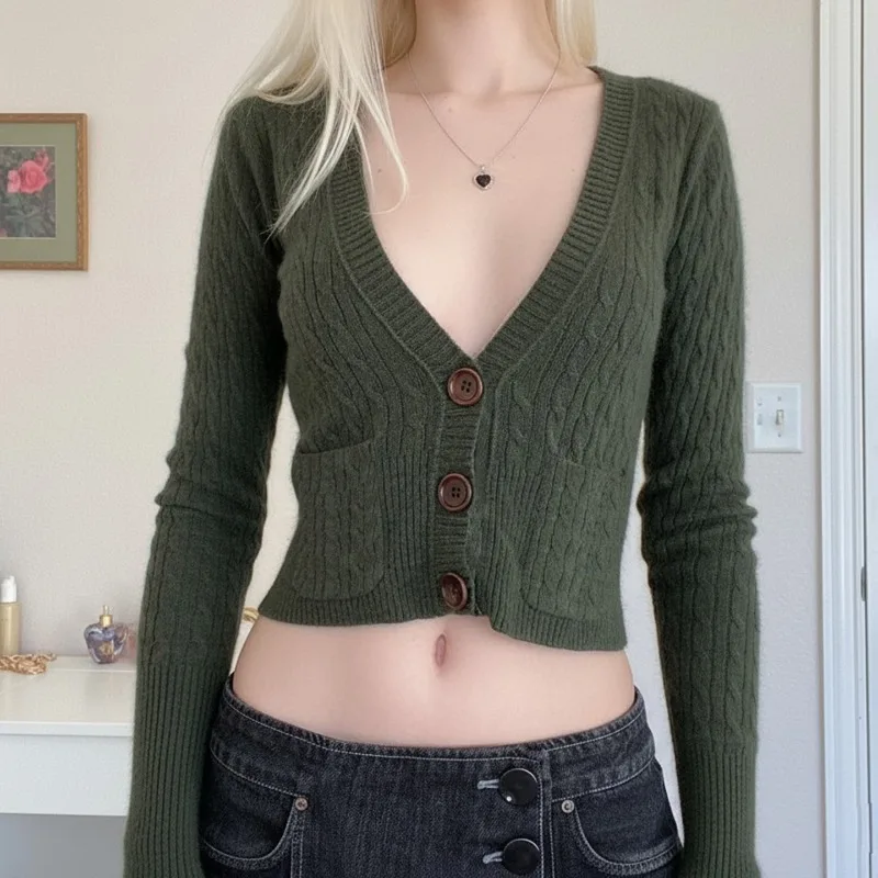 Cyflymder Elegant Autumn Simple Knitted Short Cardigan Y2k American All Match Commuter Punk Women Sweater V Neck Single Breasted Jumper