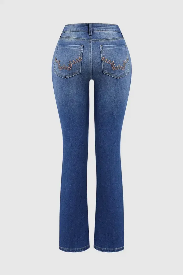 Cyflymder Elegant Country Wear| Distressed High Waisted Flared Cowgirl Outfit -Printing with Golden Studs, Casual Vintage Jeans T46