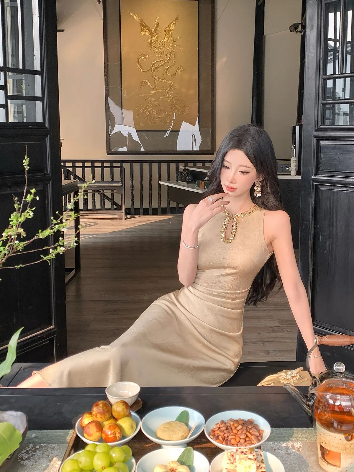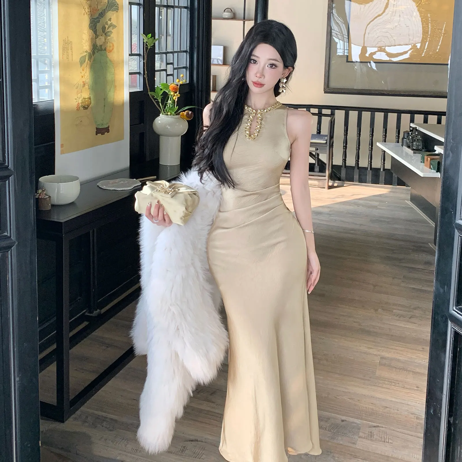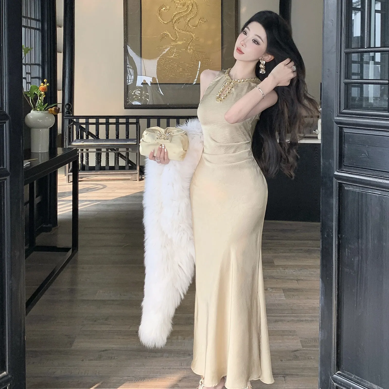Cyflymder Elegant Gold Sleeveless Long Dress V-Neckline Events Evening Parties Luxurious woman dresses Hot Sexy Flowy Clothing