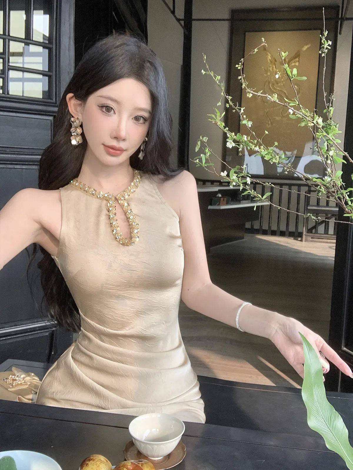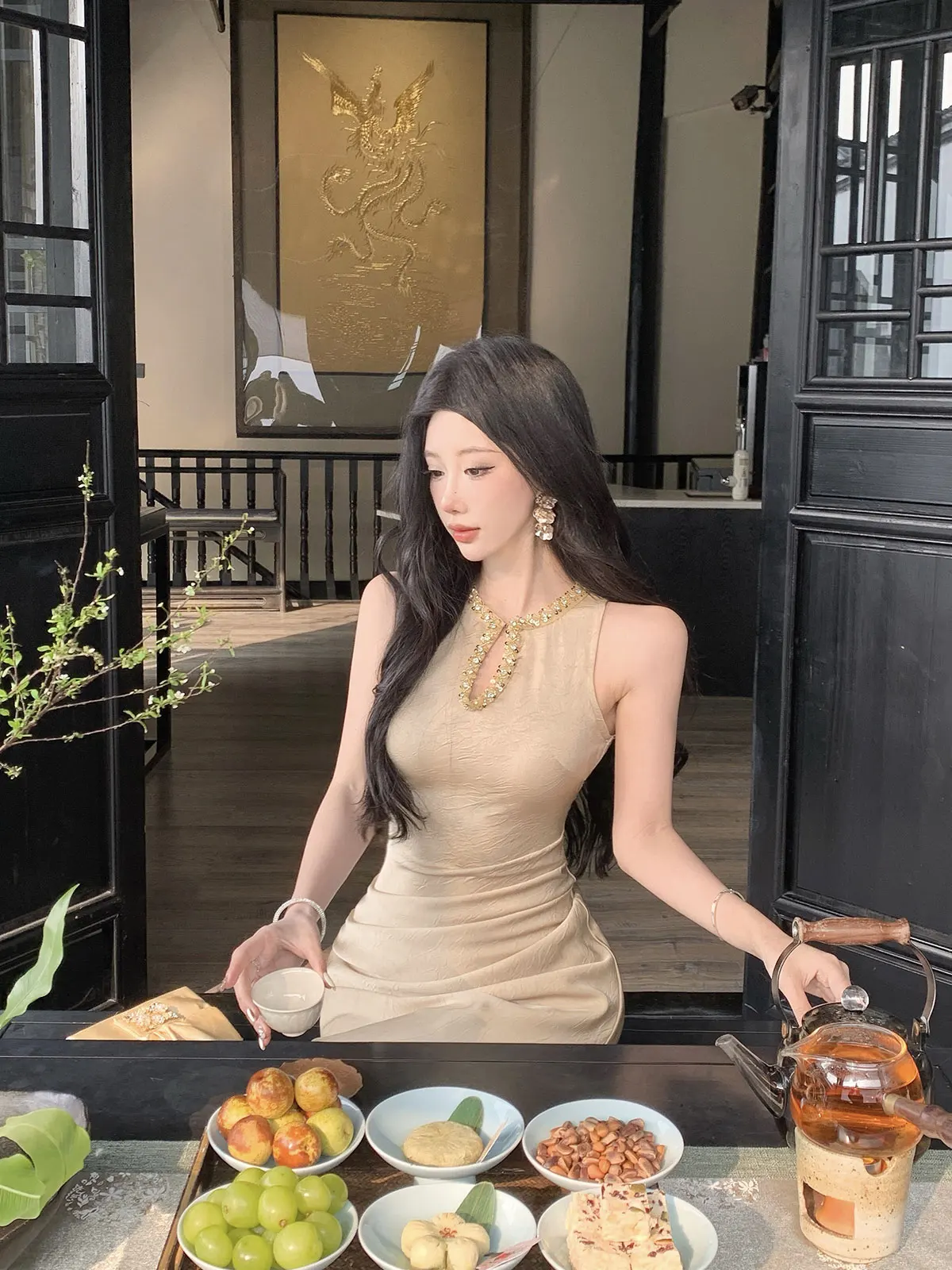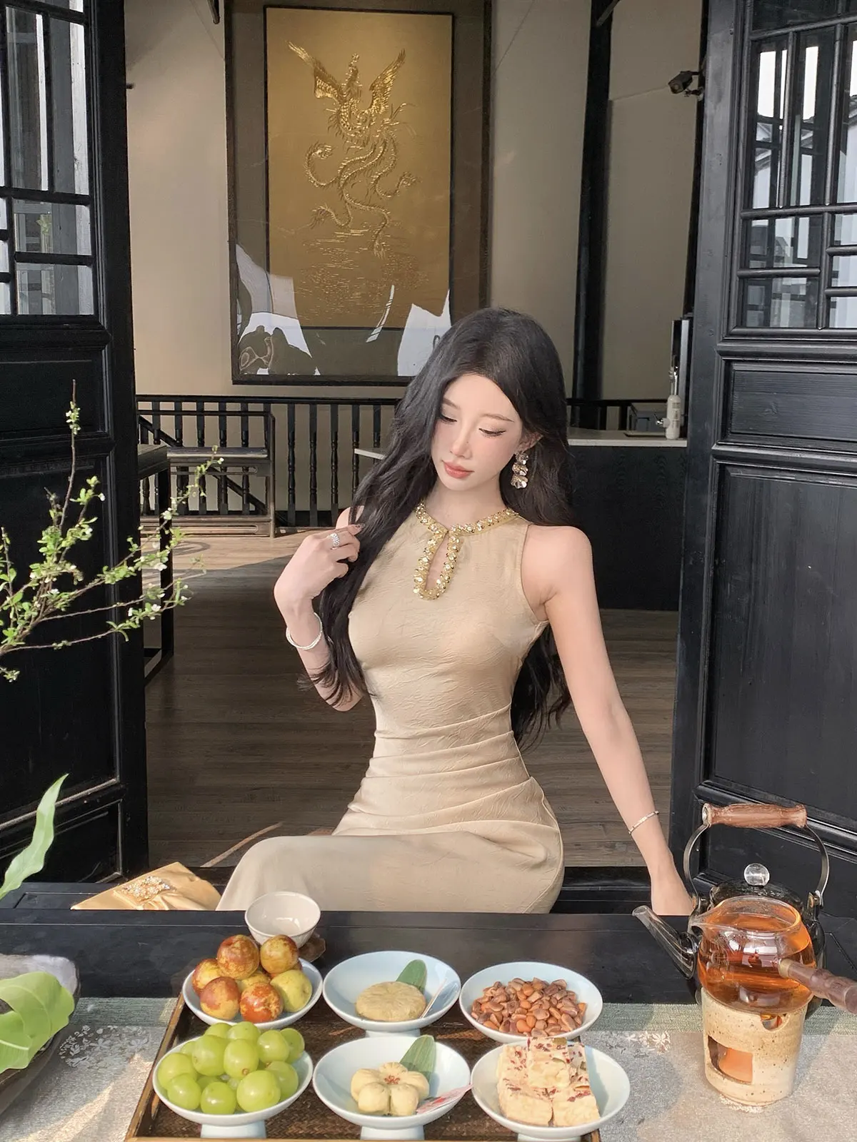 Cyflymder Elegant Gold Sleeveless Long Dress V-Neckline Events Evening Parties Luxurious woman dresses Hot Sexy Flowy Clothing