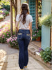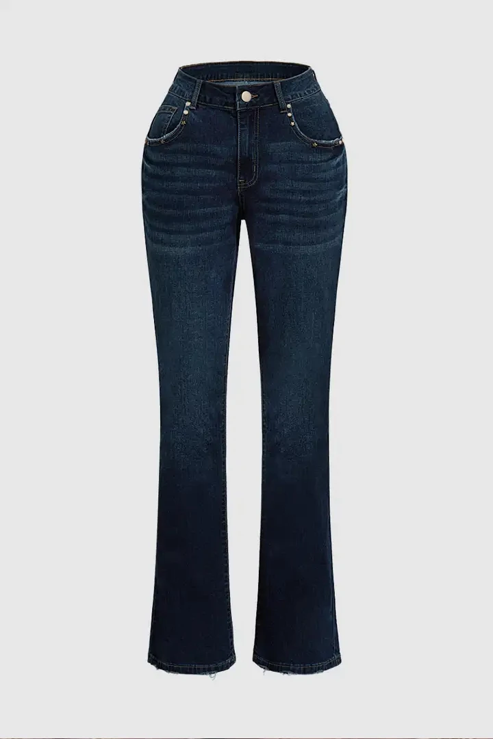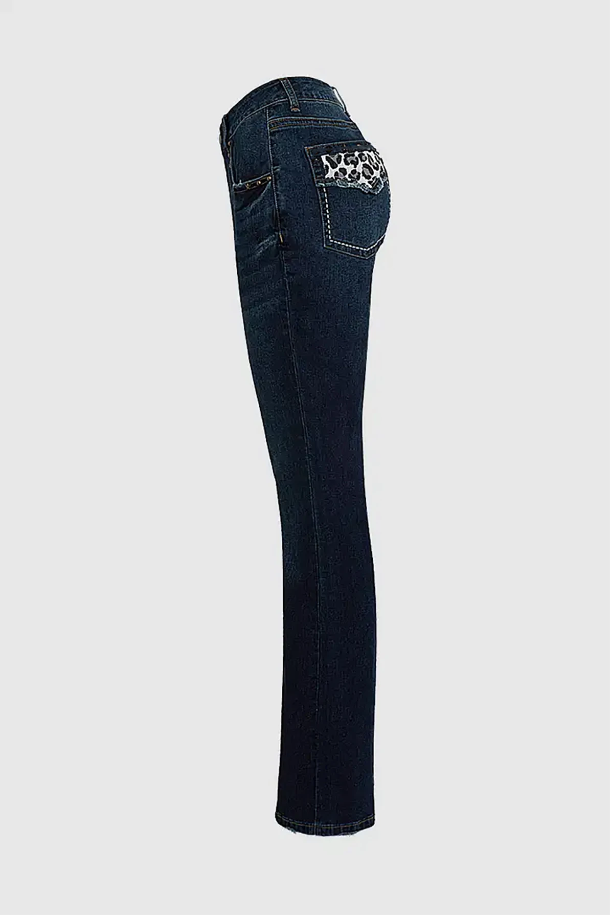 Cyflymder Elegant High Stretchy Skinny Flare Jeans, Leopard-Print Pockets with Studs, Mid Waist Slim Fit- Retro & Stylish Long Length T27
