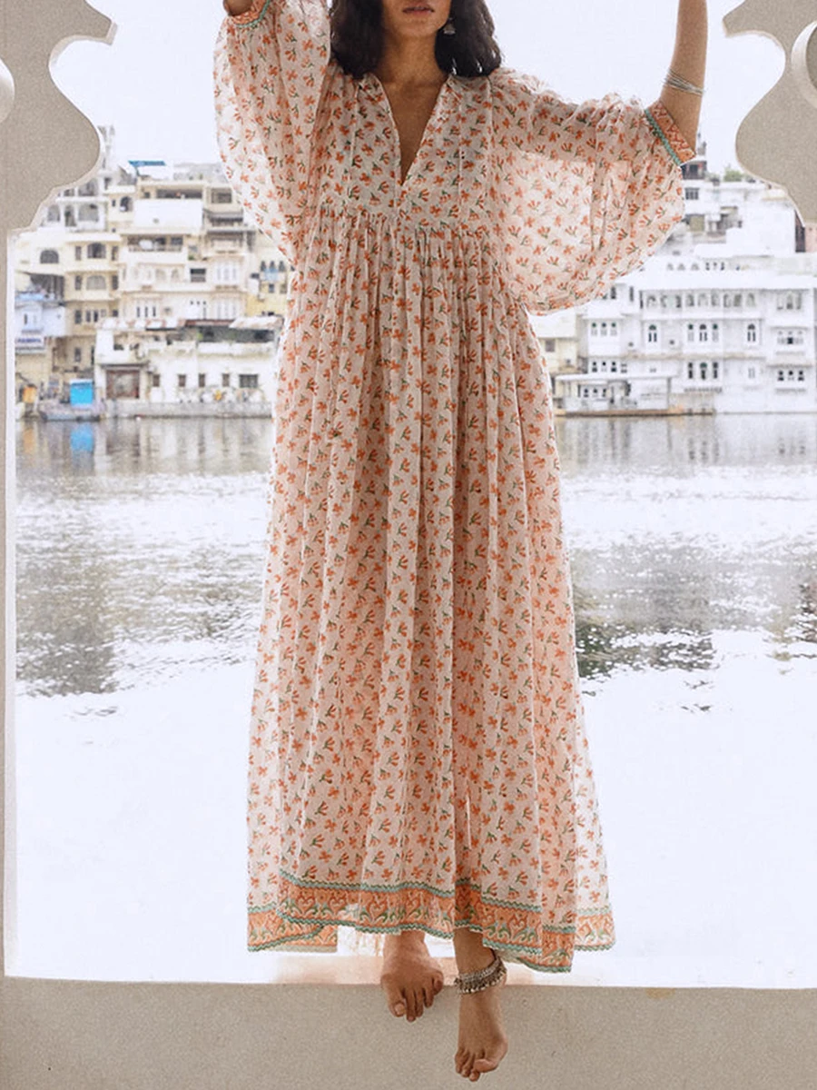 Cyflymder Elegant Maxi Dress with 3 4 Sleeves V Neckline and Floral Print - Stylish Loose Fit Summer Dress for Casual Wear