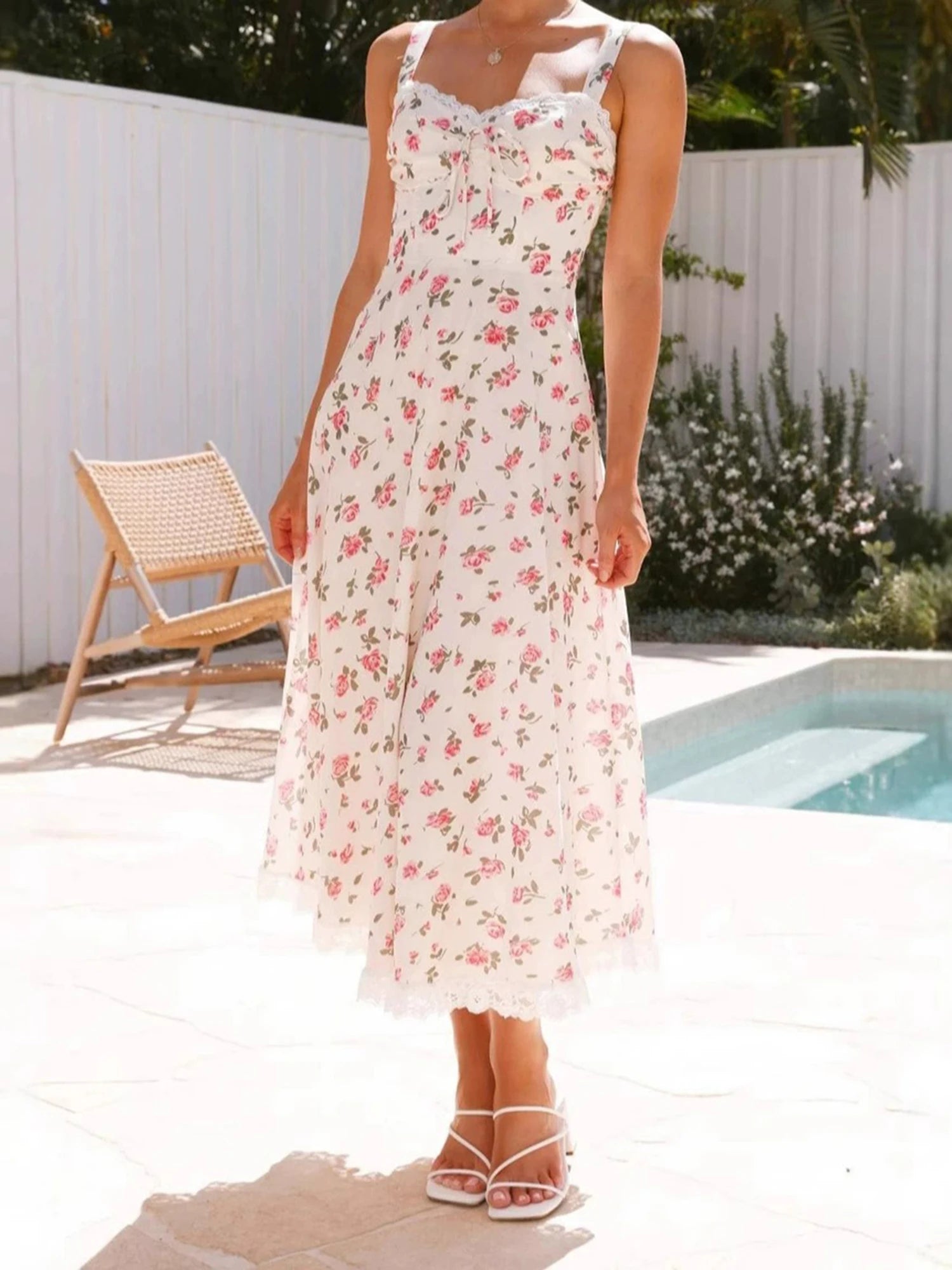 Cyflymder Elegant Maxi Dress with Floral Print and Lace Trim Sleeveless A-Line Dress for Women Perfect for Summer Fashion