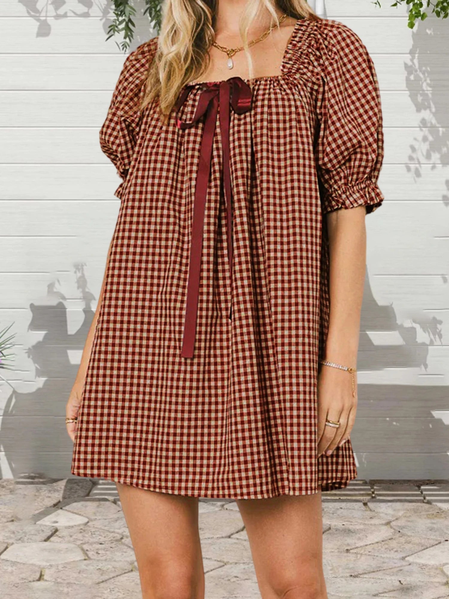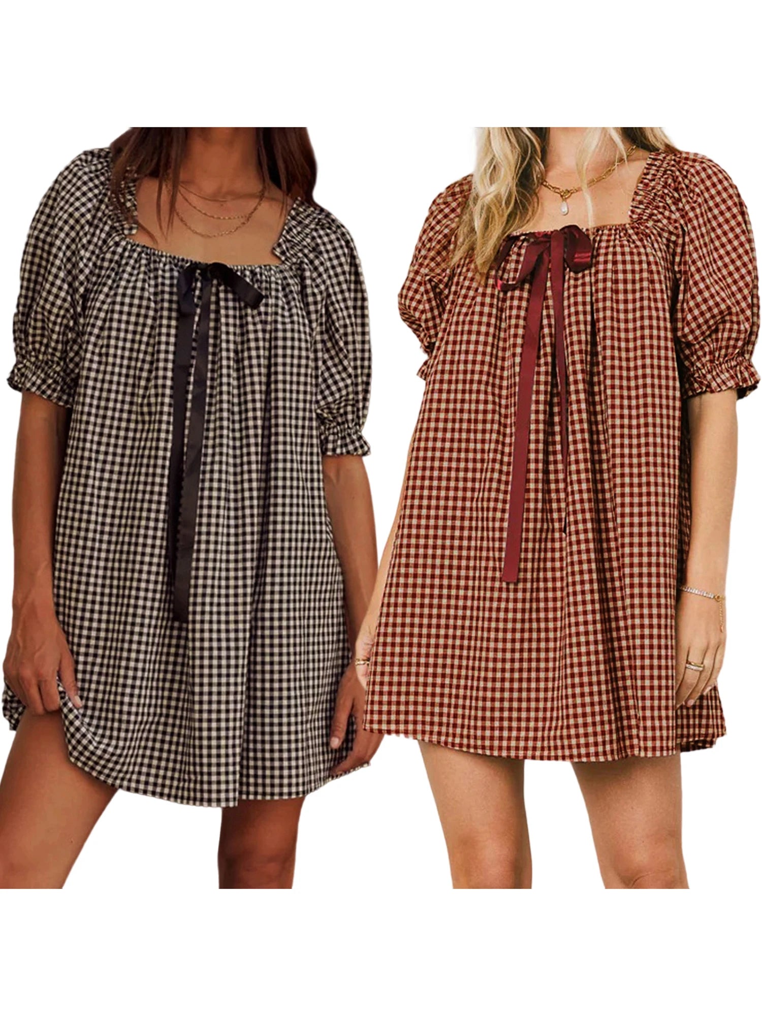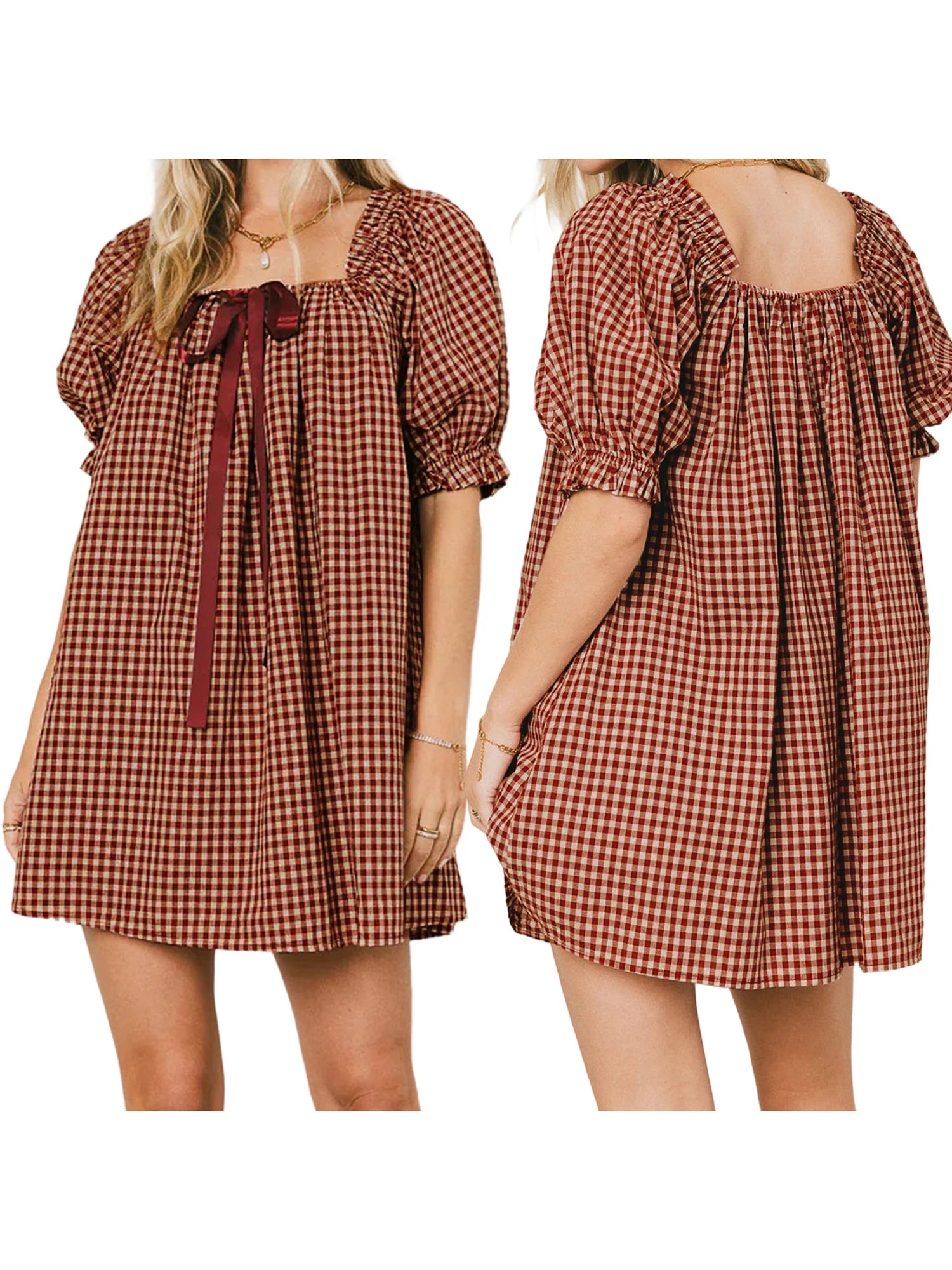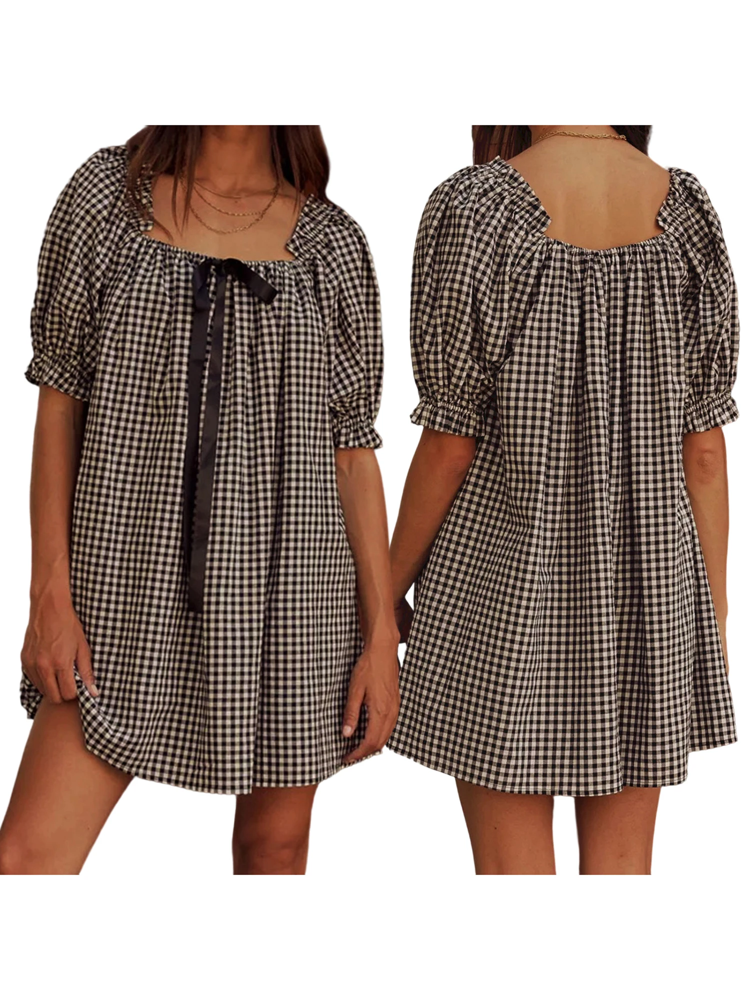 Cyflymder Elegant Plaid Summer Dress with Square Neckline and Puff Sleeves Perfect for Daily Wear and Travel Outfits