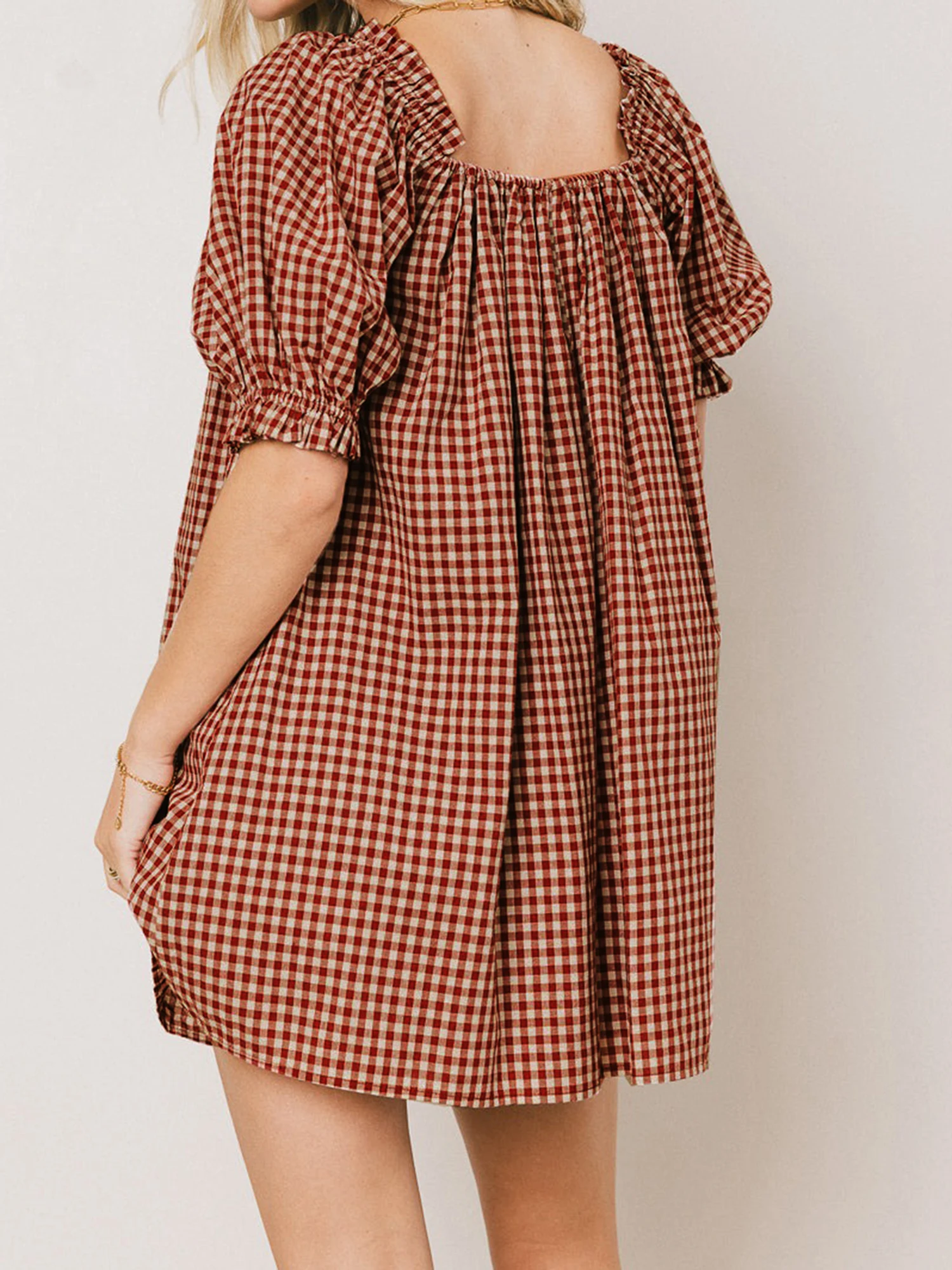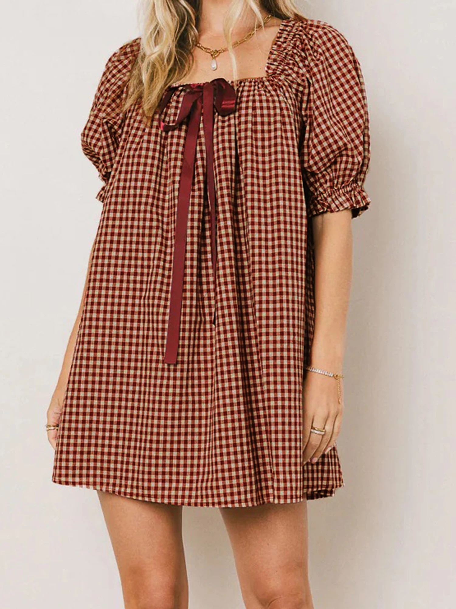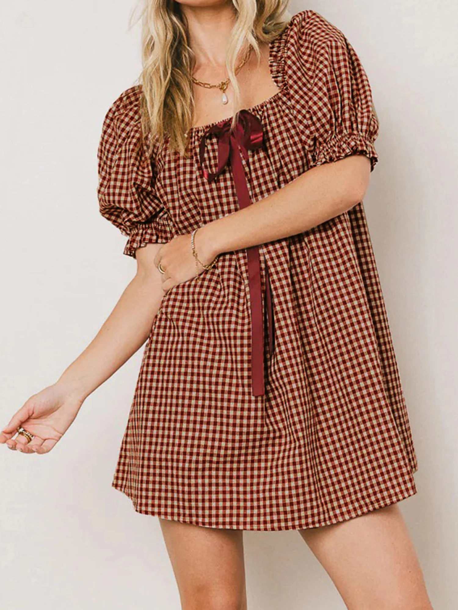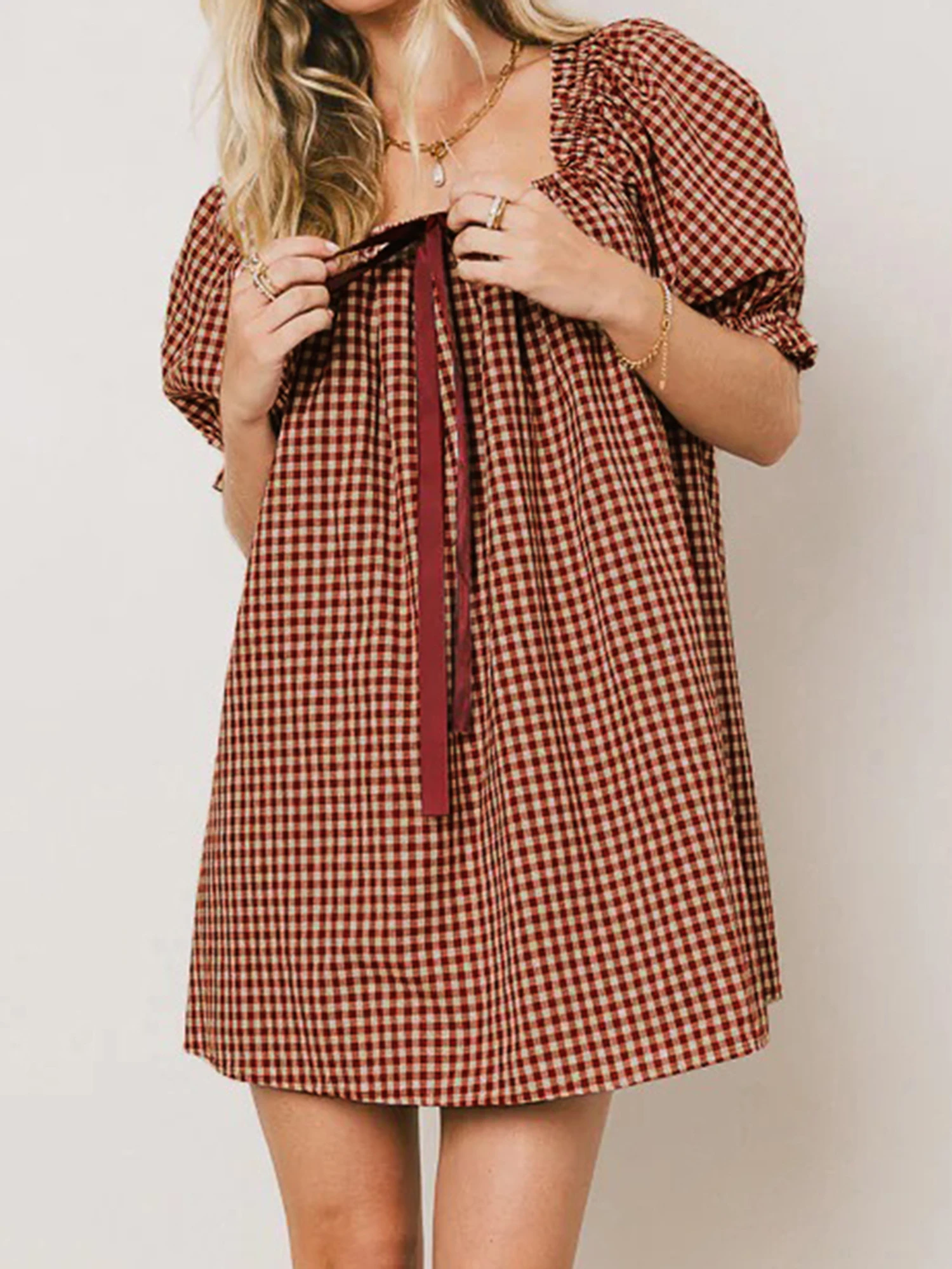 Cyflymder Elegant Plaid Summer Dress with Square Neckline and Puff Sleeves Perfect for Daily Wear and Travel Outfits