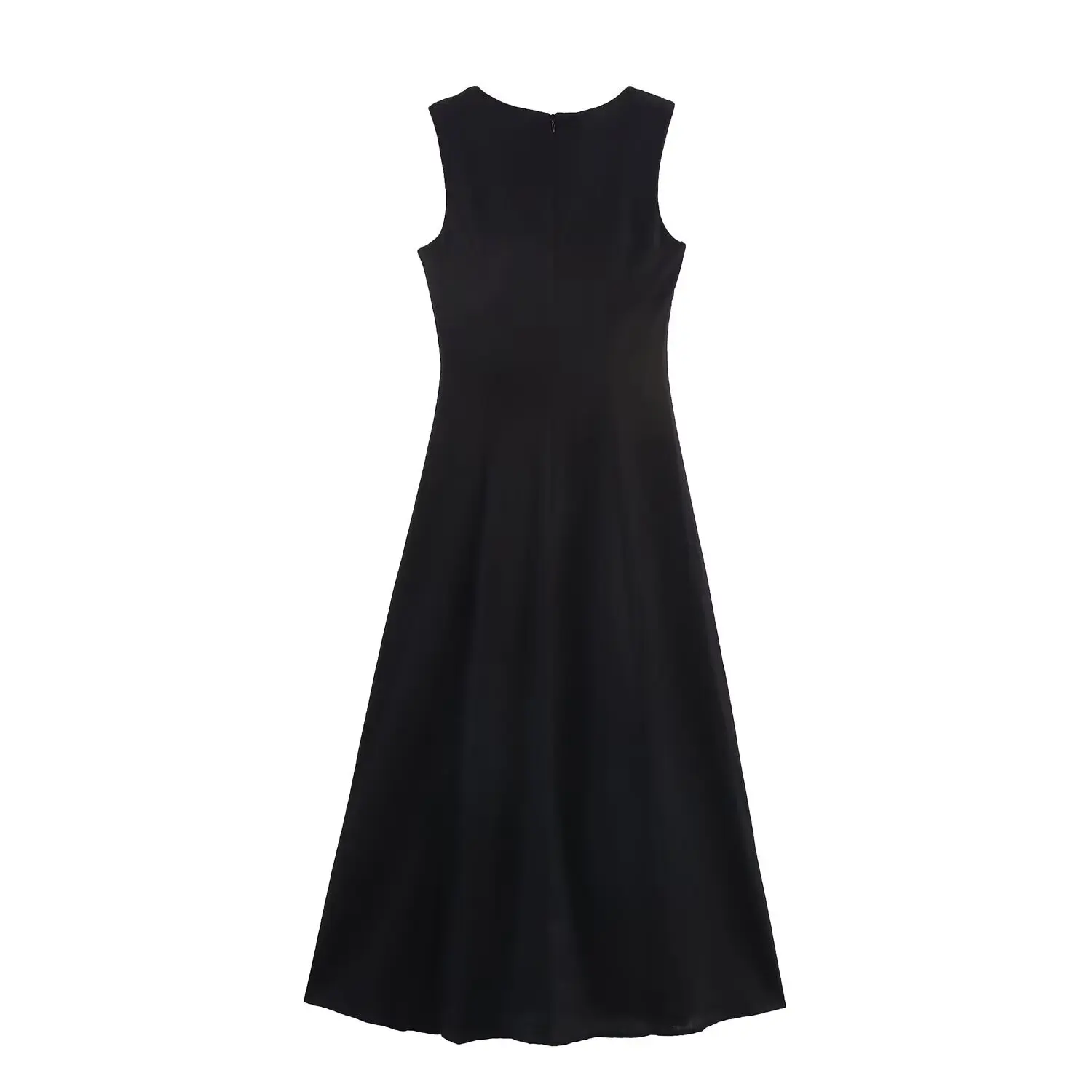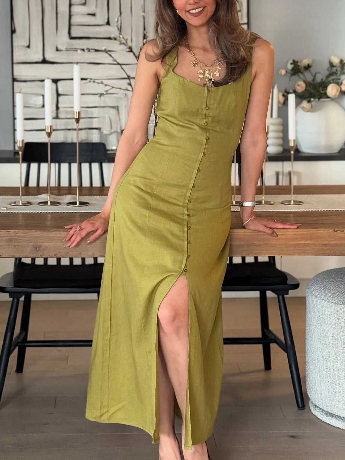 Cyflymder Elegant retro linen maxi dress for women new summer fashion square neck single breasted slim fit chic party evening dress