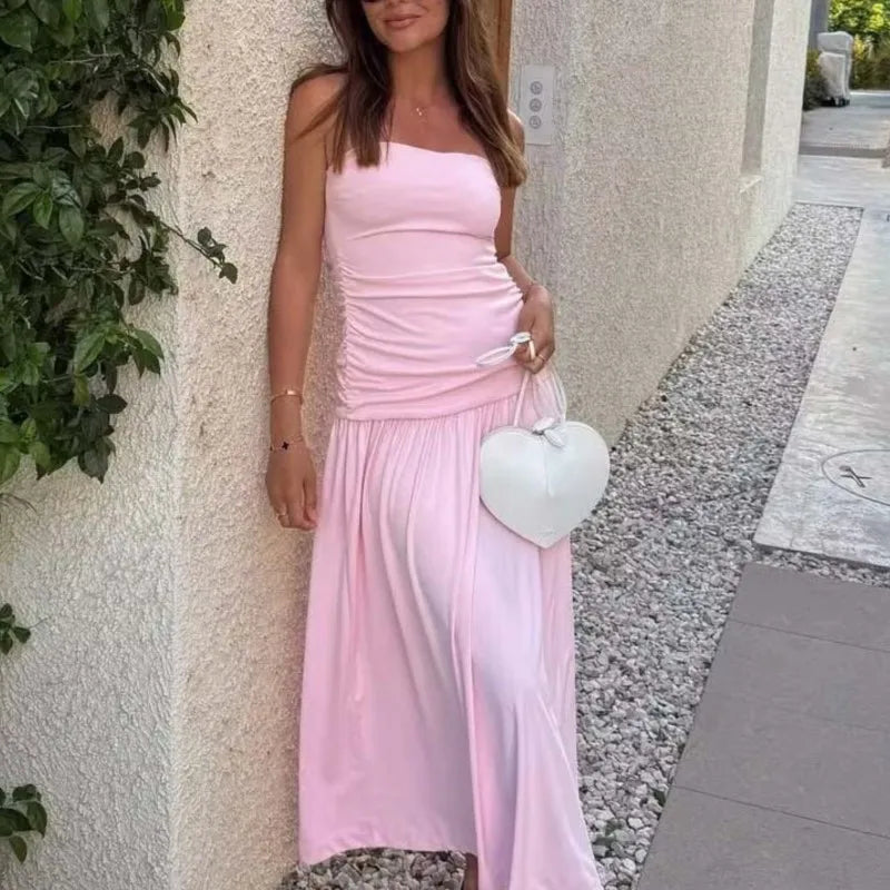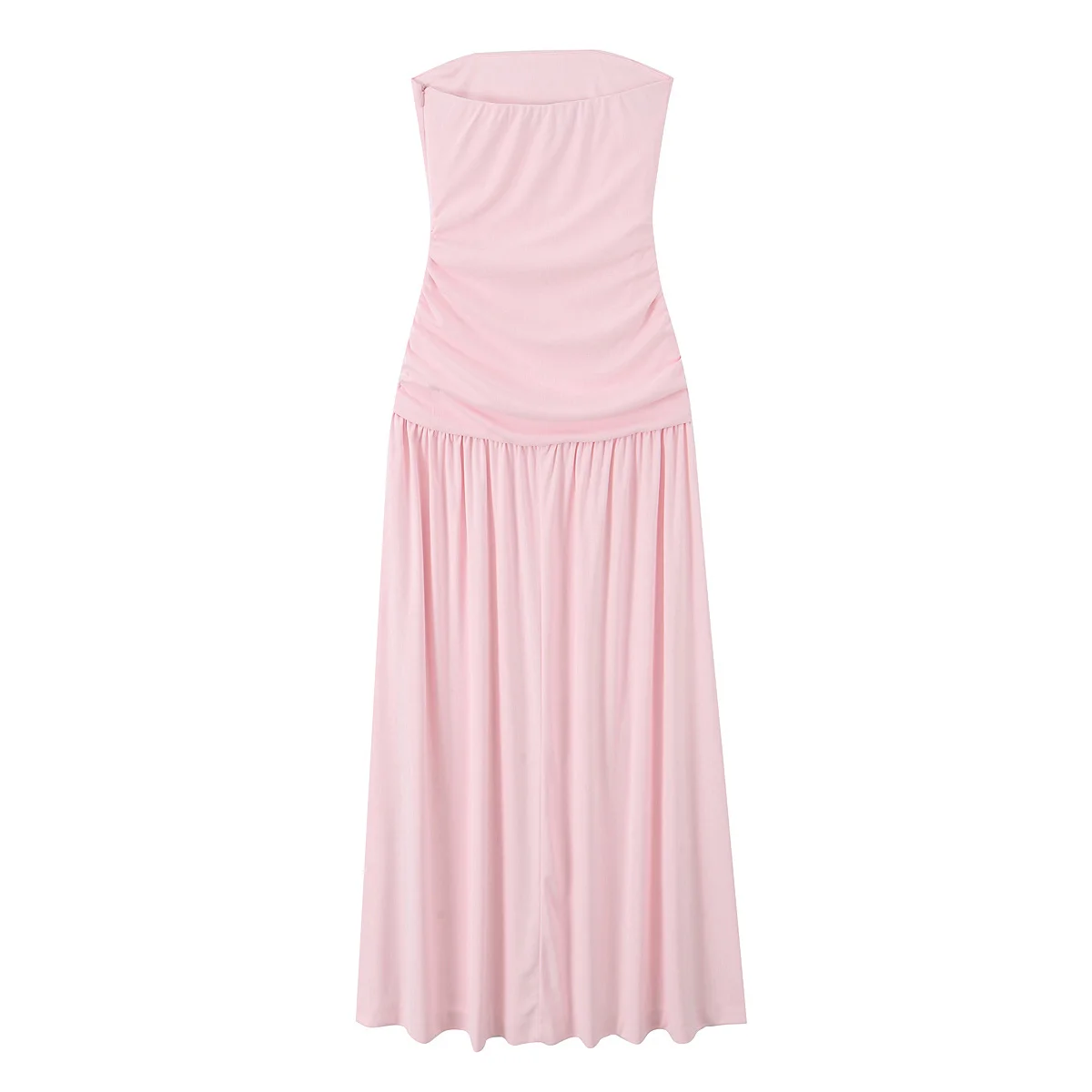 Cyflymder Elegant Ruched Strapless Dress Women Sexy Pastel Pink Off Shoulder Side Zipper Midi Dress 2025 New Summer Party Evening Dresses