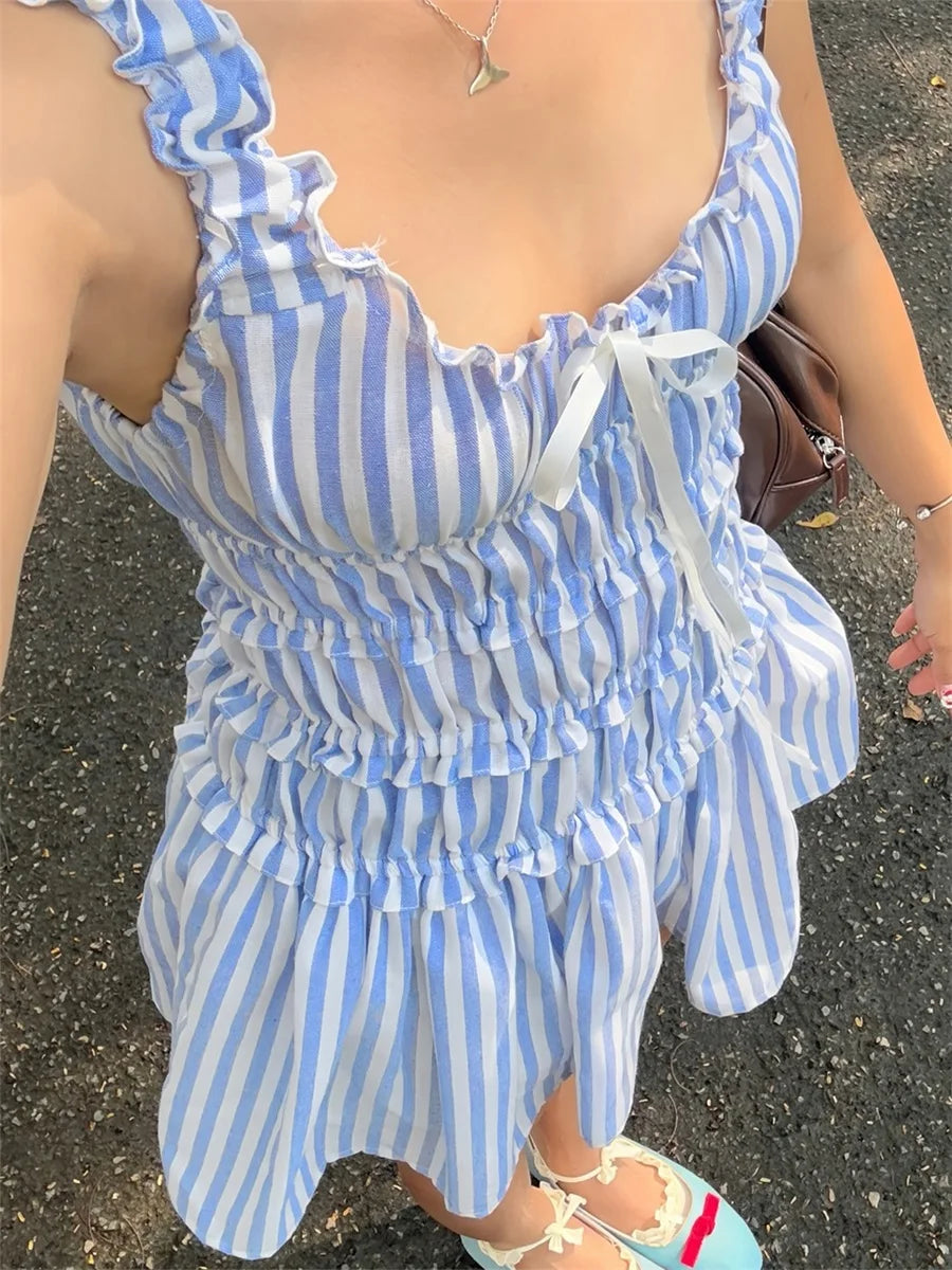 Cyflymder Elegant Striped Sleeveless Dress with Flattering Tie-up Bow Detail and Chic Frill Trim - Women s Scoop Neck A-line Ruffle Mini