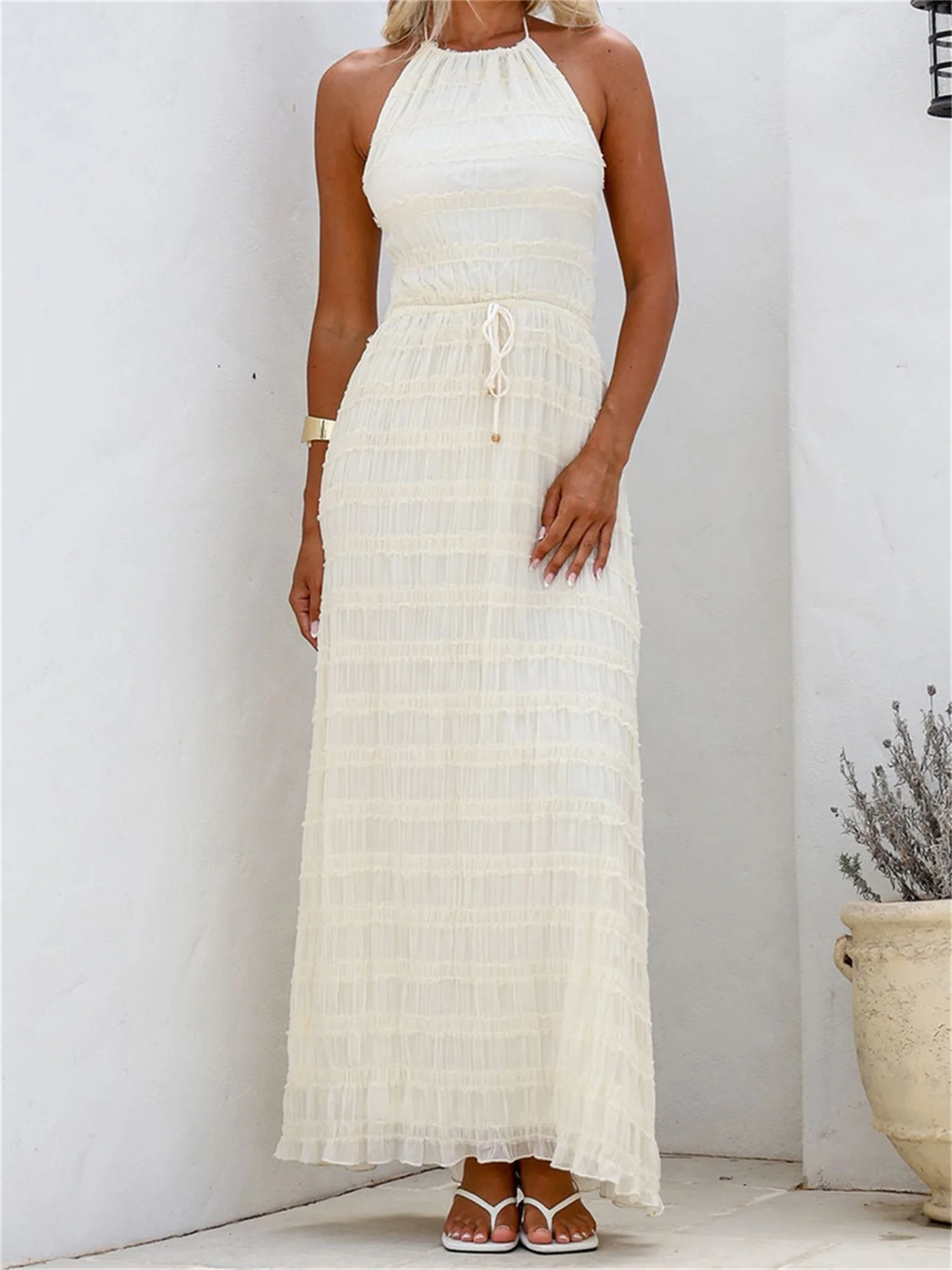 Cyflymder Elegant V-Neck Maxi Dress with Ruffle Detail and Adjustable Waist Tie Sleeveless Summer Beach Dress for Women