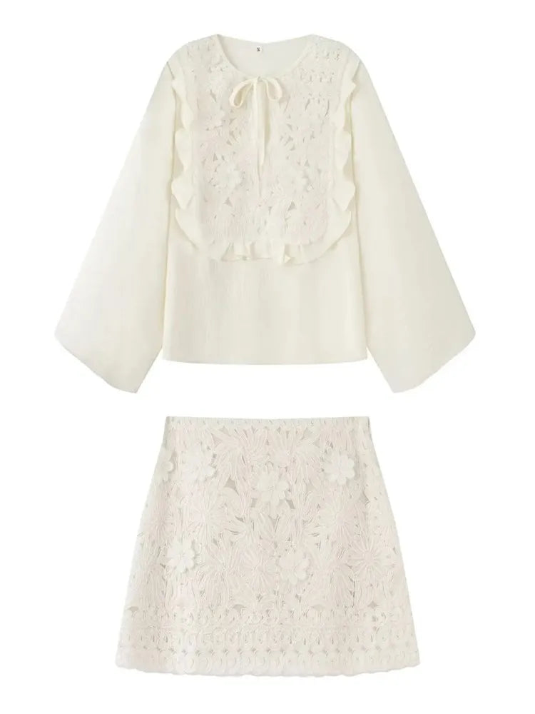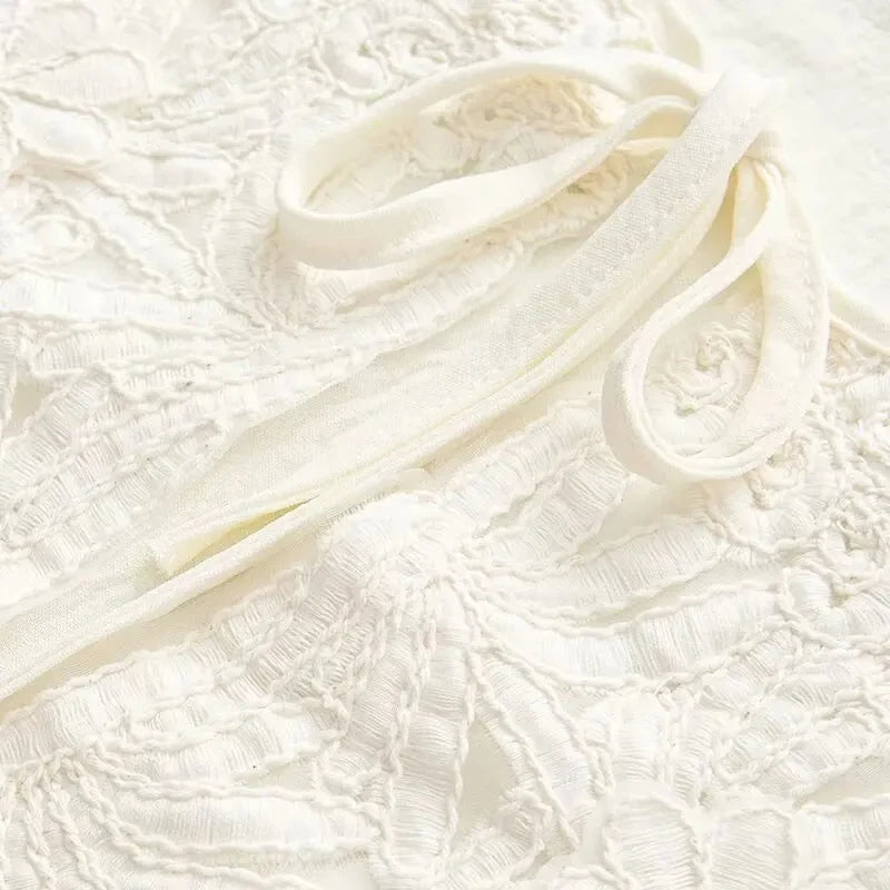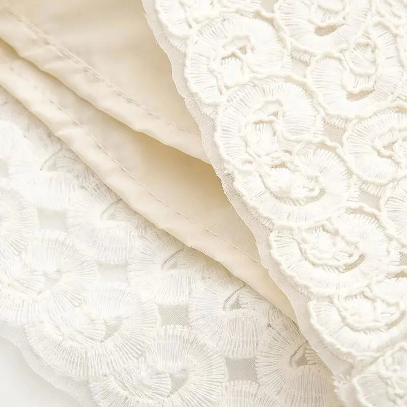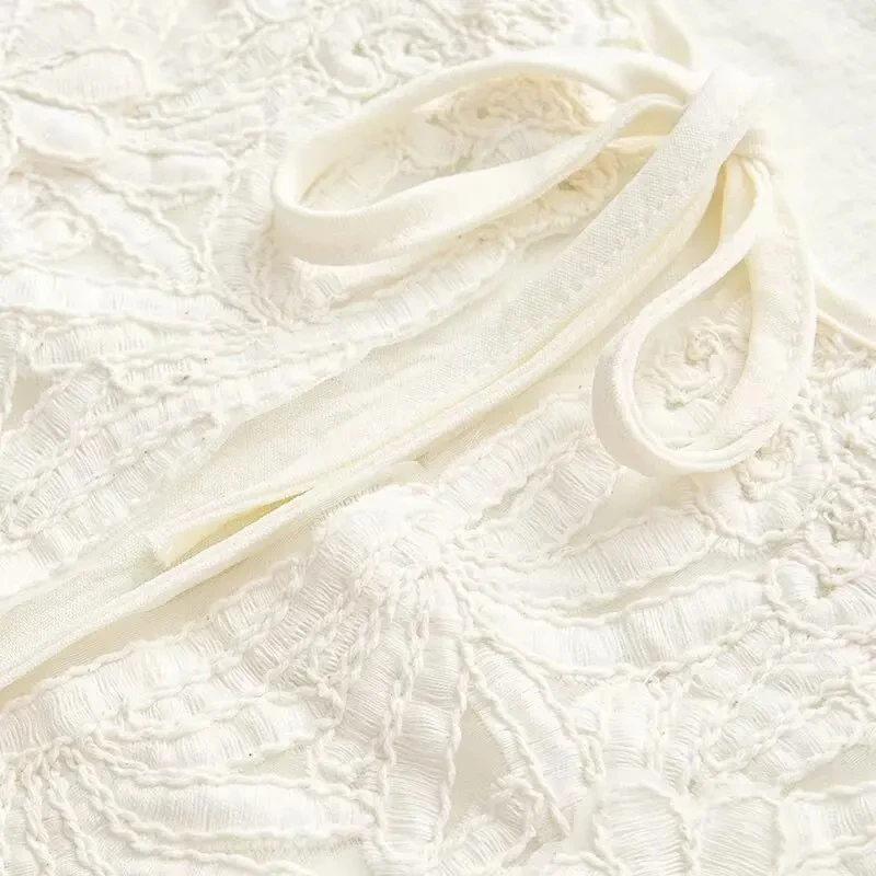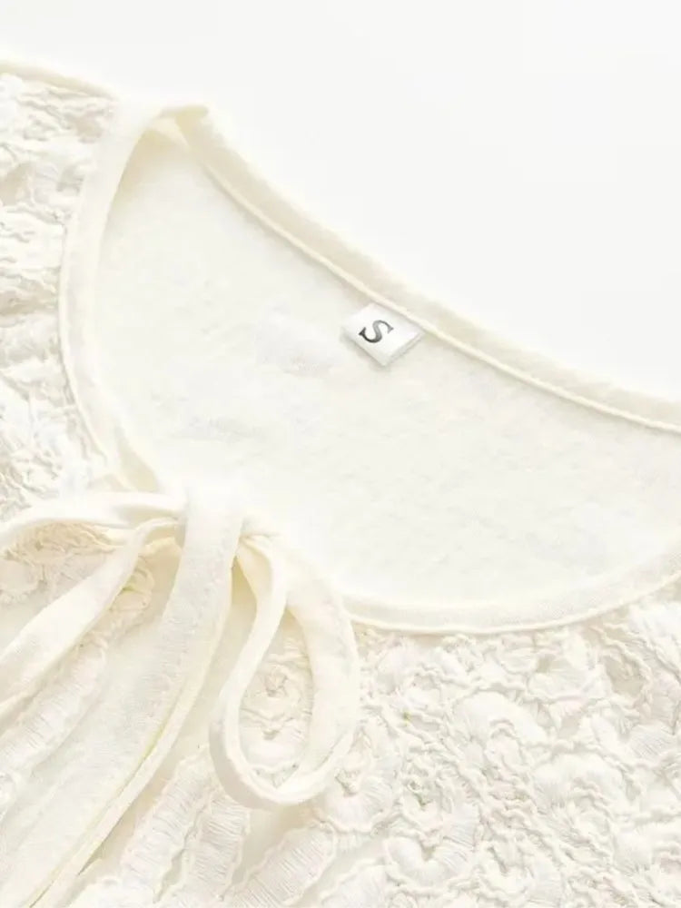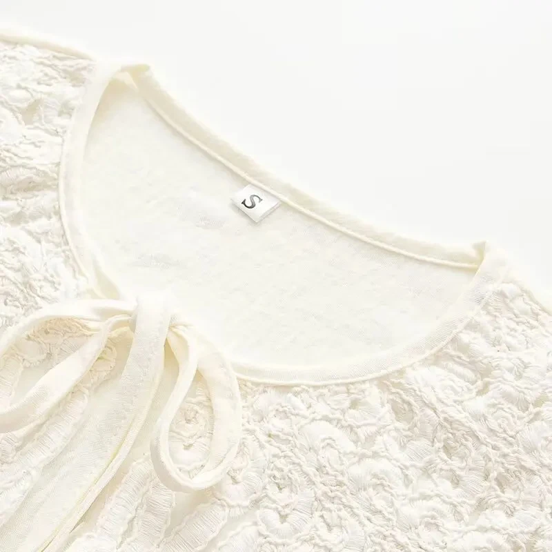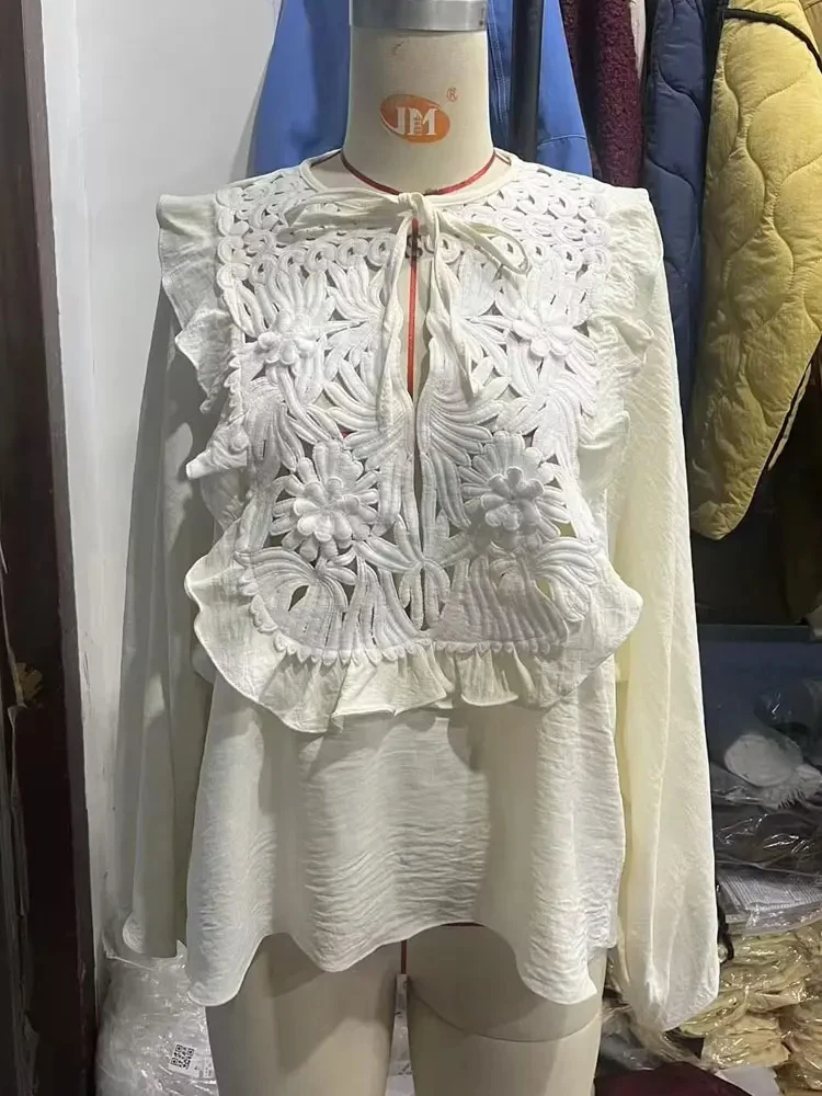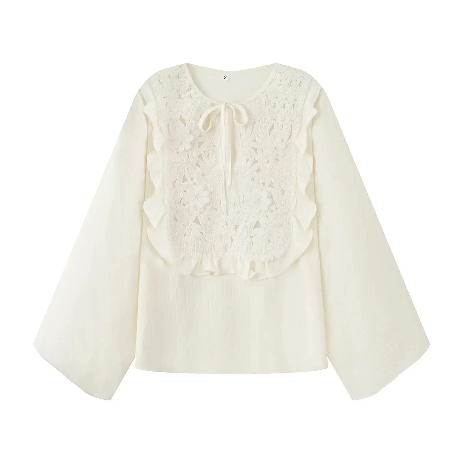 Cyflymder Embroidery Crochet Hollow Shirts For Women Elegant Long Sleeve O Neck Lace Up Blouse Female 2025 New Summer Casual Loose Shirt