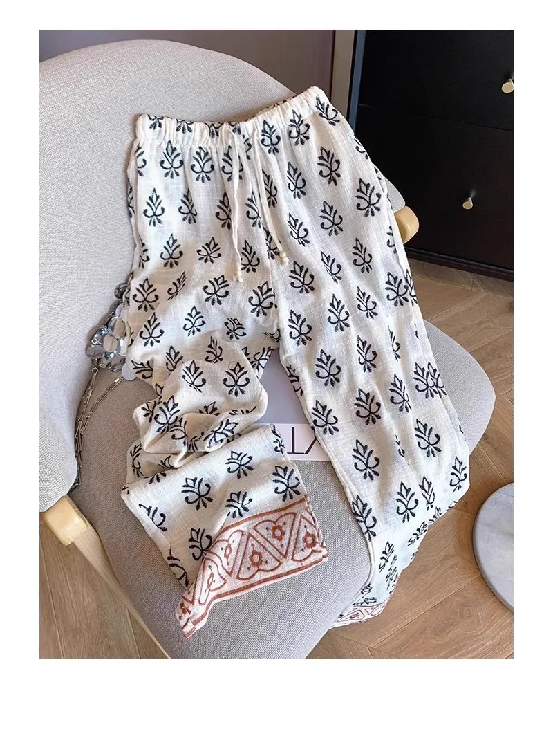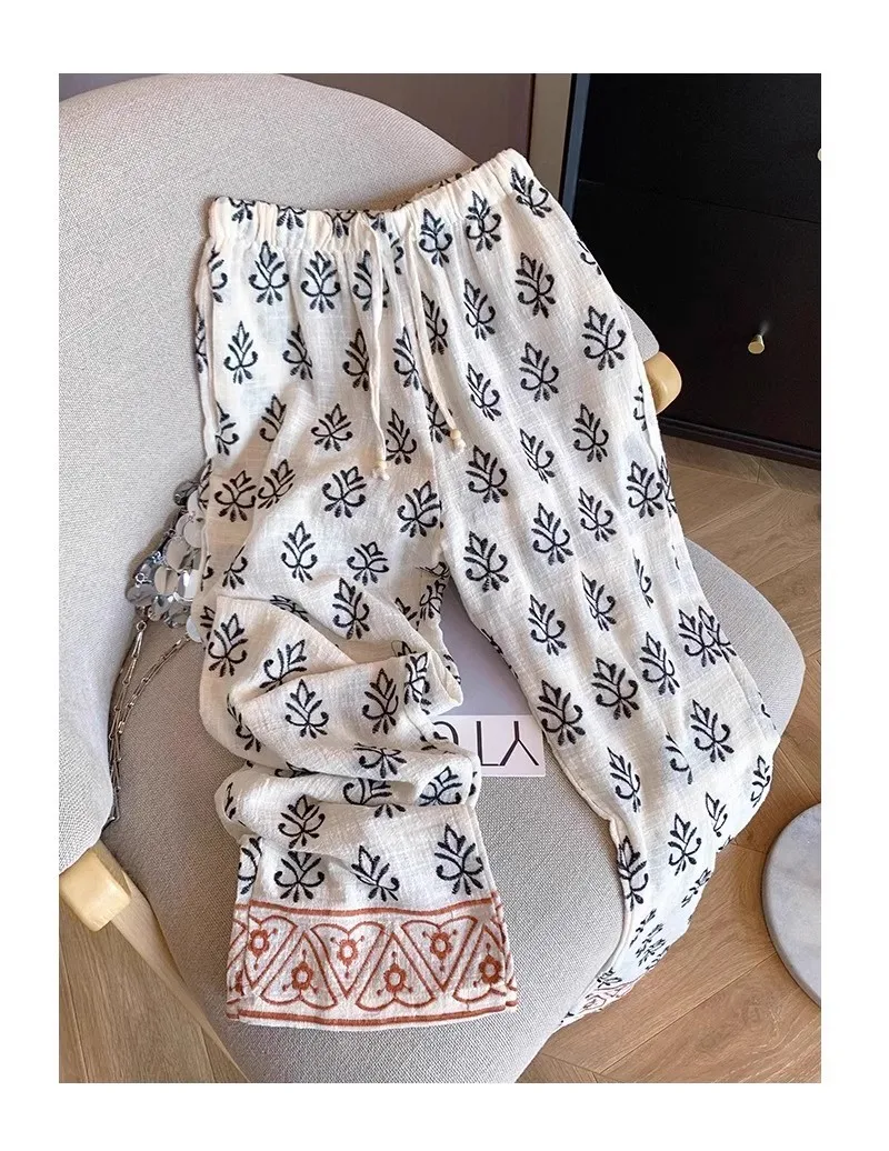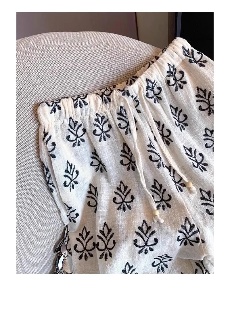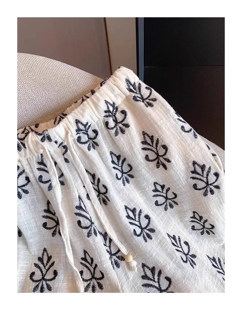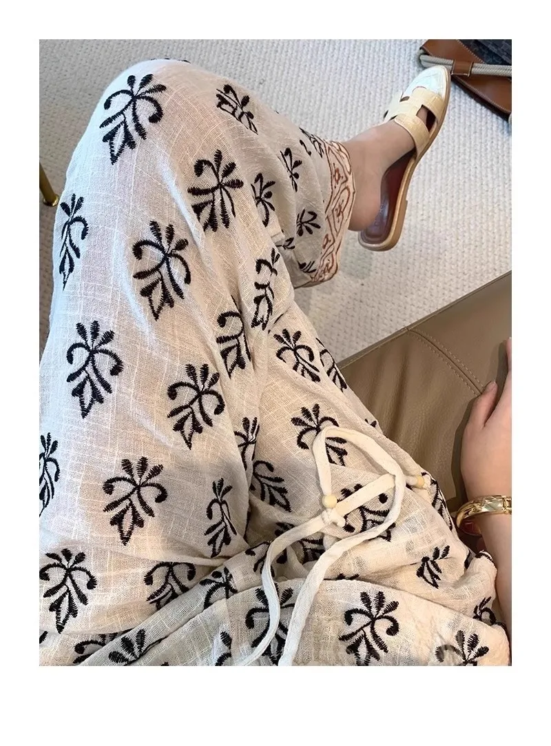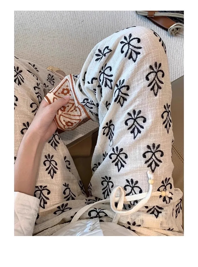 Cyflymder Ethnic Floral Embroidery Wide Leg Pants for Women Casual High Waist Linen Cotton Pant Summer Boho Beach Trousers