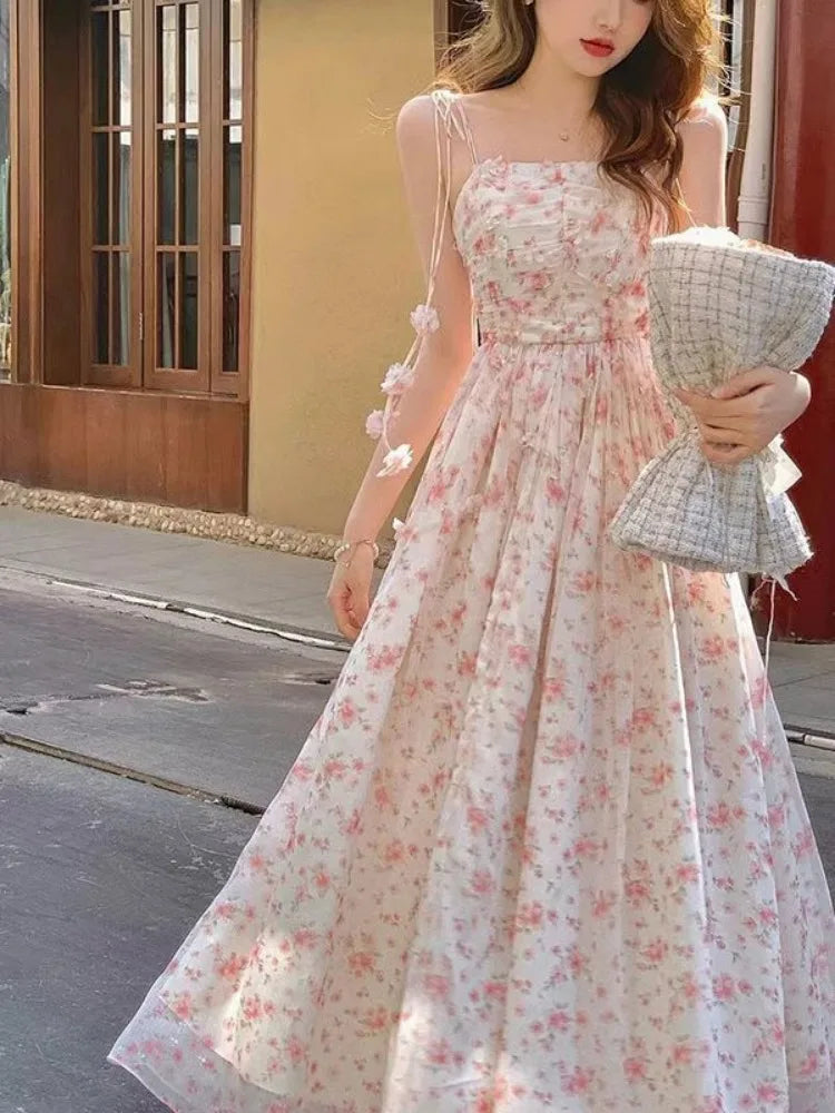 Cyflymder Fairy Sling Dress Women Summer Floral Sleeveless Backless Slim Waist A-line Party Dresses Elegant Sweet Beach Vestidos