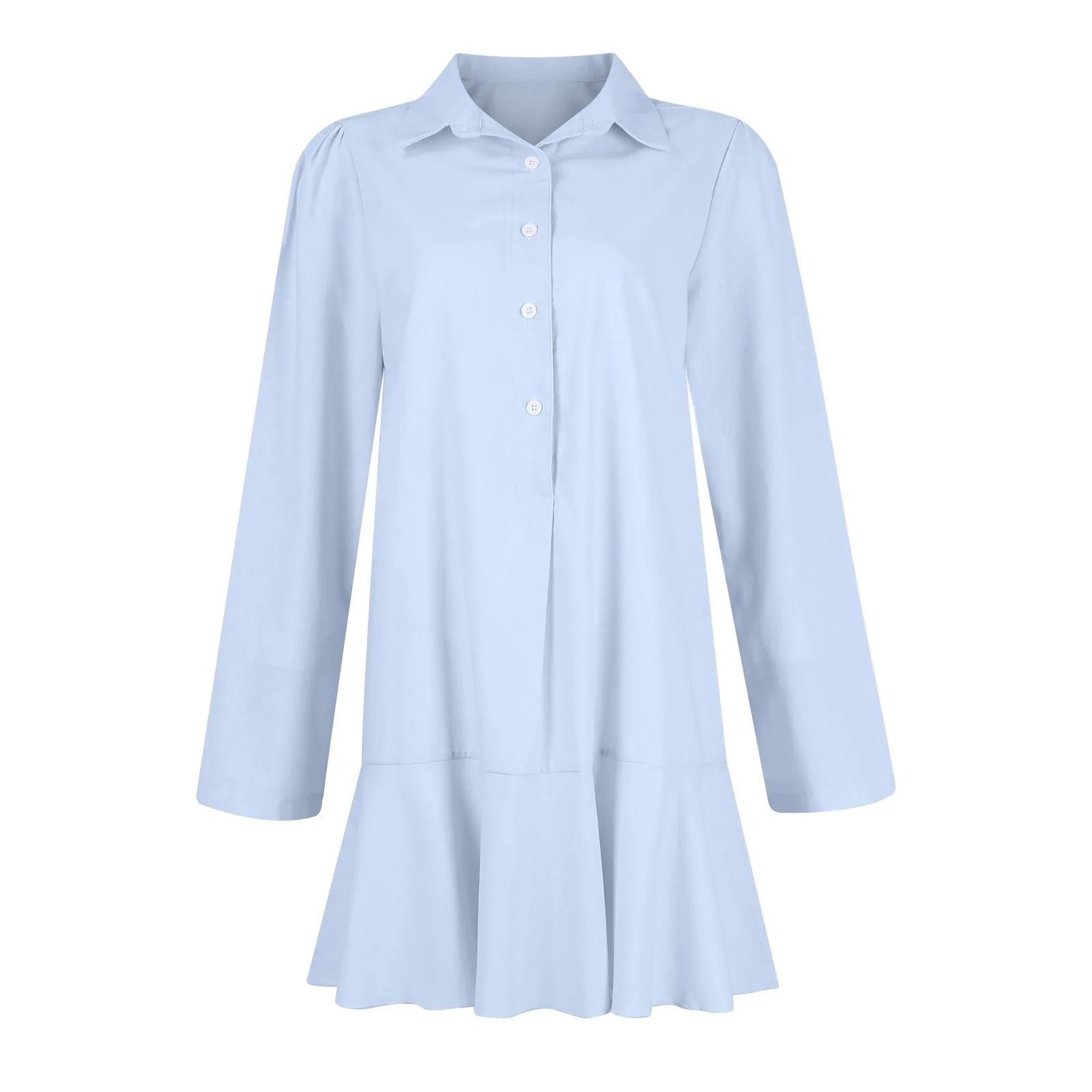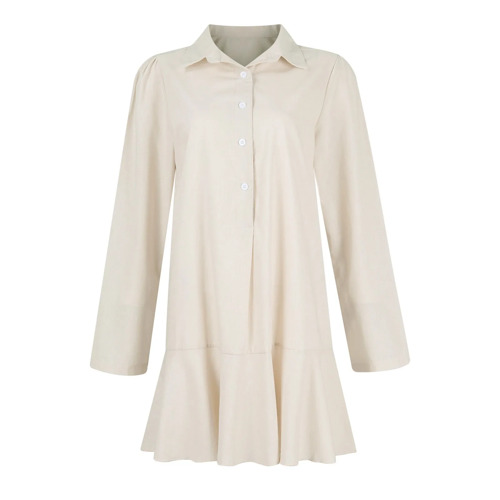 Cyflymder Fashion Casual Commute Half Open Shirt Hem Ruffle Classic Solid Color 3/4 Sleeve Turn-down Collar Knee Length Dress For Ladies