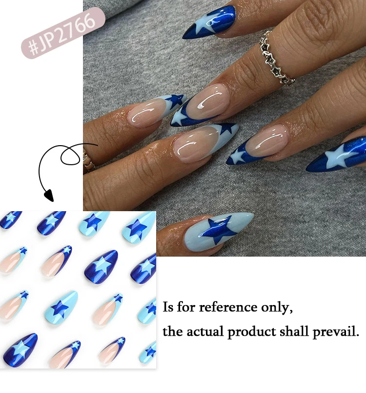 Cyflymder Fashion Cool Light Blue Stars Deep Blue Glitter Almond Shape Fake Nails Detachable Finished False Nails Press on Nails with Glue