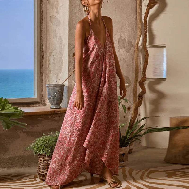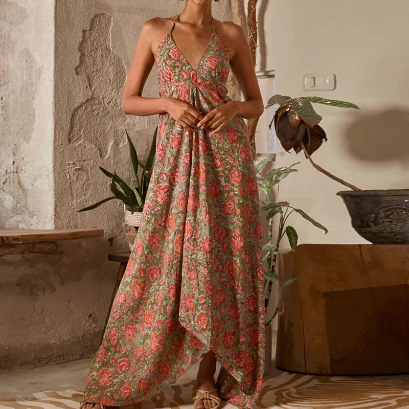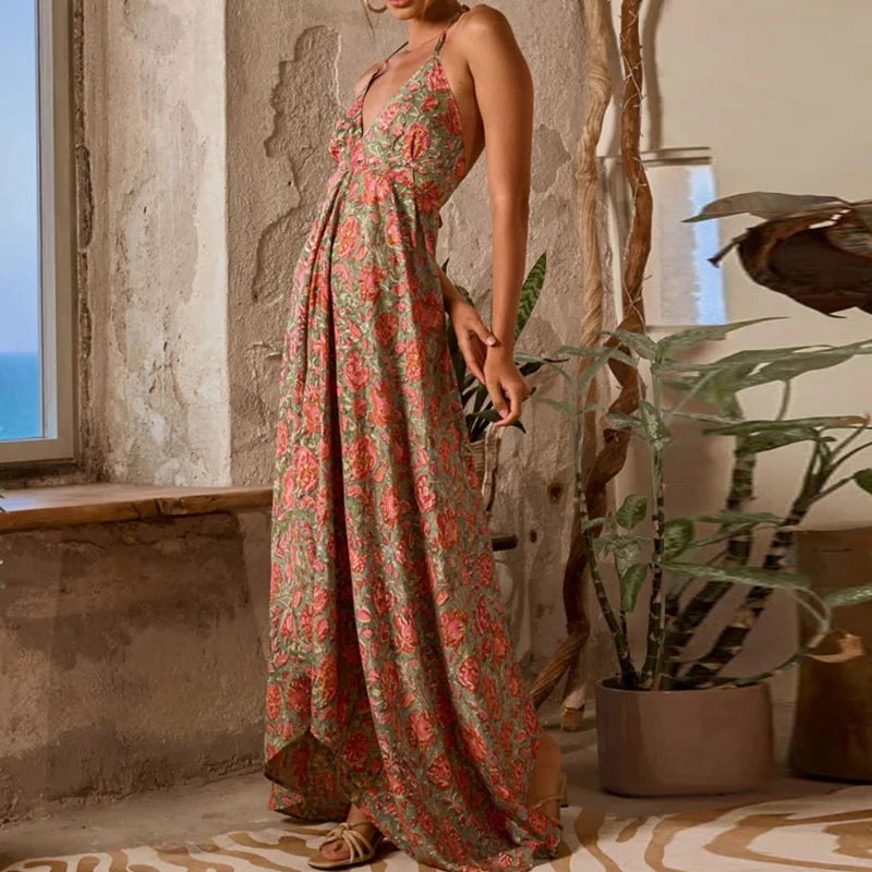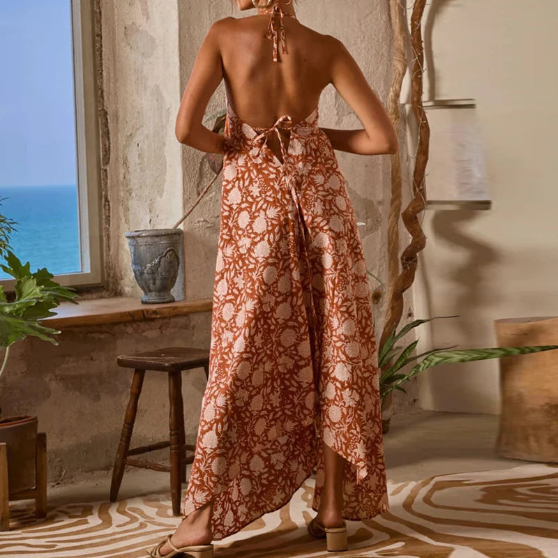 Cyflymder Fashion Hollow Out Backless Party Dress Bohemian Sleeveless Suspender Sexy Dress Vintage Floral Print Halter Women's Long Dress