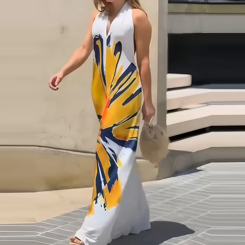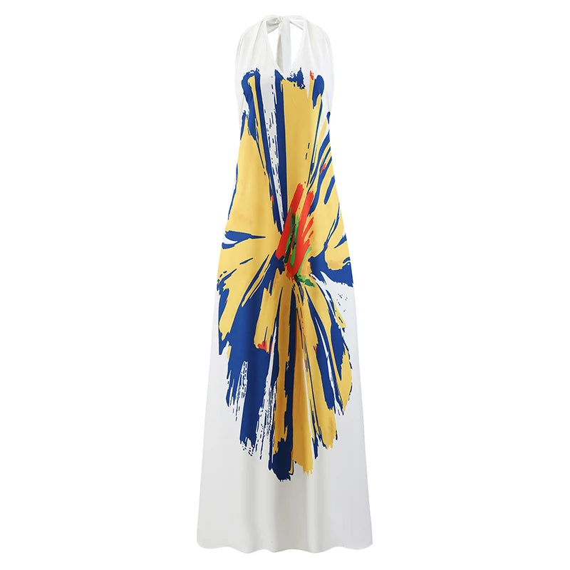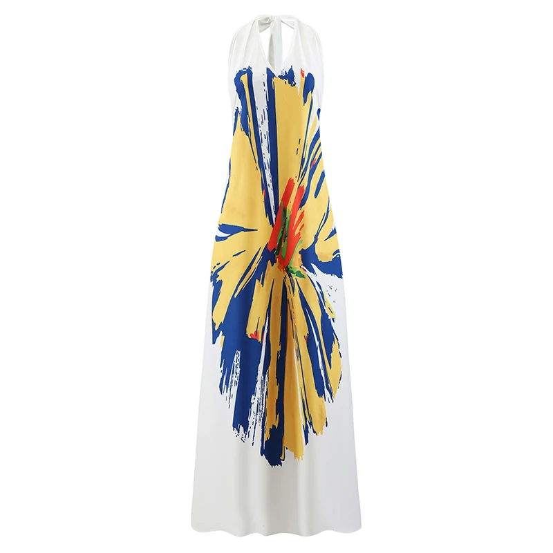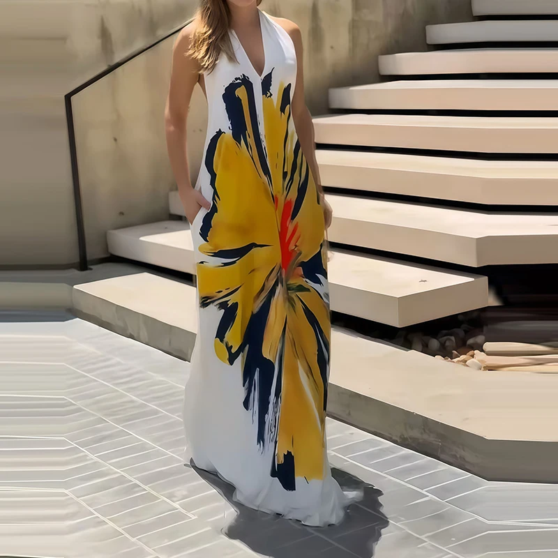 Cyflymder Fashion Sleeveless Holiday Women Dress 2025 Floral Print Sleeveless Loose Long Dress Lady Sexy Halter V Neck Pocket Beach Dress