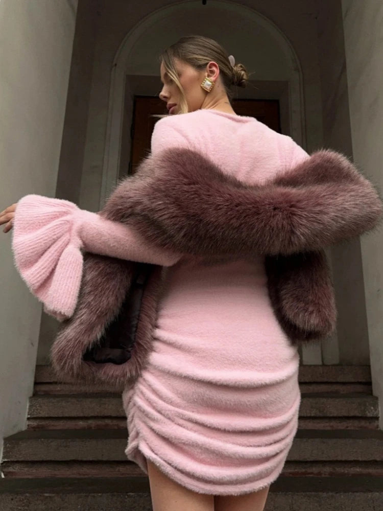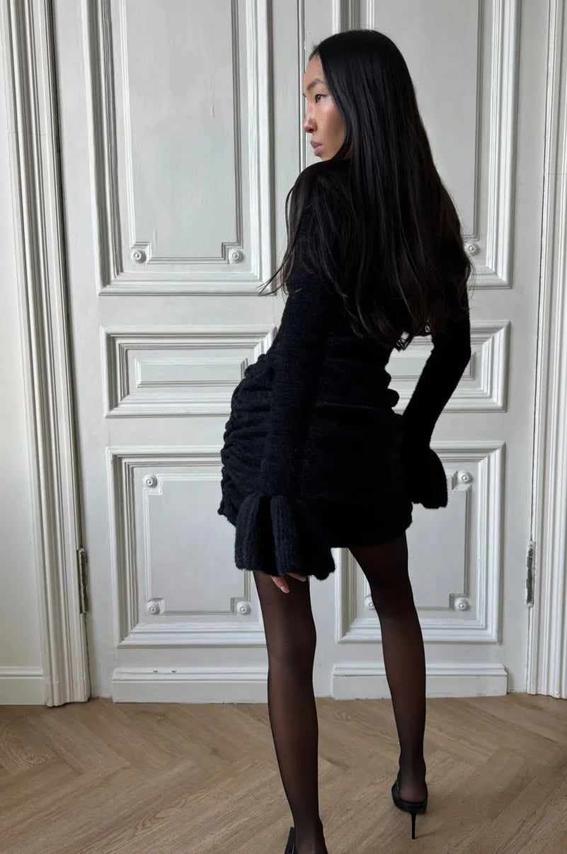 Cyflymder Fashion Solid Knitwear Mini Dress For Women Slim Flare Sleeves High-Waist Pleats Streetwear Female Knitwear Bodycon Dress
