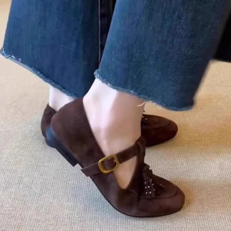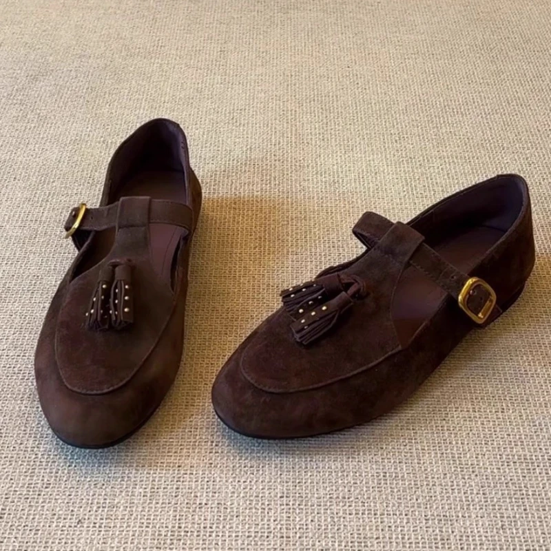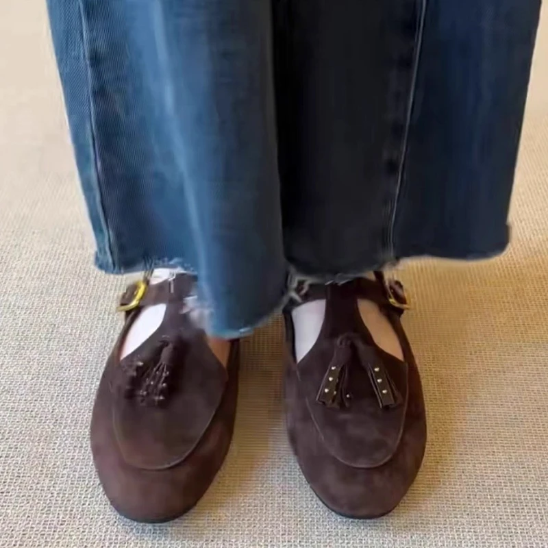 Cyflymder Fashion Tassel T Strap Design Retro Mary Jane Shoes Comfort Round Toe Buckle Flats Shoes for Ladies Lightweight Walking Loafers