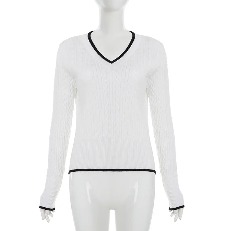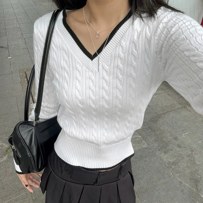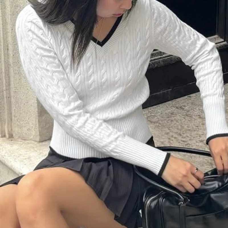 Cyflymder Fashion Vintage Preppy V Neck Long Sleeve Pullovers Y2k Knitted Slim Waist All Match High Street Women Sweaters Harajuku Jumpers
