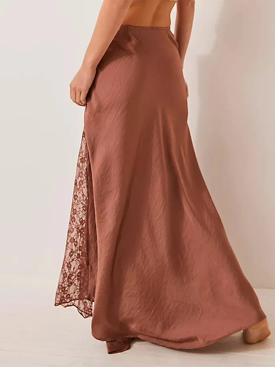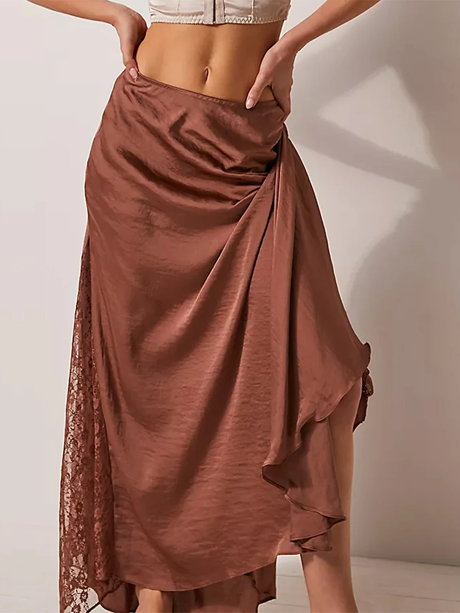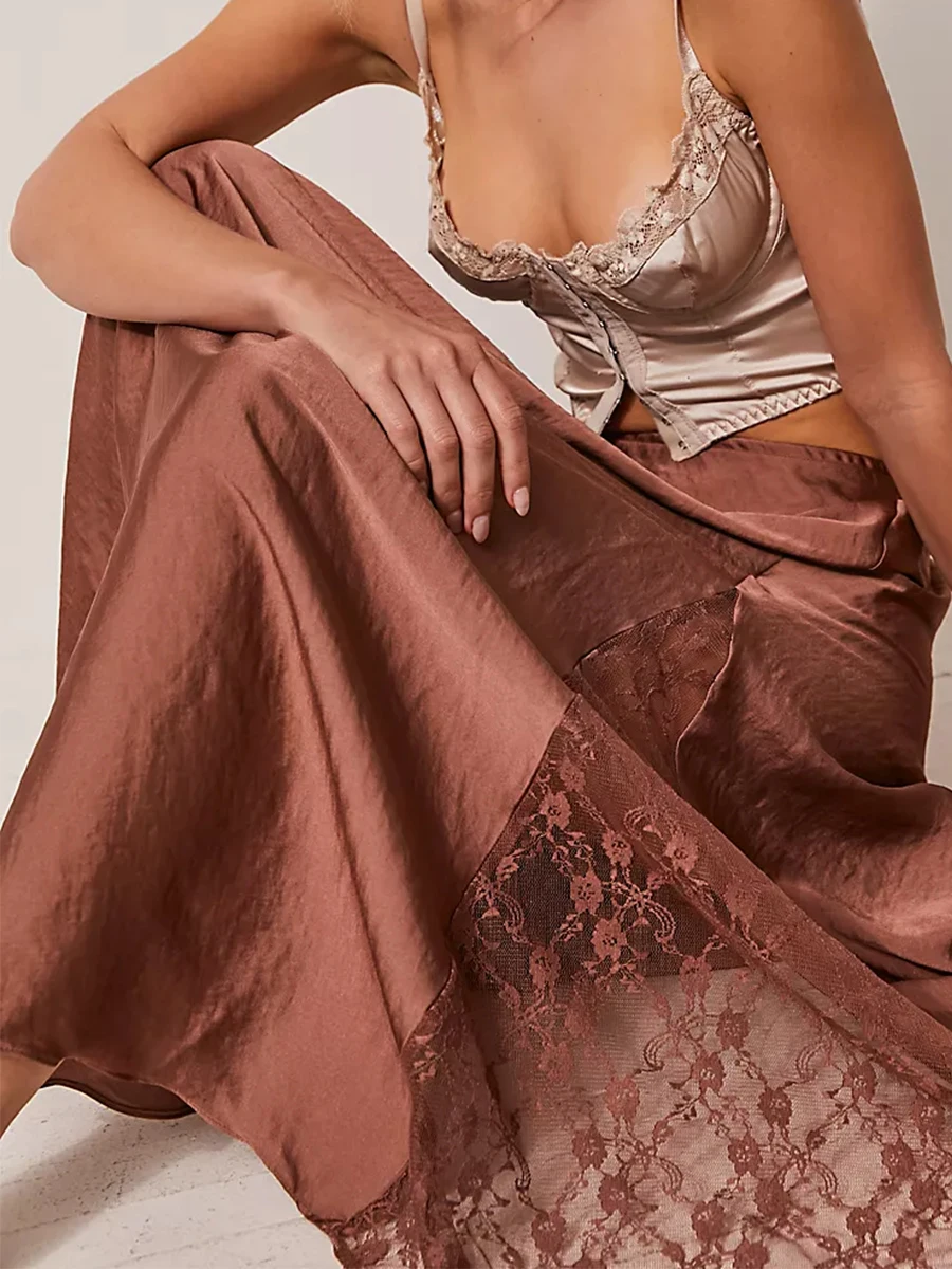 Cyflymder Fashion Women's Midi Skirt Low Waist Patchwork Lace Satin Skirt with Lace Flower Y2K Vintage Skirt for Summer Hoiday