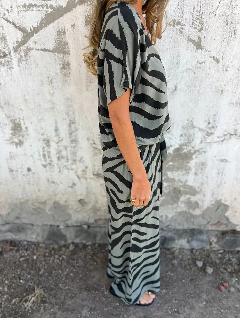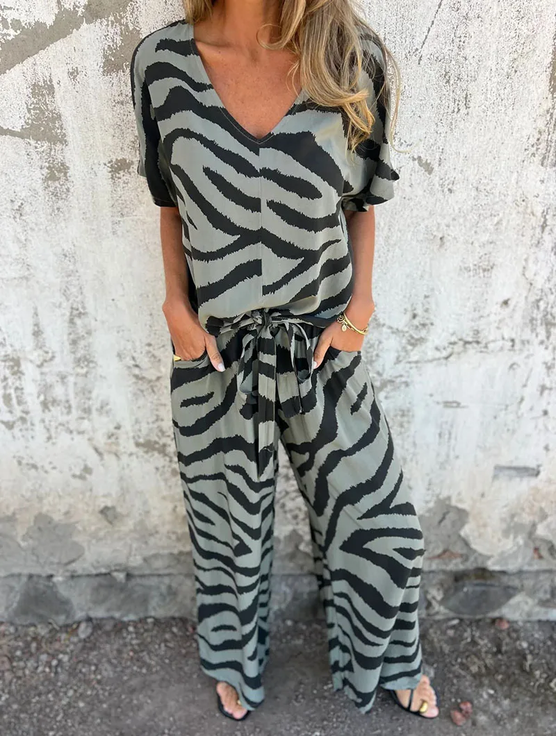Cyflymder Fashion Zebra Print 2 Piece Sets Women Summer Holiday Beachwear Short Sleeve V-Neck Top with Pockets Wide Leg Pants