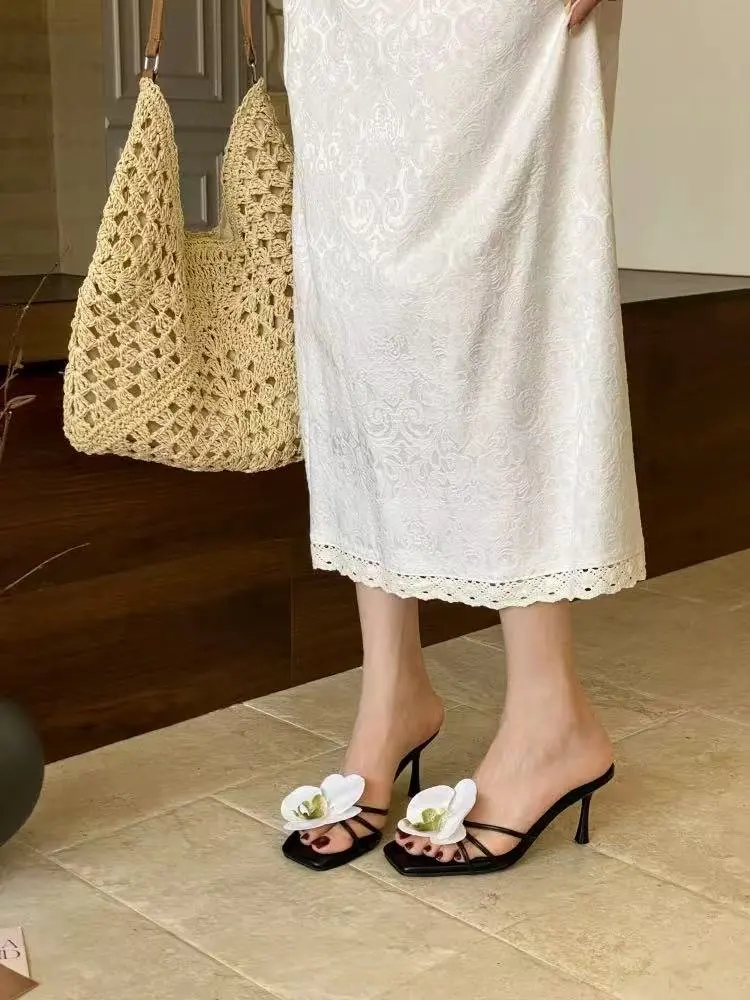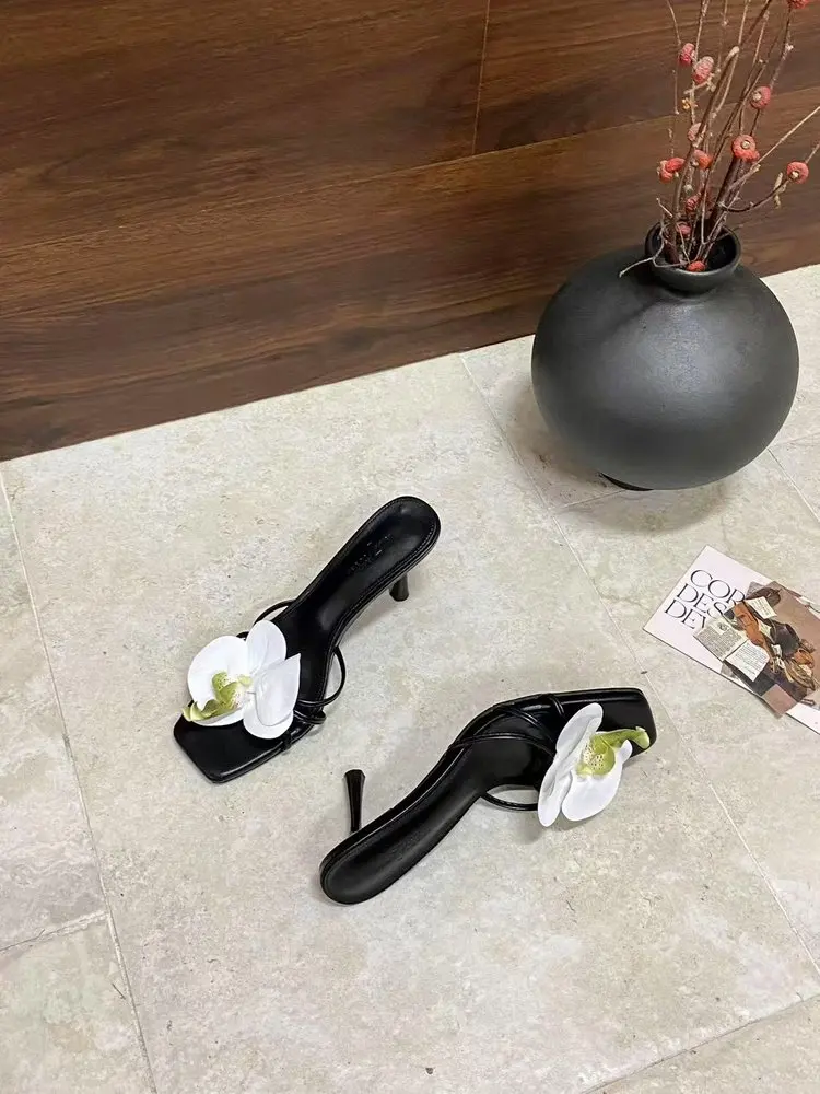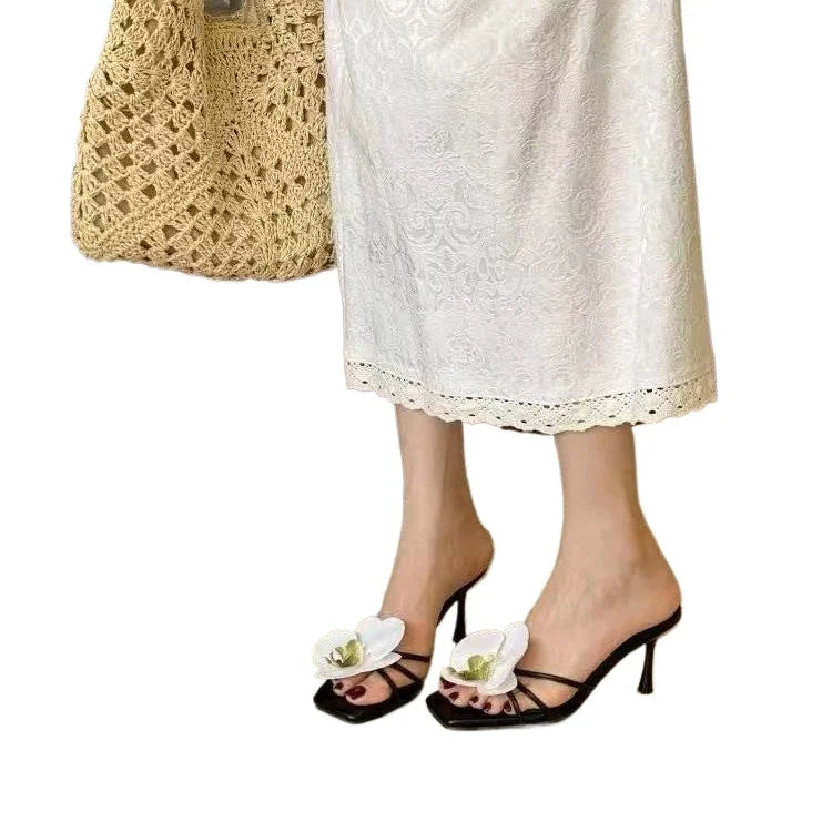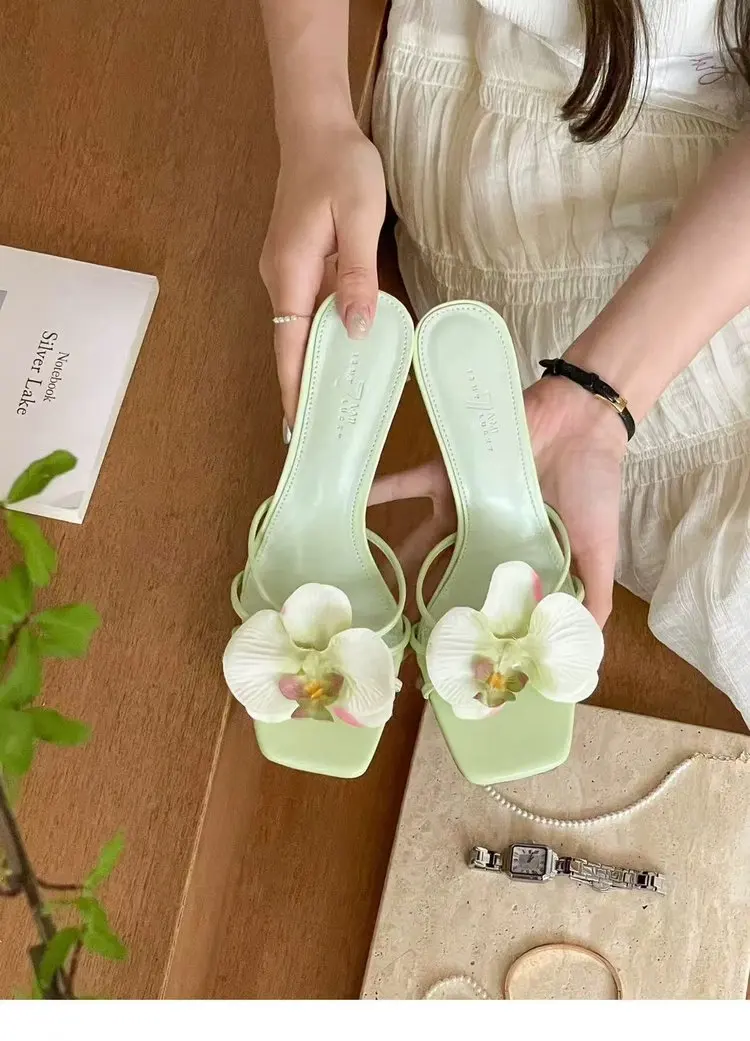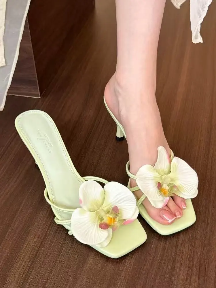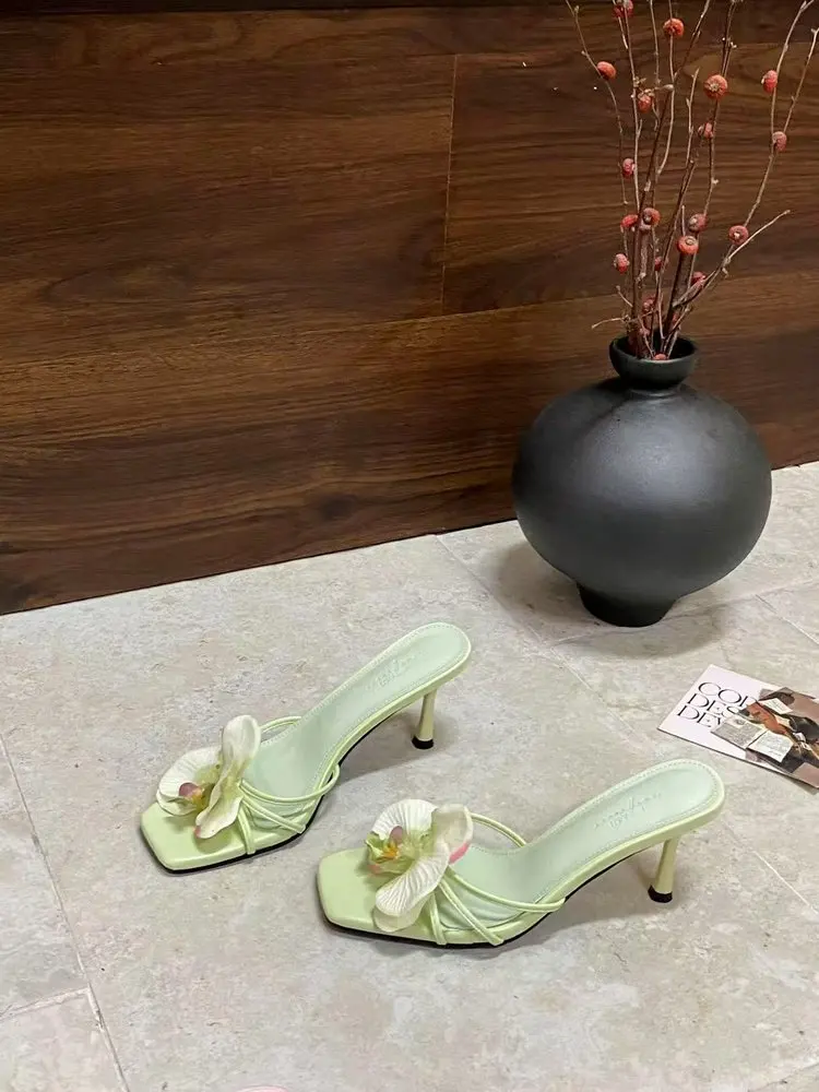 Cyflymder Female Slip On Footwear Square Toe Ladies High Heels Pumps Slides Shoes Luxury Fashion Flower Women Thin Heels Shoes 2025 New