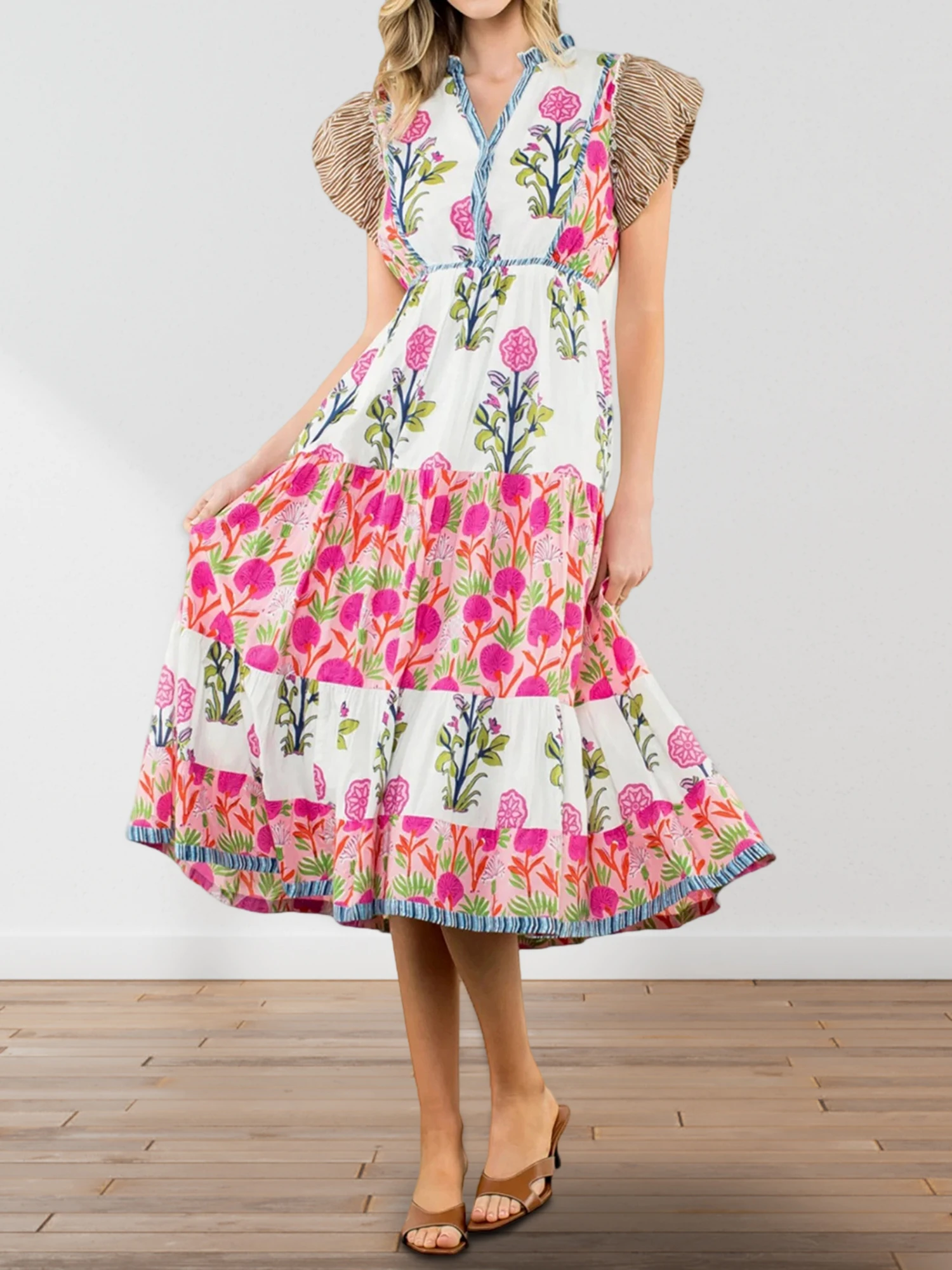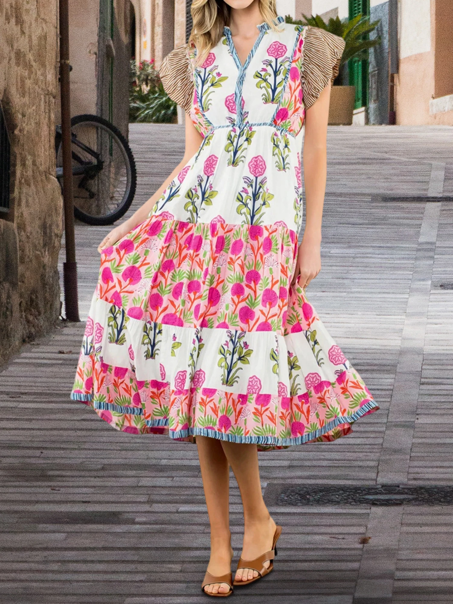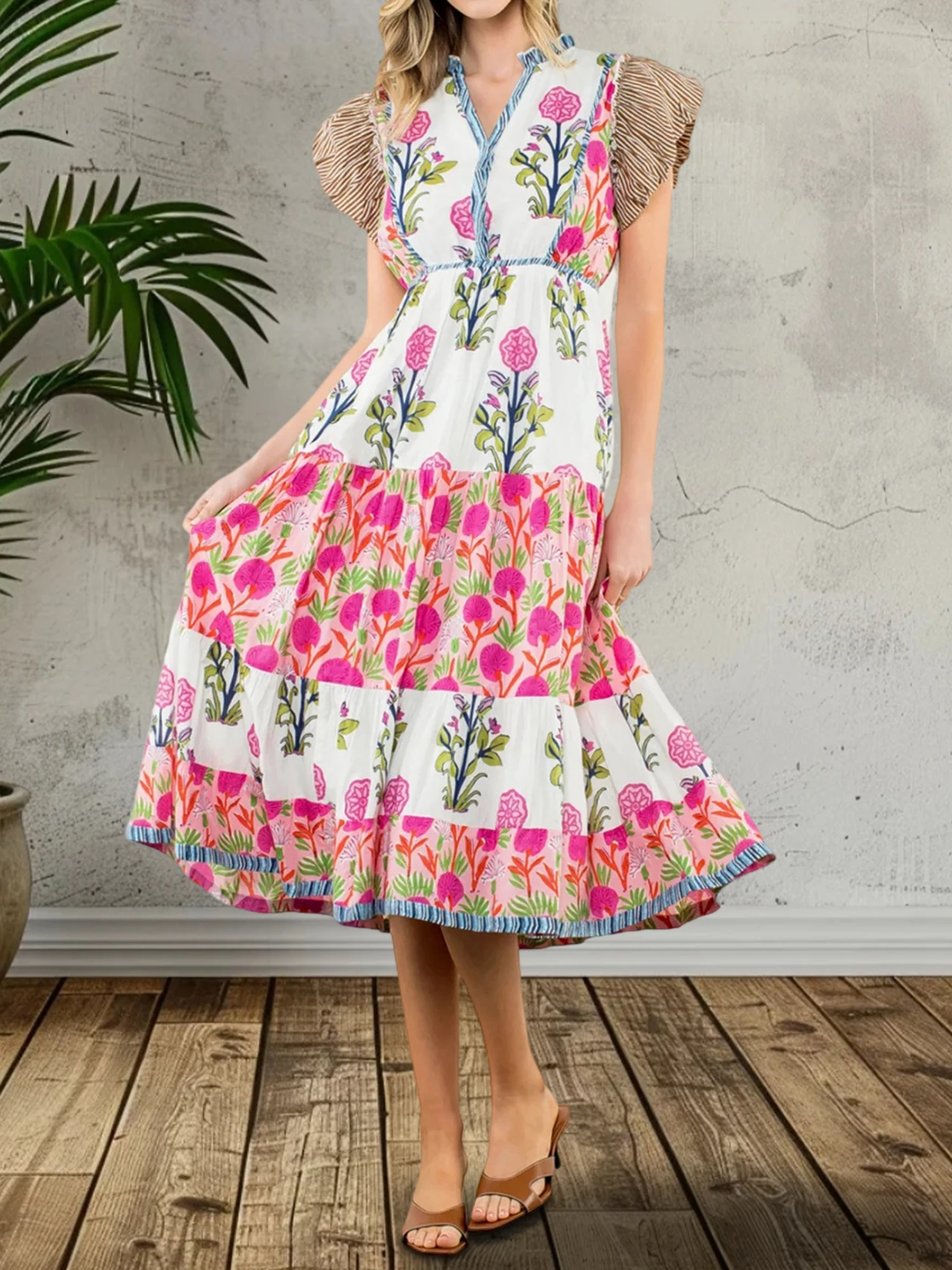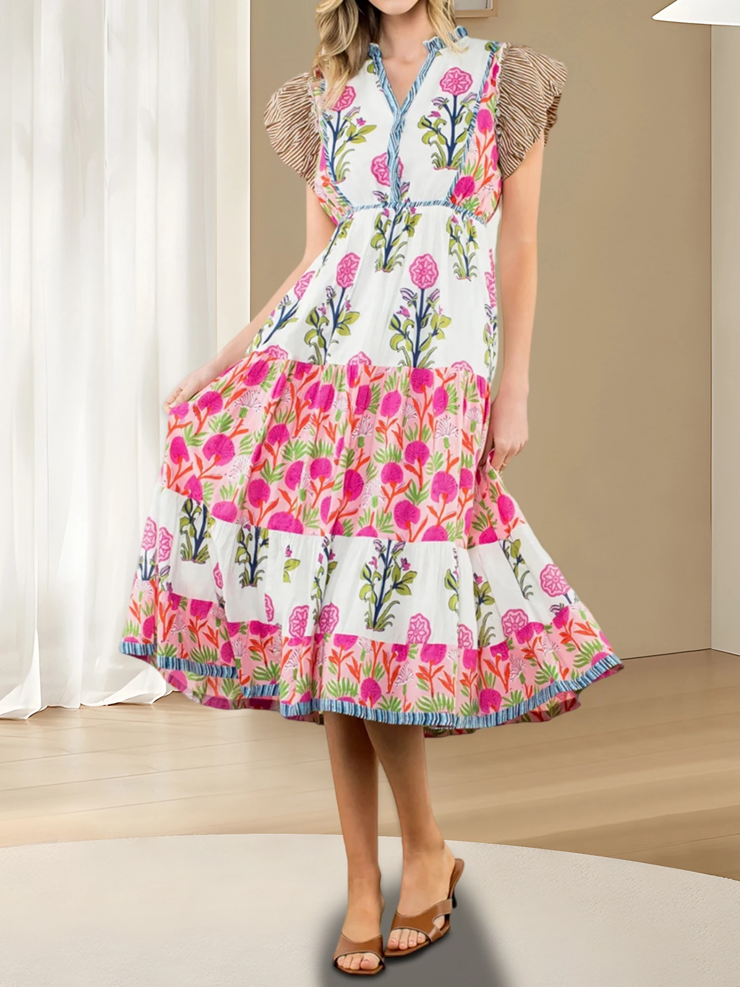 Cyflymder Floral Print Long Dress y2k Women's V Neck Flying Sleeve Flowy A Line Dress Vacation Beach Party Dresses Streetwear
