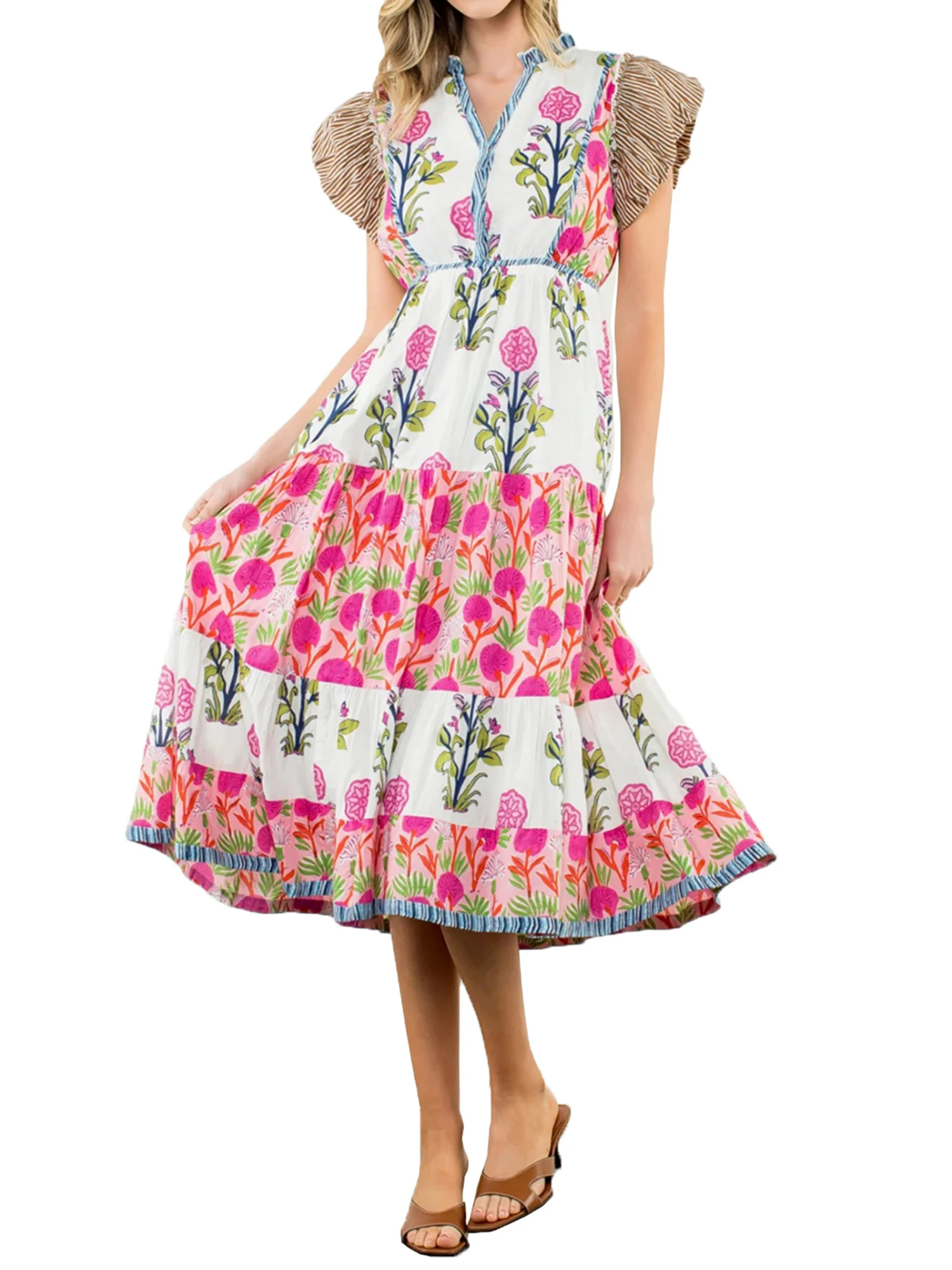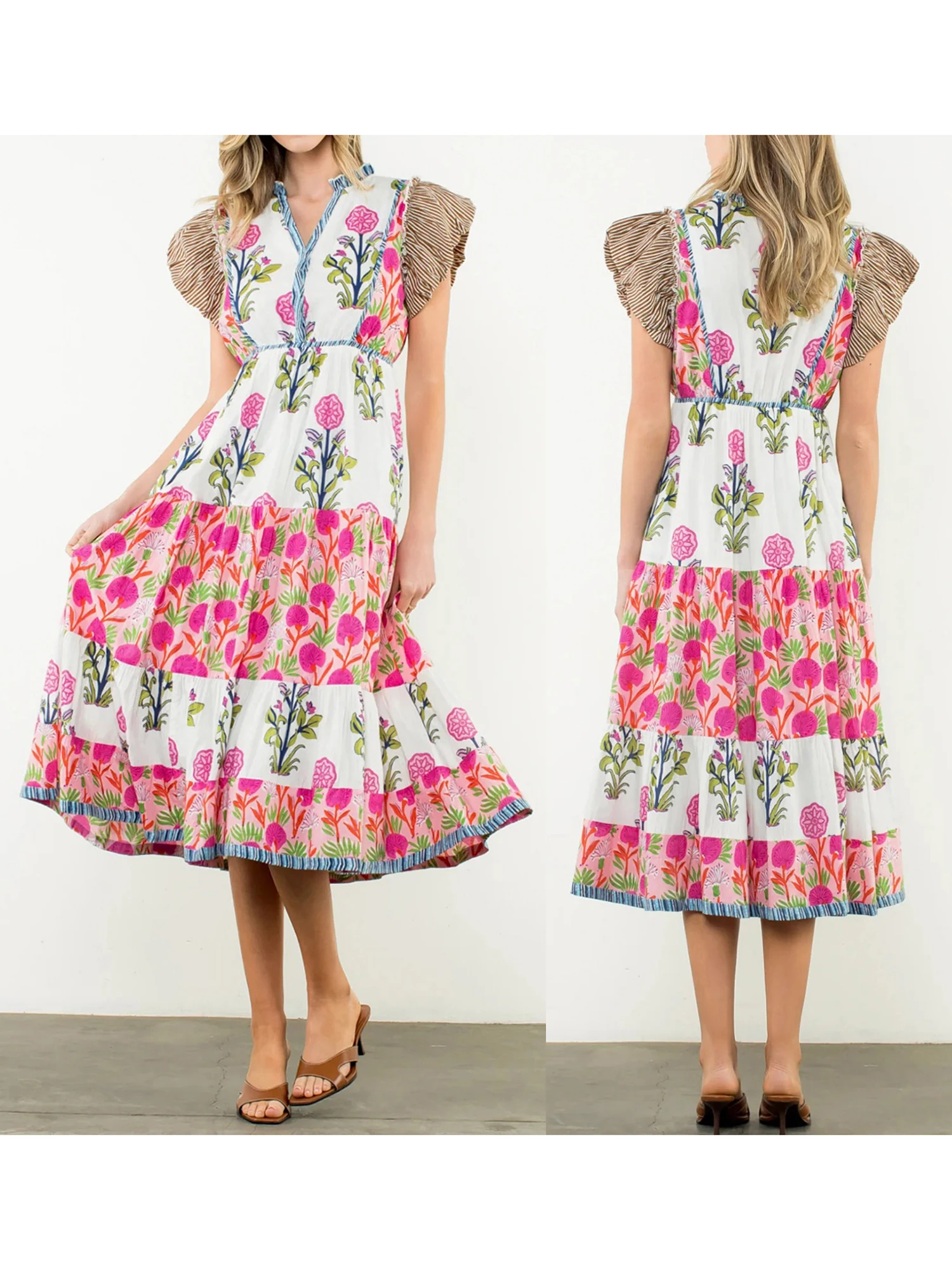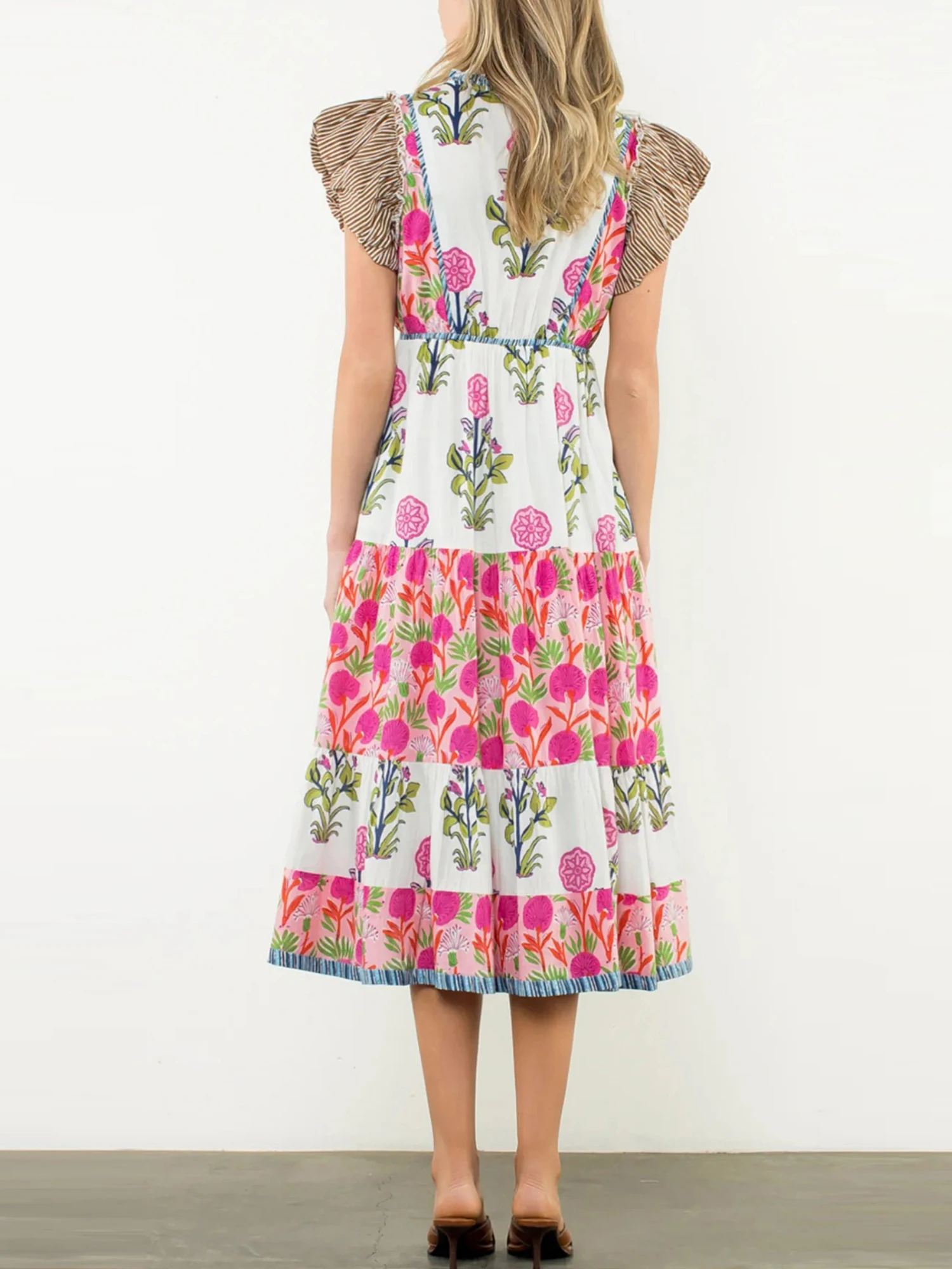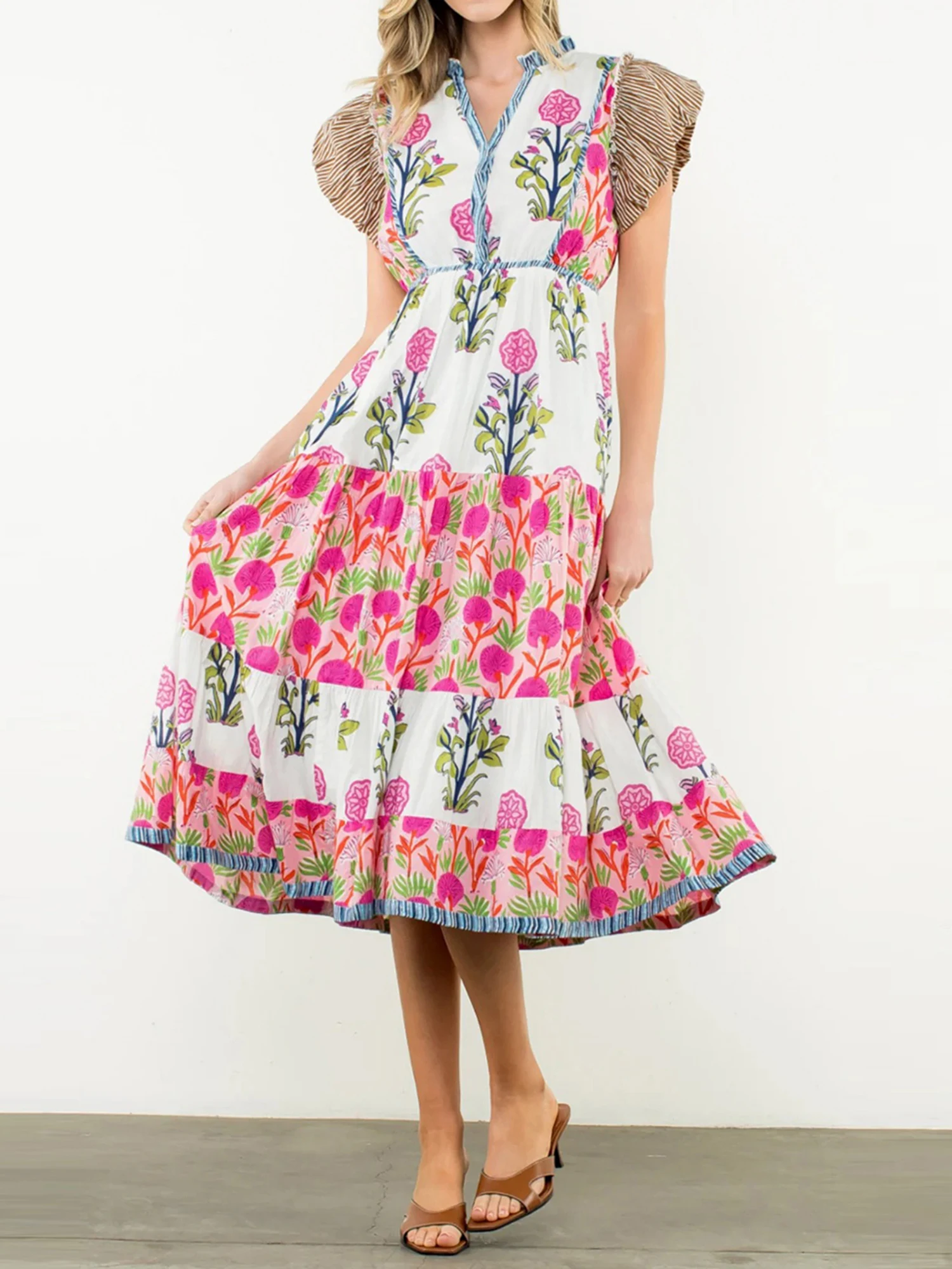Cyflymder Floral Print Long Dress y2k Women's V Neck Flying Sleeve Flowy A Line Dress Vacation Beach Party Dresses Streetwear