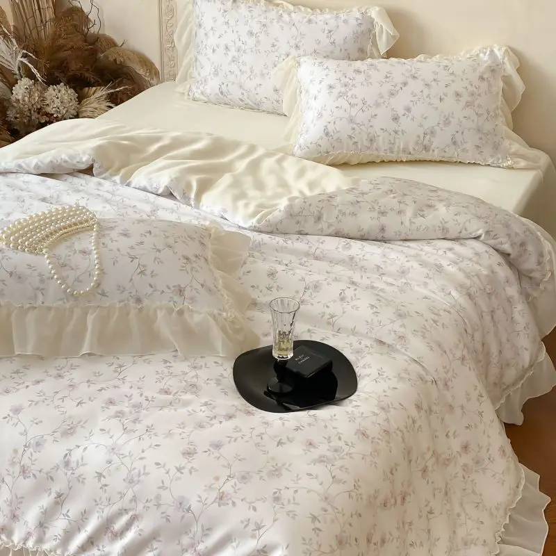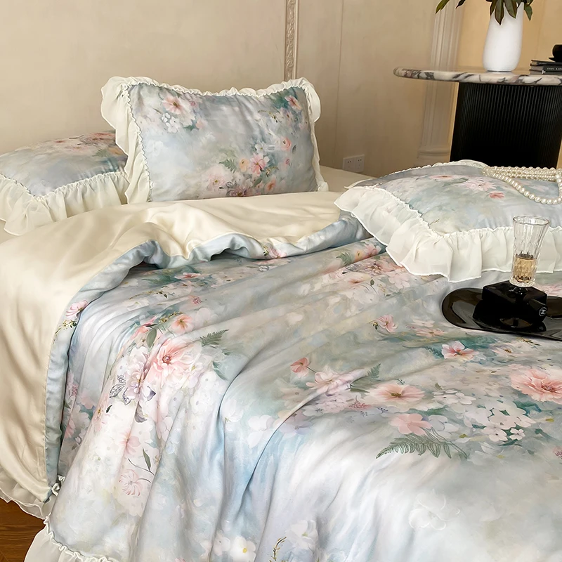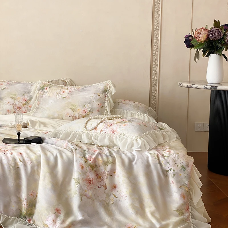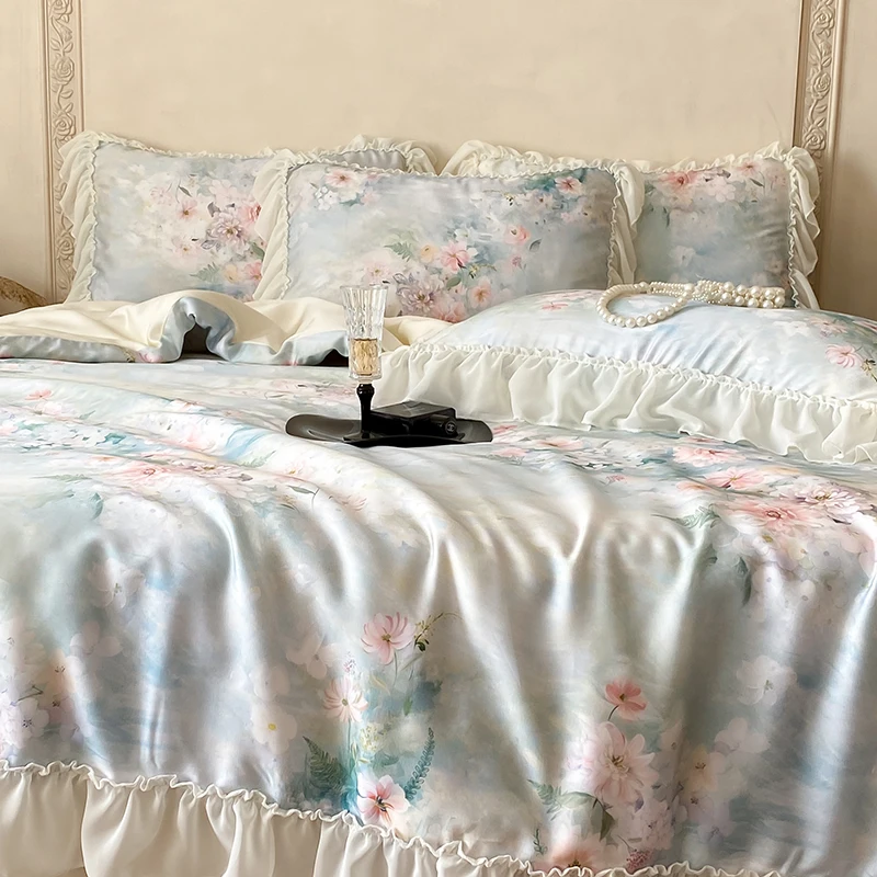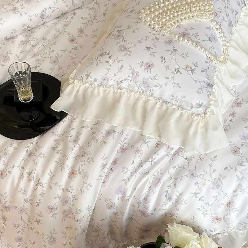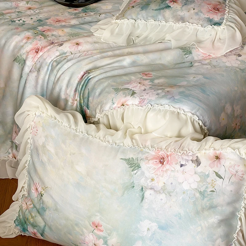 Cyflymder Flower Prints Lace Ruffles Princess Bedding Set Lyocell Bamboo Fiber Soft Silky Cool Feeling Duvet Cover Bed Sheet Pillowcases