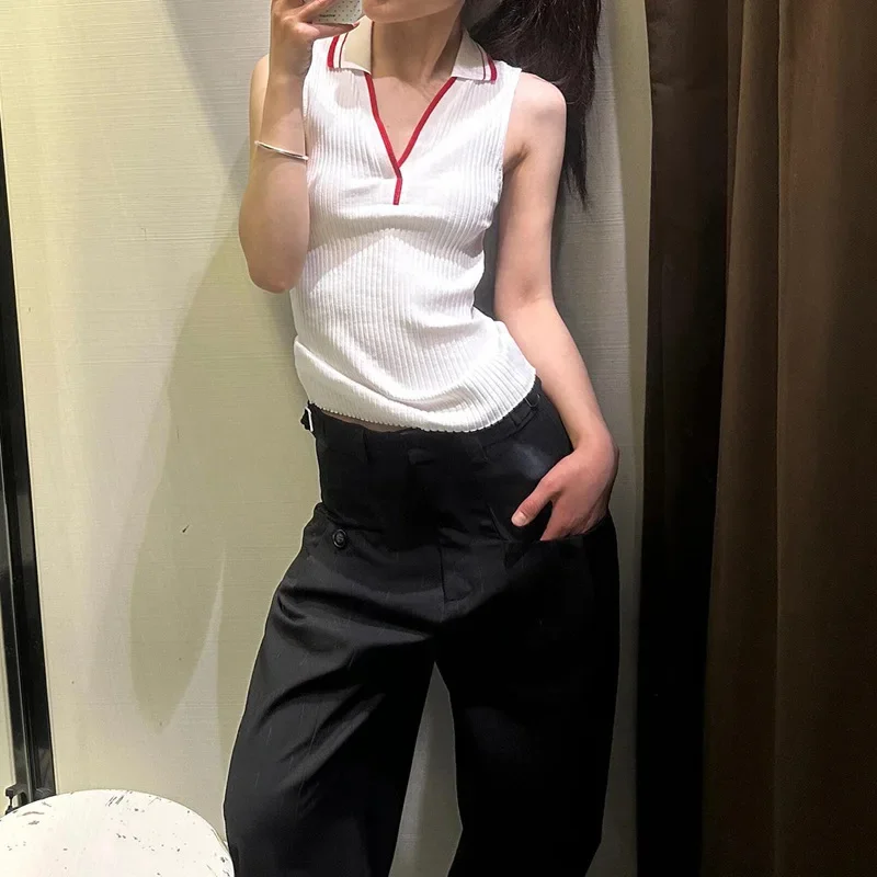 Cyflymder French American Retro Knitted Sleeveless Neck Hanging Vest Women Summer New Color Collision Outerwear Top Polyester Blend