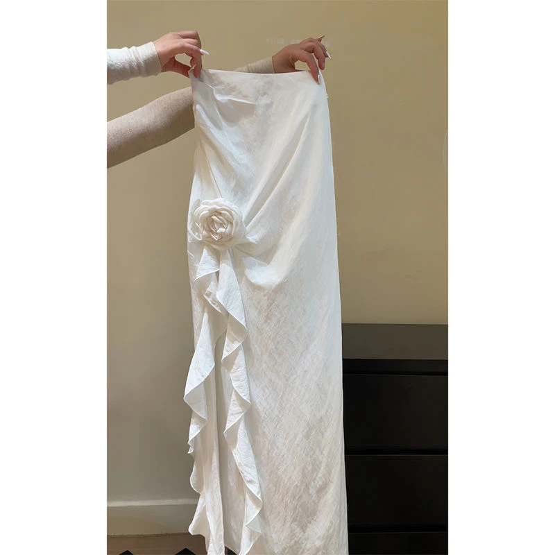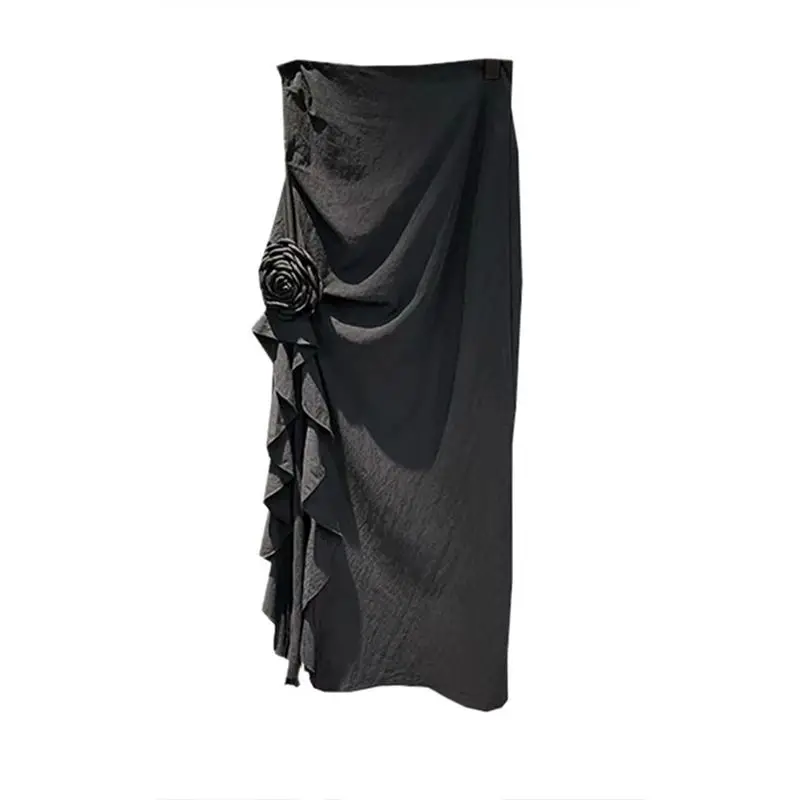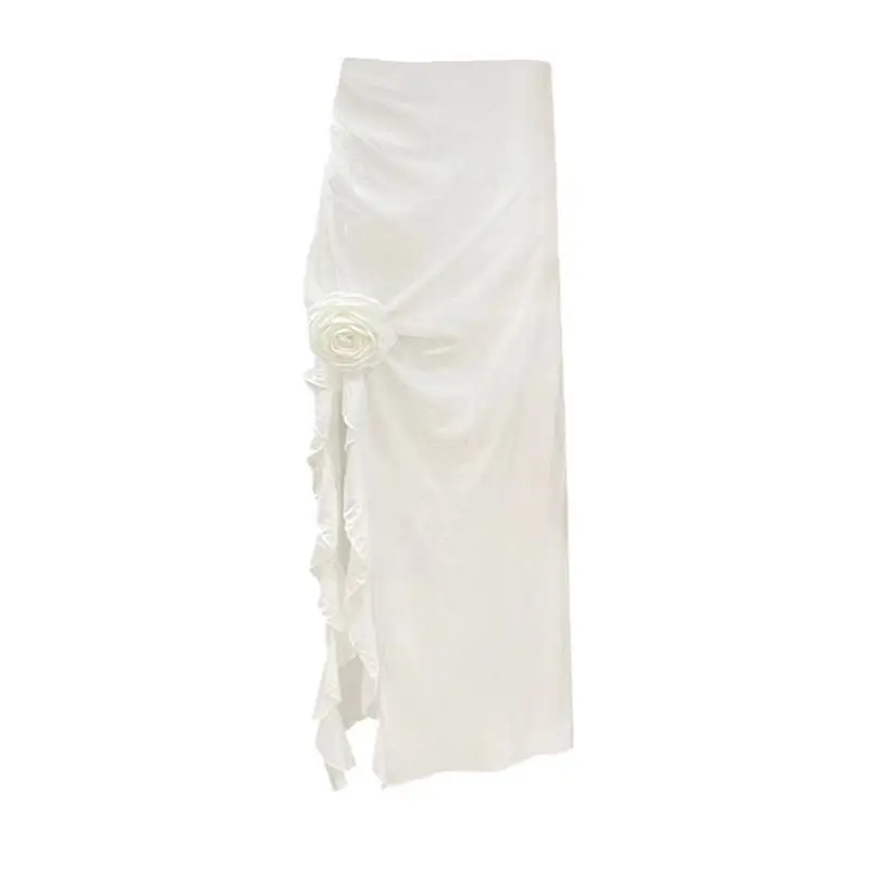 Cyflymder French High Street High Waist Long Skirts All Match New Summer Solid Side Split Ruffle Punk Girl Jupe Y2k Flower Appliques Skirt