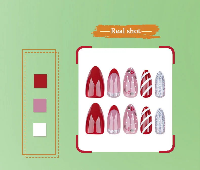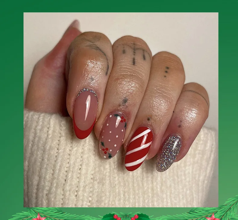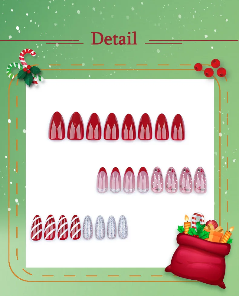 Cyflymder French Red Candy Stripe Silver Glitter Powder Christmas Fake Nails Detachable Finished False Nails Press on Nails with Glue