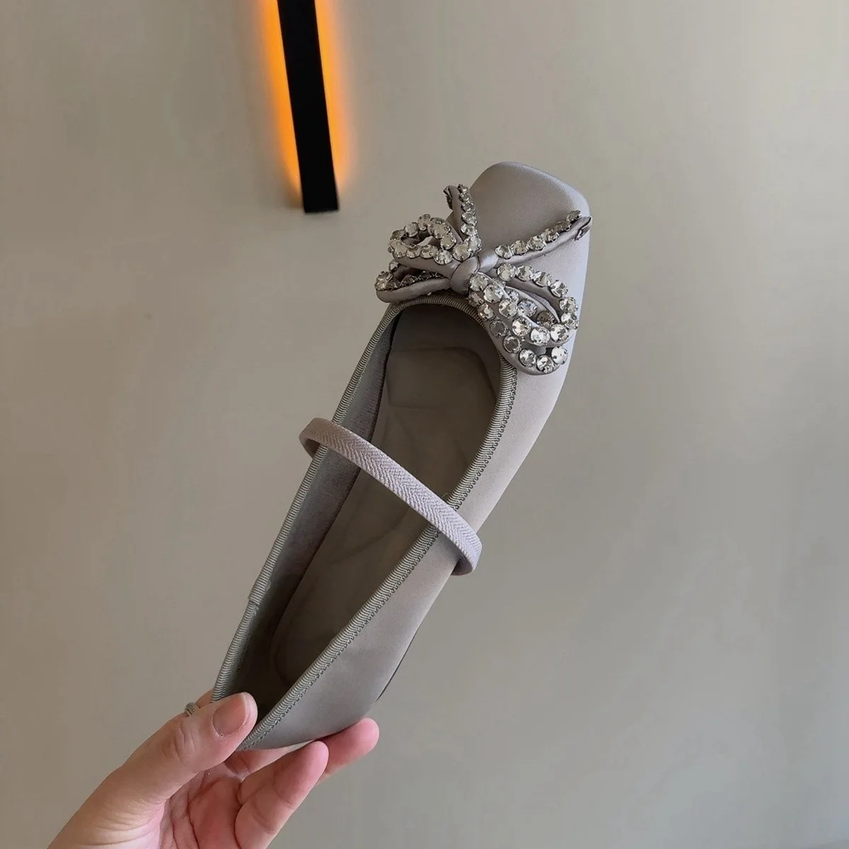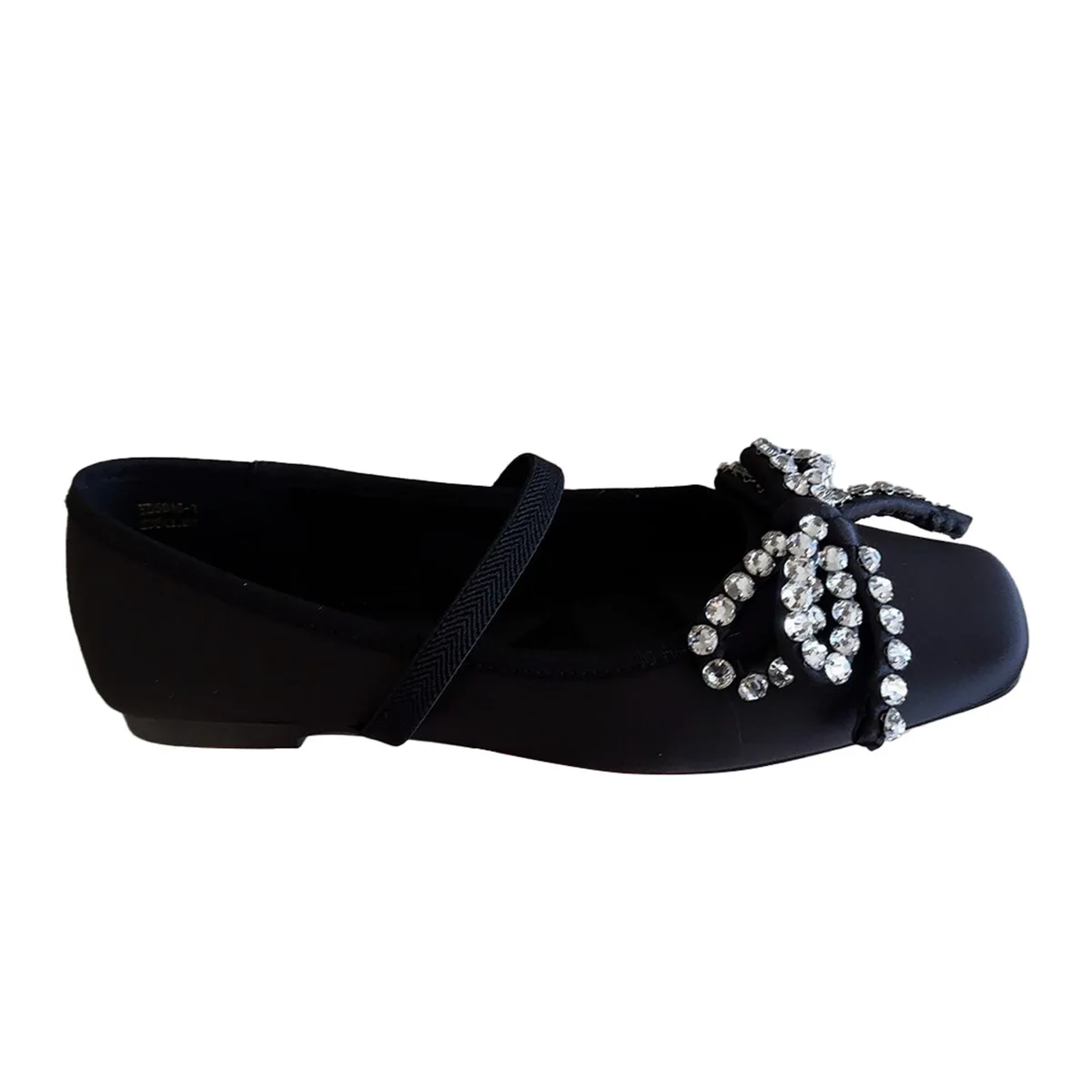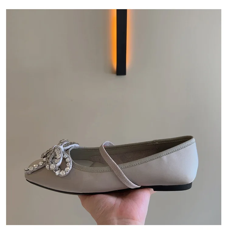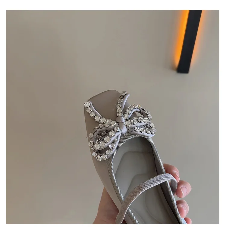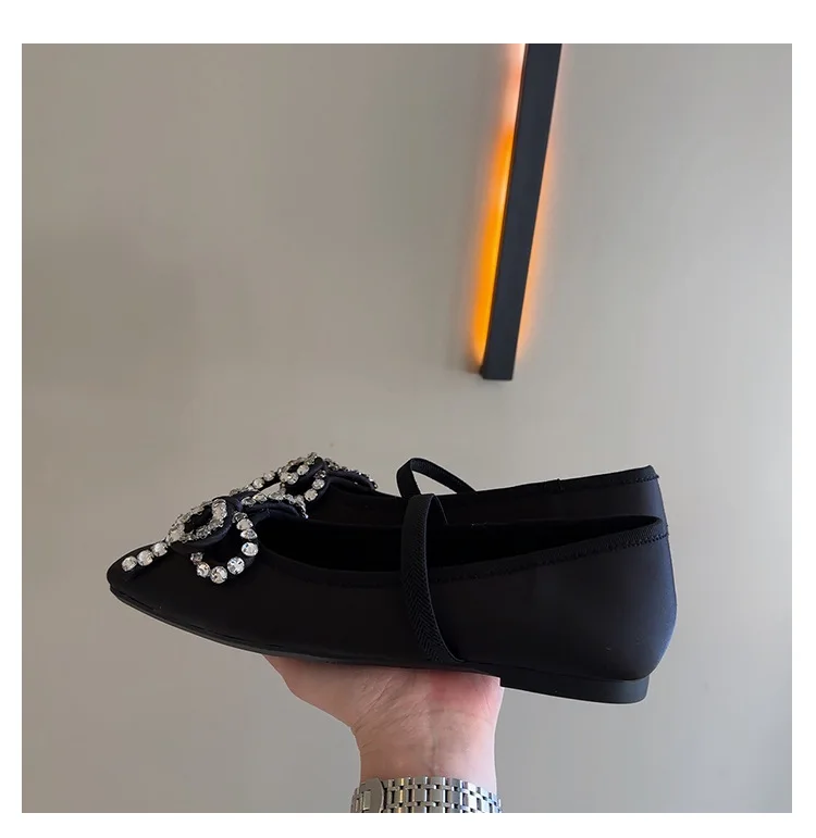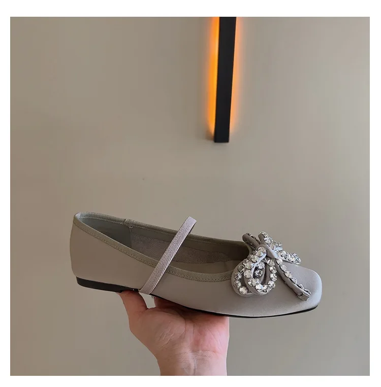 Cyflymder French Rhinestone Bow Square Head Satin Single Shoes Women's 2025 New Versatile One-word Belt Ballet Shoes